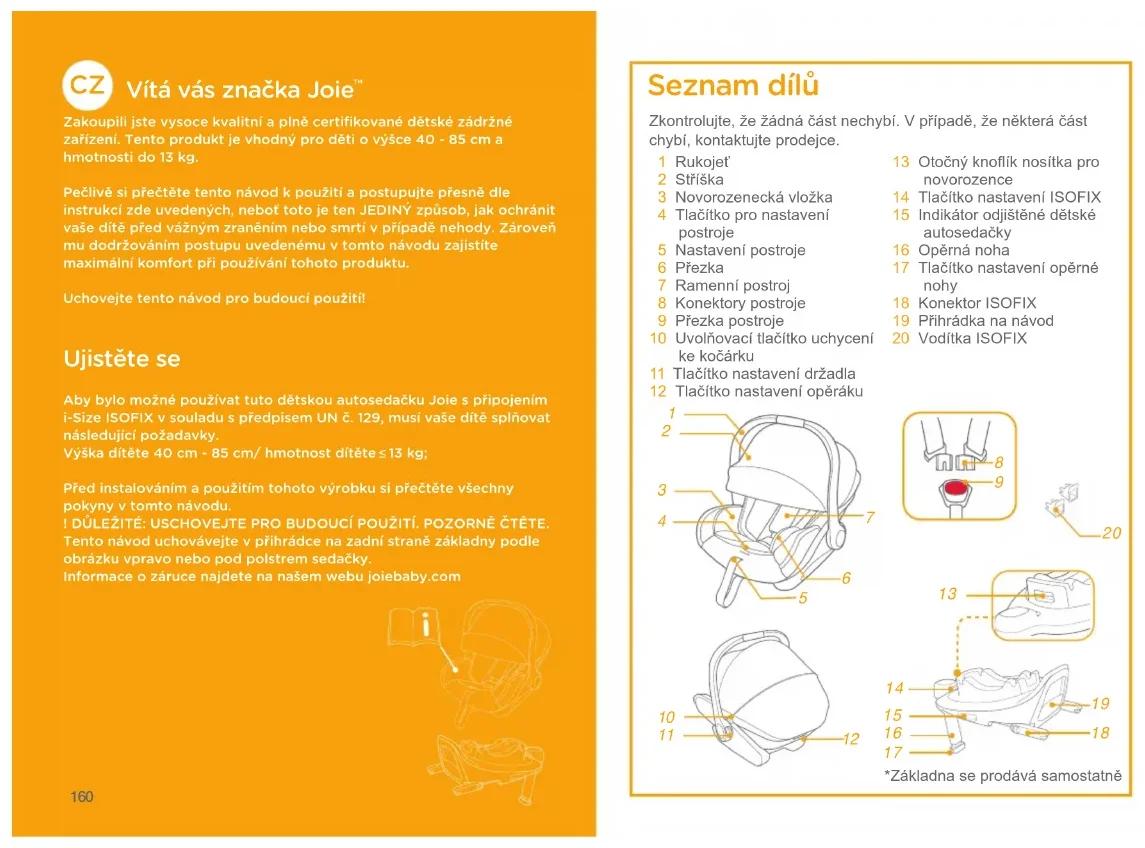 Zakoupili jste vysoce kvalitní a plně certifikované dětské zádržné zařízení. Tento produkt je vhodný pro děti o výšce 40 - 85 cm a hmotnosti do 13 kg.Pečlivě si přečtěte tento návod k použití a postupujte přesně dle instrukcí zde uvedených﹐ neboť toto je ten JEDINÝ způsob﹐ jak ochránit vaše dítě před vážným zraněním nebo smrtí v případě nehody. Zároveň mu dodržováním postupu uvedenému v tomto návodu zajistíte maximální komfort při používání tohoto produktu.Uchovejte tento návod pro budoucí použití! Ujistěte se Aby bylo možné používat tuto dětskou autosedačku Joie s připojením i-Size ISOFIX v souladu s předpisem UN č. 129﹐ musí vaše dítě splňovat následující požadavky.Výška dítěte 40 cm - 85 cm/ hmotnost dítěte 13 kg;Před instalováním a použitím tohoto výrobku si přečtěte všechny pokyny v tomto návodu.! DŮLEŽITÉ: USCHOVEJTE PRO BUDOUCÍ POUŽITÍ. POZORNĚ ČTĚTE.Tento návod uchovávejte v přihrádce na zadní straně základny podle obrázku vpravo nebo pod polstrem sedačky.Informace o záruce najdete na našem webu joiebaby.com Zkontrolujte, že žádná část nechybí. V případě, že některá část chybí, kontaktujte prodejce. 1 Rukojeť 2 Stříška 3 Novorozenecká vložka 4 Tlačítko pro nastavení postroje 5 Nastavení postroje 6 Přezka 7 Ramenní postroj 8 Konektory postroje 9 Přezka postroje 10 Uvolňovací tlačítko uchycení ke kočárku 11 Tlačítko nastavení držadla 12 Tlačítko nastavení opěráku Seznam dílů 13 Otočný knoflík nosítka pro novorozence 14 Tlačítko nastavení ISOFIX 15 Indikátor odjištěné dětské autosedačky 16 Opěrná noha 17 Tlačítko nastavení opěrné nohy 18 Konektor ISOFIX 19 Přihrádka na návod 20 Vodítka ISOFIX *Základna se prodává samostatně