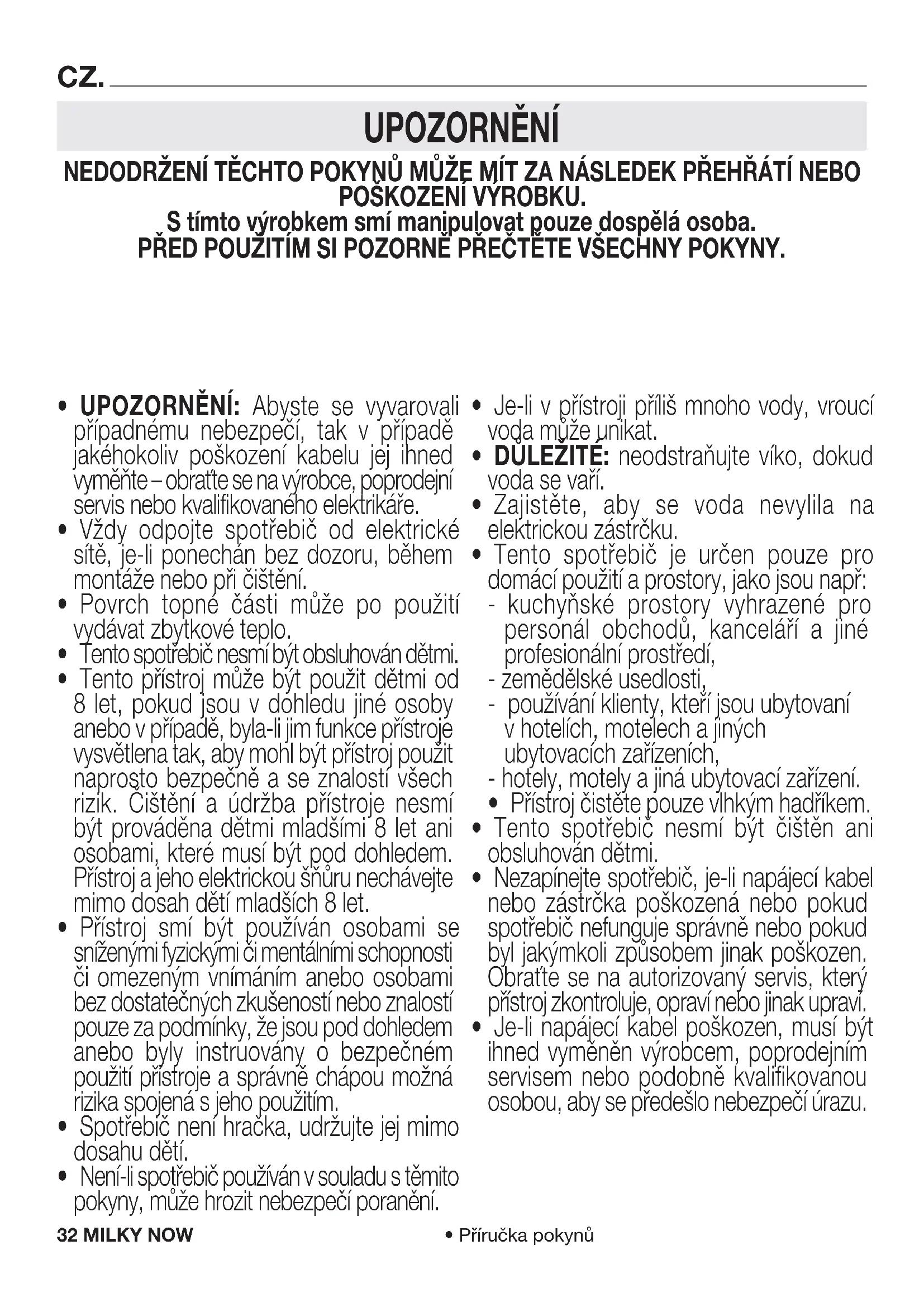 - Je-li napájecí kabel poškozen, musí být ihned vyměněn výrobcem, poprodejním servisem nebo podobně kvalifikovanou osobou, aby se předešlo nebezpečí úrazu.33MILKY NOW