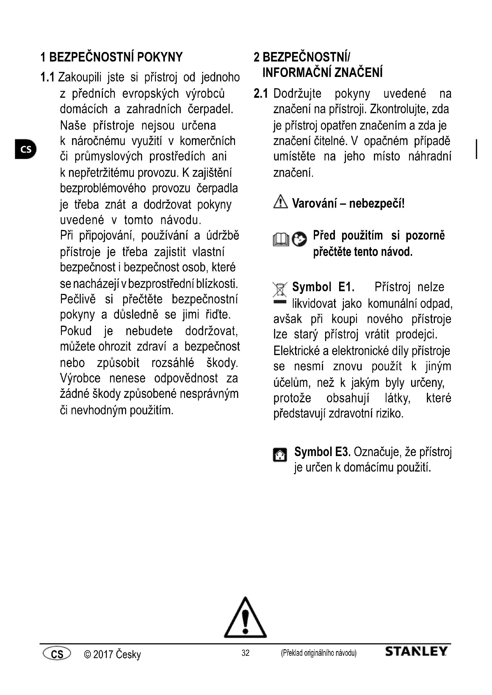 Dodržujte pokyny uvedené na značení na přístroji. Zkontrolujte, zda je přístroj opatřen značením a zda je značení čitelné. V opačném případě umístěte na jeho místo náhradní značení. Varování – nebezpečí! Před použitím si pozorně přečtěte tento návod. Symbol E1. Přístroj nelze likvidovat jako komunální odpad, avšak při koupi nového přístroje lze starý přístroj vrátit prodejci. Elektrické a elektronické díly přístroje se nesmí znovu použít k jiným účelům, než k jakým byly určeny, protože obsahují látky, které představují zdravotní riziko. Symbol E3. Označuje, že přístroj je určen k domácímu použití.33 (Překlad originálního návodu) © 2017 Česky (Překlad originálního návodu) © 2017 ČeskyCS