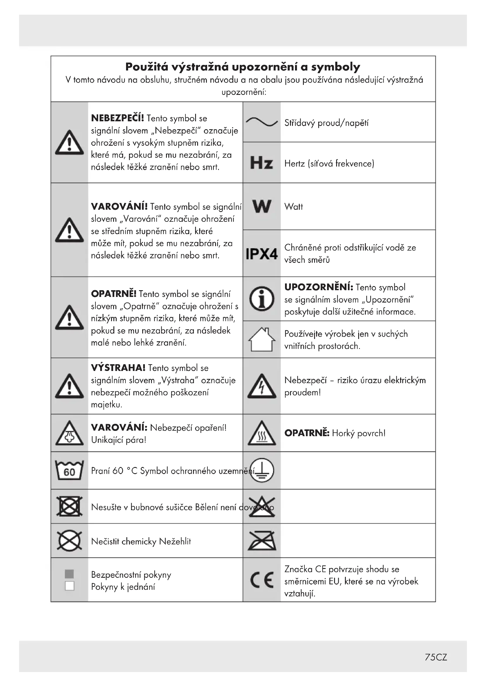 VAROVÁNÍ! Nebezpečí zranění elektrickým proudem! Neponořujte elektrické části výrobku do vody nebo jiných kapalin. Nikdy výrobek nedržte pod tekoucí vodou.79CZ