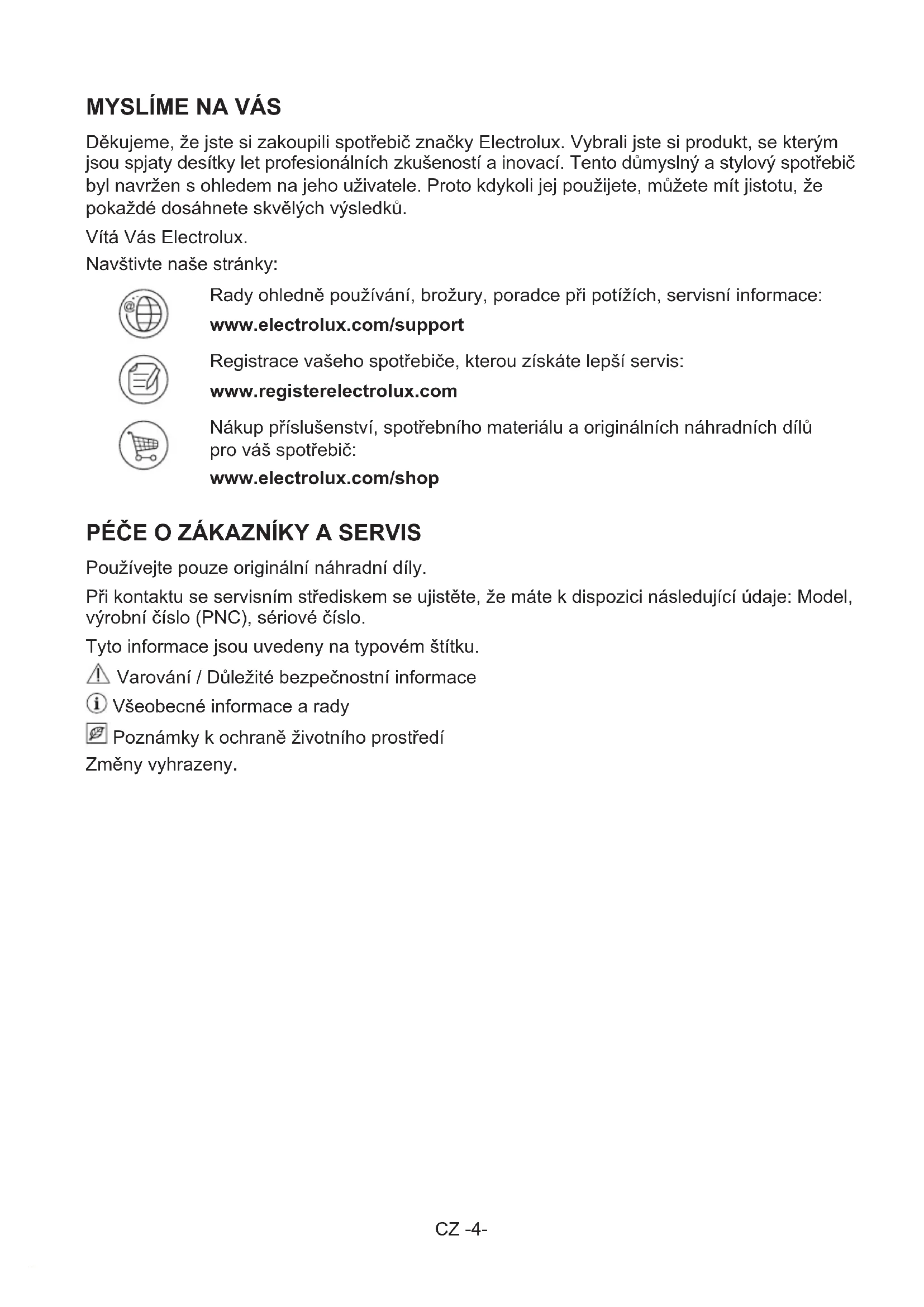 Děkujeme, že jste si zakoupili spotřebič značky Electrolux. Vybrali jste si produkt, se kterým jsou spjaty desítky let profesionálních zkušeností a inovací. Tento důmyslný a stylový spotřebič byl navržen s ohledem na jeho uživatele. Proto kdykoli jej použijete, můžete mít jistotu, že pokaždé dosáhnete skvělých výsledků. Vítá Vás Electrolux. Navštivte naše stránky: Rady ohledně používání, brožury, poradce při potížích, servisní informace: www.electrolux.com/support Registrace vašeho spotřebiče, kterou získáte lepší servis: www.registerelectrolux.com Nákup příslušenství, spotřebního materiálu a originálních náhradních dílů pro váš spotřebič: www.electrolux.com/shop PÉČE O ZÁKAZNÍKY A SERVIS Používejte pouze originální náhradní díly. Při kontaktu se servisním střediskem se ujistěte, že máte k dispozici následující údaje: Model, výrobní číslo (PNC), sériové číslo. Tyto informace jsou uvedeny na typovém štítku. Varování / Důležité bezpečnostní informace Všeobecné informace a rady Poznámky k ochraně životního prostředí Změny vyhrazeny.CZ -5- PŘED POUŽITÍM SPOTŘEBIČE ČÁST - 1. Obecná upozornění Před instalací a použitím vašeho spotřebiče si pečlivě přečtěte návod s pokyny. Nezodpovídáme za škody způsobené špatným použitím. Řiďte se všemi pokyny na vašem spotřebiči a v návodu k použití a tento návod uchovejte na bezpečném místě, abyste mohli vyřešit problémy, k nimž může dojít v budoucnosti. Tento spotřebič není určen k použití jako vestavěné zařízení. Pokud nebudou z důvodu odlišné instalace dodrženy požadavky na prostor pro volně stojící spotřebič, spotřebič bude fungovat správně, ale může se lehce zvýšit spotřeba energie. VAROVÁNÍ: Větrací otvory udržujte bez překážek. VAROVÁNÍ: Nepoužívejte mechanické nástroje nebo jiné prostředky k urychlení procesu odmrazení s výjimkou těch, které doporučuje výrobce.. VAROVÁNÍ: V prostoru pro skladování potravin nepoužívejte elektrické spotřebiče, s výjimkou těch, které doporučuje výrobce. VAROVÁNÍ:Nepoškoďte chaldící okruh. VAROVÁNÍ: Abyste předešli nebezpečí z důvodu nestability spotřebiče, je třeba hu upevnit v souladu s pokyny. VAROVÁNÍ: Když umisťujete spotřebič, ujistěte se, že není elektrický kabel zauzlovaný nebo poškozený. VAROVÁNÍ: Neumisťujte žádné vícenásobné rozbočovací zásuvky ani přenosné zdroje napájení na zadní část spotřebiče.CZ -6- Pokud vaše chladnička používá jako chladivo R600 - bude to vyznačeno na štítku na chladicím zařízení- musíte si dát pozor během přepravy a montáže, aby nedošlo k poškození chladících prvků spotřebiče. I když je R600a ekologický a přírodní plyn, je výbušný. Pokud dojde k velkému úniku z důvodu poškození chladicích prvků, přemístěte chladničku od otevřeného ohně nebo zdrojů tepla a místnost, v níž je spotřebič umístěný, několik minut větrejte.