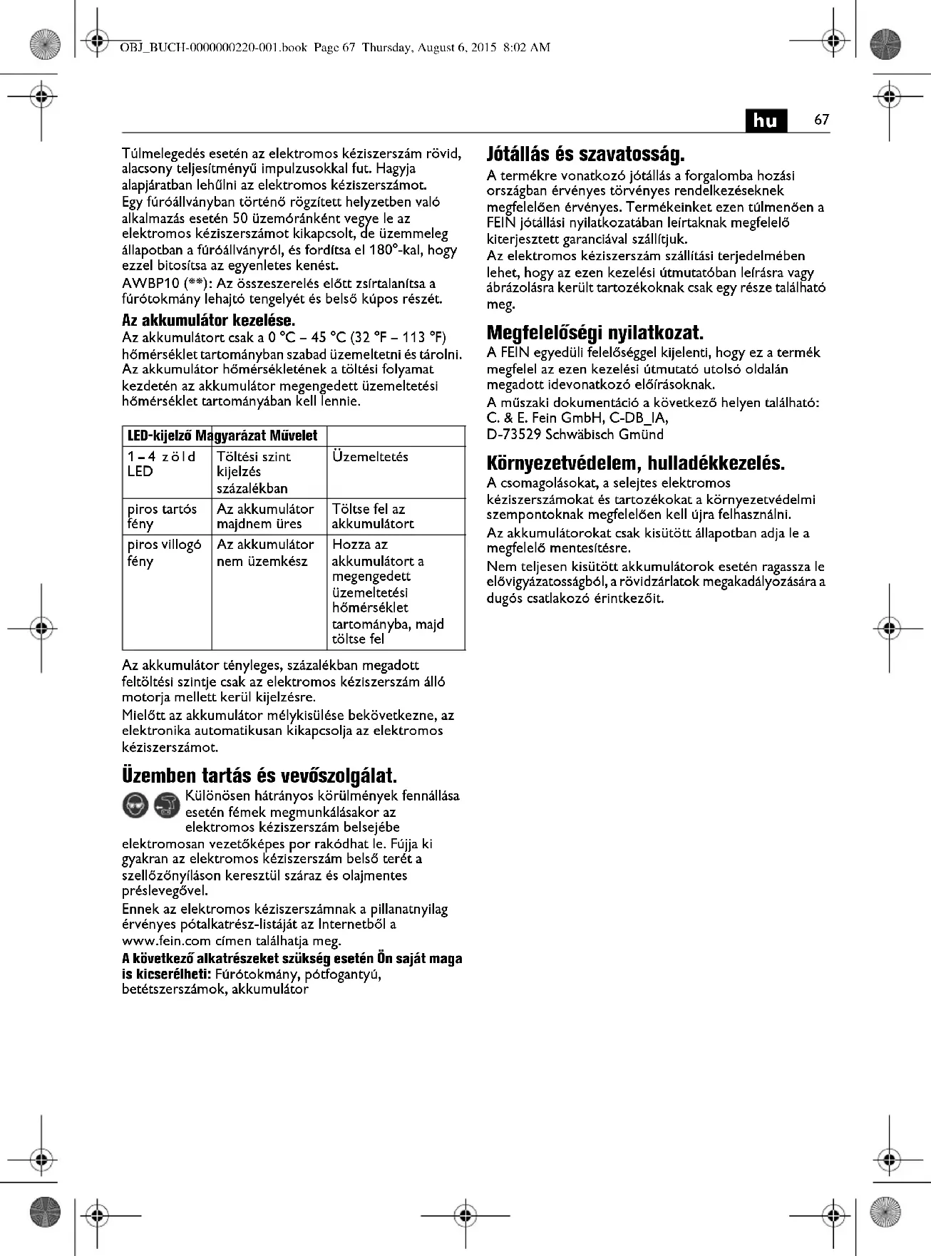 Údržba a servis. Při extrémních podmínkách nasazení se může při opracování kovů usazovat uvnitř elektronářadí vodivý prach. Často vyfukujte vnitřní prostor elektronářadí skrz větrací otvory suchým tlakovým vzduchem bez oleje. Aktuální seznam náhradních dílů tohoto elektronářadí naleznete na internetu na www.fein.com. Následující díly můžete, je-li třeba, vyměnit sami: vrtací sklíčidlo, přídavnou rukojeť, pracovní nástroje, akumulátor Záruka a ručení. Záruka na výrobek platí podle zákonných ustanovení země uvedení do provozu. Nad to navíc poskytuje firma FEIN záruku podle prohlášení o záruce výrobce FEIN. V obsahu dodávky Vašeho elektronářadí může být obsažen i jen jeden díl příslušenství popsaného nebo zobrazeného v tomto návodu k obsluze. Prohlášení o shodě. Firma FEIN prohlašuje ve výhradní zodpovědnosti, že tento výrobek odpovídá příslušným ustanovením uvedeným na poslední straně tohoto návodu k obsluze. Technické podklady u: C. & E. Fein GmbH, C-DB_IA, D-73529 Schwäbisch Gmünd Ochrana životního prostředí, likvidace. Obaly, vyřazené elektronářadí a příslušenství dodejte k opětovnému zhodnocení nepoškozujícímu životní prostředí. Akumulátory odevzdejte k řádné likvidaci pouze ve vybitém stavu. U ne zcela vybitých akumulátorů zaizolujte konektor preventivně proti zkratu pomocí lepící pásky. OBJ_BUCH-0000000220-001.book Page 71 Thursday, August 6, 2015 8:02 AM72