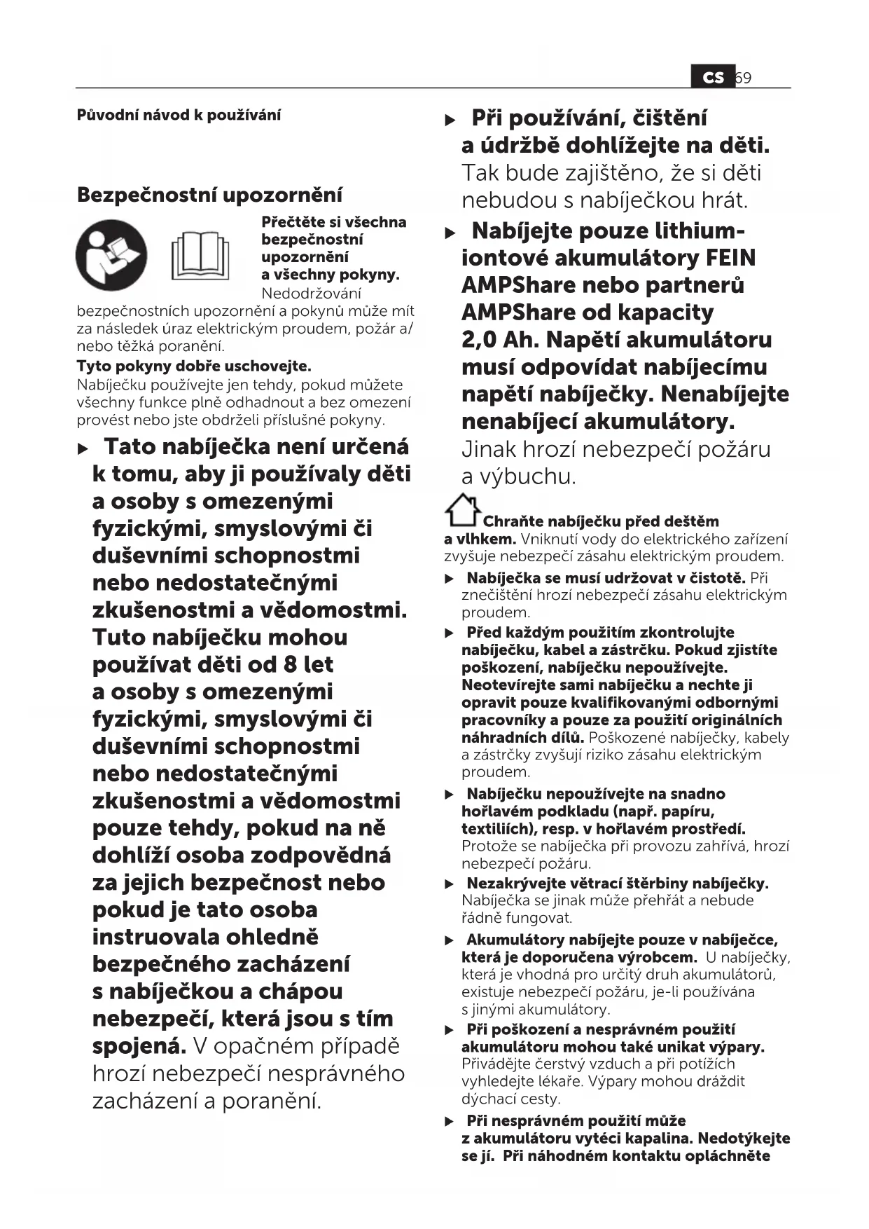 – 4,0Ah min 16/25 – 5,0Ah min 20/35 Počet akumulátorových článků 5–15 Hmotnost podle EPTA-Procedure01:2014 kg 0,95 Třída ochrany / II A) Vzávislosti na teplotě atypu akumulátoru B) Akumulátor nabitý na 50% (po nabíjení sPower Boost). Akumulátor lze vyjmout aihned začít používat. C) Akumulátor nabitý na cca 80% (po nabíjení sPower Boost). Akumulátor lze vyjmout aihned začít používat. D) Akumulátor nabitý na cca 80% (po nabíjení se standardním nabíjecím režimem). Akumulátor lze vyjmout aihned začít používat. E) Akumulátor nabitý na 97 - 100% (po nabíjení se standardním nabíjecím režimem). ProvozČeština MontážČeština u Před každou prací na nabíječce vytáhněte zástrčku ze zásuvky. Montáž na stěnuČeština Nabíječku lze používat buď stojící (na stole) nebo zavěšenou na stěně. Pro upevnění na stěnu: Vyvrtejte dva otvory se vzdáleností podle výkresu. 70 cs 34101366060 • 1.6.22Pro upevnění použijte šrouby spůlkulatou hlavou oprůměru od 5mm do max. 6,5mm. Uvedení do provozuČeština u Dbejte na správné síťové napětí! Napětí zdroje proudu musí souhlasit súdaji na typovém štítku nabíječky. Nabíječky označené 230V se smí používat také s220V. Proces nabíjeníČeština Proces nabíjení začne, jakmile je síťová zástrčka nabíječky zapojená vzásuvce aakumulátor je nasazený vnabíjecím otvoru (1). Díky inteligentnímu způsobu nabíjení se automaticky rozpozná stav nabití akumulátoru avzávislosti na teplotě anapětí akumulátoru se nabije právě optimálním nabíjecím proudem. Tím se šetří akumulátor azůstává při uložení vnabíječce vždy zcela nabitý. Význam zobrazovaných prvkůČeština Zelený ukazatel stavu nabití akumulátoru(3)Čeština Pět zelených LED signalizuje stav nabití akumulátoru během nabíjení apo nabíjení. Nepřetržitě svítící LED signalizuje kapacitu akumulátoru cca 20%. Stav LED Kapacita akumulátoru cca 5 LED se postupně rozsvěcuje. <20% Nejspodnější LED nepřetržitě svítí. 20% 2 nejspodnější LED nepřetržitě svítí. 40% Stav LED Kapacita akumulátoru cca 3 nejspodnější LED nepřetržitě svítí. 60% 4 nejspodnější LED nepřetržitě svítí. 80% 5 LED nepřetržitě svítí. >95% Upozornění: Proces rychlonabíjení je možný pouze tehdy, pokud je teplota akumulátoru vpřípustném rozsahu teploty při nabíjení, viz část „Technické údaje“. Červená kontrolka sledování teploty/ chyby(5)Čeština Nepřetržité svíceníČeština Nepřetržité svícení signalizuje, že je teplota akumulátoru mimo přípustný rozsah teploty nabíjení, viz část „Technické údaje“. Jakmile je dosažen přípustný rozsah teploty při nabíjení, spustí se proces nabíjení. BlikáníČeština Červeně blikající kontrolka signalizuje, že akumulátor nebo nabíječka jsou poškozené. Tlačítko Power Boost (4)Čeština Stisknutím tlačítka Power Boost (4) se aktivuje režim rychlonabíjení. Lze provést před vložením akumulátoru nebo při vloženém akumulátoru. Tlačítko Power Boost (4) svítí během rychlonabíjení červeně. Opětovným stisknutím tlačítka Power Boost se vrátíte zpět do režimu standardního nabíjení. Po skončení rychlonabíjení (je dosaženo cca 50% kapacity akumulátoru) tlačítko Power Boost (4) zhasne. Když akumulátor zůstane vnabíječce, nabíjí se dál. Akustický signálČeština Jakmile je nabíjení dokončené, zazní krátký akustický signál. Závady – příčiny aodstraněníČeština Příčina Odstranění Červená kontrolka sledování teploty/chyby (5) bliká Není možné nabíjení Akumulátor není (správně) nasazený Nasaďte akumulátor správně do nabíječky Znečištěné kontakty akumulátoru Vyčistěte kontakty akumulátoru; např. opakovaným zapojením aodpojením cs 71 34101366060 • 1.6.22Příčina Odstranění akumulátoru, případně akumulátor vyměňte Vadný akumulátor Akumulátor vyměňte Vadná nabíječka. Nabíječku příp. nechte zkontrolovat autorizovaným servisním střediskem pro elektrické nářadí FEIN. Zelený ukazatel stavu nabití akumulátoru (3) nesvítí Síťová zástrčka nabíječky není (správně) zapojená Síťovou zástrčku (zcela) zapojte do zásuvky Zásuvka, síťový kabel nebo nabíječka mají poruchu Zkontrolujte síťové napětí, nabíječku příp. nechte zkontrolovat autorizovaným servisním střediskem pro elektrické nářadí FEIN. Pracovní pokynyČeština Výrazně kratší doba chodu po nabití ukazuje, že je akumulátor opotřebovaný amusí se vyměnit. Při nepřetržitých, popř. několikrát po sobě následujících nabíjecích cyklech bez přerušení se může nabíječka zahřát. To je ale vpořádku aneupozorňuje to na technickou závadu nabíječky. Chlazení akumulátoru (Active Air Cooling)Čeština Řízení ventilátoru integrované vnabíječce sleduje teplotu nasazeného akumulátoru. Jakmile teplota akumulátoru stoupne nad cca 0°C, začne se akumulátor chladit ventilátorem. Zapnutý ventilátor při tom vydává příslušné zvuky. Pokud ventilátor neběží, je vadný nebo je teplota <0°C. Doba nabíjení se tím může prodloužit. NabíjeníČeština Režim Power BoostČeština Pomocí Power Boost se akumulátory nabíjejí vrežimu rychlonabíjení do cca 50% kapacity akumulátoru. Tyto akumulátory jsou znovu připravené kpoužití během kratší doby než při nabíjení vrežimu standardního nabíjení. SPower Boost se akumulátor nabíjí nejprve vysokým nabíjecím proudem, který se postupně snižuje. Když akumulátor zůstane vnabíječce, nabíjí se dál. Režim standardního nabíjeníČeština Akumulátor se nabíjí až do cca 100% kapacity. Režim standardního nabíjení je nejlepší kombinace rychlého nabíjení akompletního nabití akumulátoru. Režim standardního nab