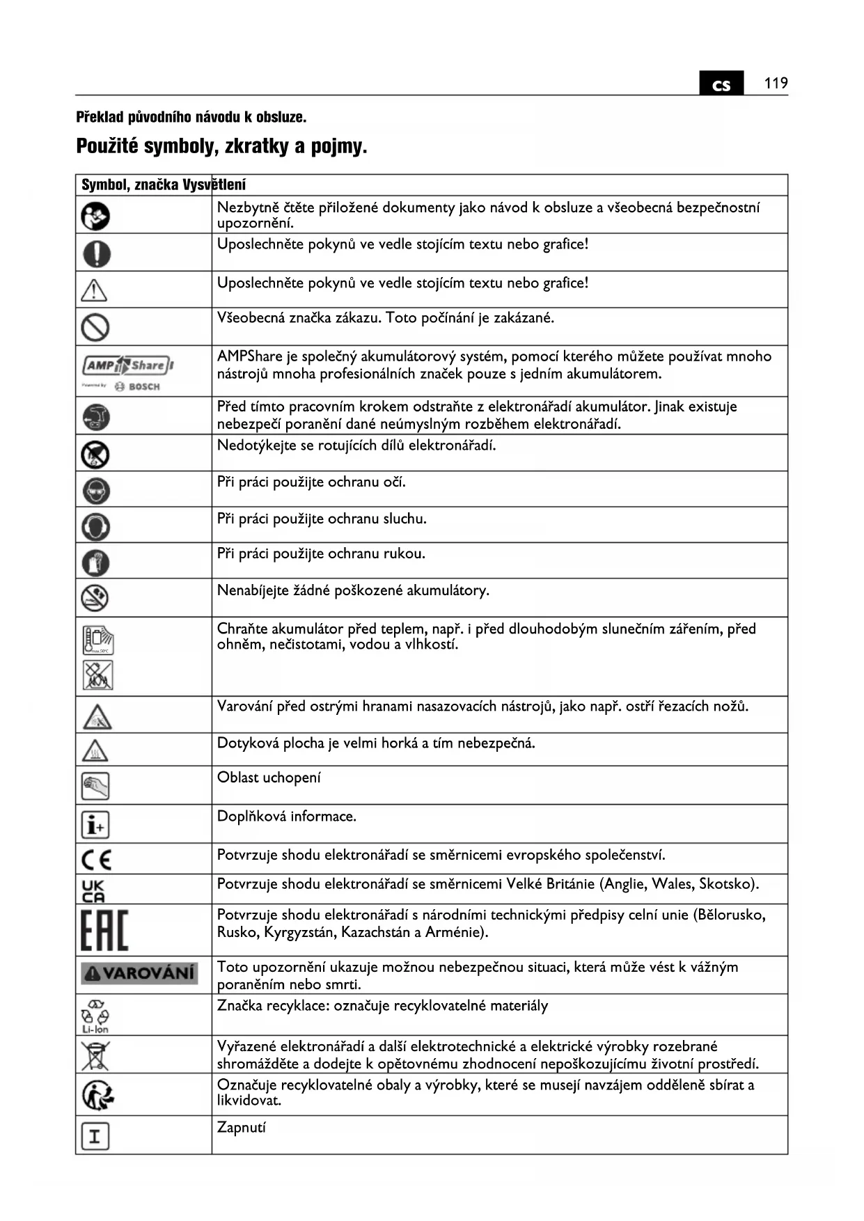 Překlad původního návodu k obsluze. Použité symboly, zkratky a pojmy. Symbol, značka Vysvětlení Nezbytně čtěte přiložené dokumenty jako návod k obsluze a všeobecná bezpečnostní upozornění. Uposlechněte pokynů ve vedle stojícím textu nebo grafice! Uposlechněte pokynů ve vedle stojícím textu nebo grafice! Všeobecná značka zákazu. Toto počínání je zakázané. AMPShare je společný akumulátorový systém, pomocí kterého můžete používat mnoho nástrojů mnoha profesionálních značek pouze s jedním akumulátorem. Před tímto pracovním krokem odstraňte z elektronářadí akumulátor. Jinak existuje nebezpečí poranění dané neúmyslným rozběhem elektronářadí. Nedotýkejte se rotujících dílů elektronářadí. Při práci použijte ochranu očí. Při práci použijte ochranu sluchu. Při práci použijte ochranu rukou. Nenabíjejte žádné poškozené akumulátory. Chraňte akumulátor před teplem, např. i před dlouhodobým slunečním zářením, před ohněm, nečistotami, vodou a vlhkostí. Varování před ostrými hranami nasazovacích nástrojů, jako např. ostří řezacích nožů. Dotyková plocha je velmi horká a tím nebezpečná. Oblast uchopení Doplňková informace. Potvrzuje shodu elektronářadí se směrnicemi evropského společenství. Potvrzuje shodu elektronářadí se směrnicemi Velké Británie (Anglie, Wales, Skotsko). Potvrzuje shodu elektronářadí s národními technickými předpisy celní unie (Bělorusko, Rusko, Kyrgyzstán, Kazachstán a Arménie). Toto upozornění ukazuje možnou nebezpečnou situaci, která může vést k vážným poraněním nebo smrti. Značka recyklace: označuje recyklovatelné materiály Vyřazené elektronářadí a další elektrotechnické a elektrické výrobky rozebrané shromážděte a dodejte k opětovnému zhodnocení nepoškozujícímu životní prostředí. Označuje recyklovatelné obaly a výrobky, které se musejí navzájem odděleně sbírat a likvidovat. Zapnutí max.50°C120