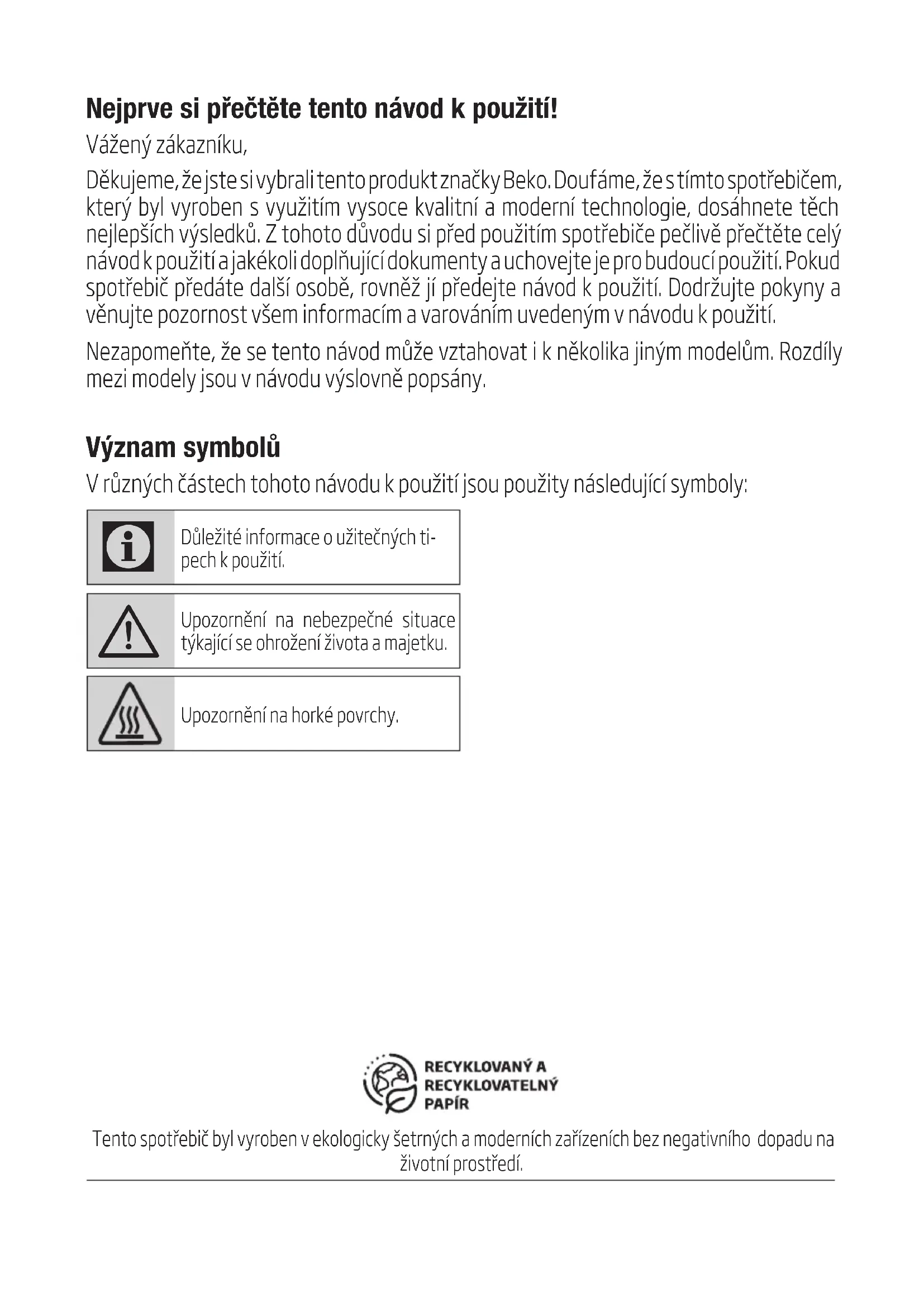 Niniejsze warunki gwarancji mają zastosowanie do Urządzeń zakupionych od dnia 01.03.2019 r. Gwarant oświadcza, że niniejsza Gwarancja jest udzielana Użytkownikowi dodatkowo i nie wyłącza, nie ogranicza ani nie zawiesza uprawnień Użytkownika wynikających z przepisów o rękojmi za wady rzeczy sprzedanej na podstawie Kodeksu cywilnego.Nejprve si přečtěte tento návod k použití! Vážený zákazníku, Děkujeme, že jste si vybrali tento produkt značky Beko. Doufáme, že s tímto spotřebičem, který byl vyroben s využitím vysoce kvalitní a moderní technologie, dosáhnete těch nejlepších výsledků. Z tohoto důvodu si před použitím spotřebiče pečlivě přečtěte celý návod k použití a jakékoli doplňující dokumenty a uchovejte je pro budoucí použití. Pokud spotřebič předáte další osobě, rovněž jí předejte návod k použití. Dodržujte pokyny a věnujte pozornost všem informacím a varováním uvedeným v návodu k použití. Nezapomeňte, že se tento návod může vztahovat i k několika jiným modelům. Rozdíly mezi modely jsou v návodu výslovně popsány. Význam symbolů V různých částech tohoto návodu k použití jsou použity následující symboly: