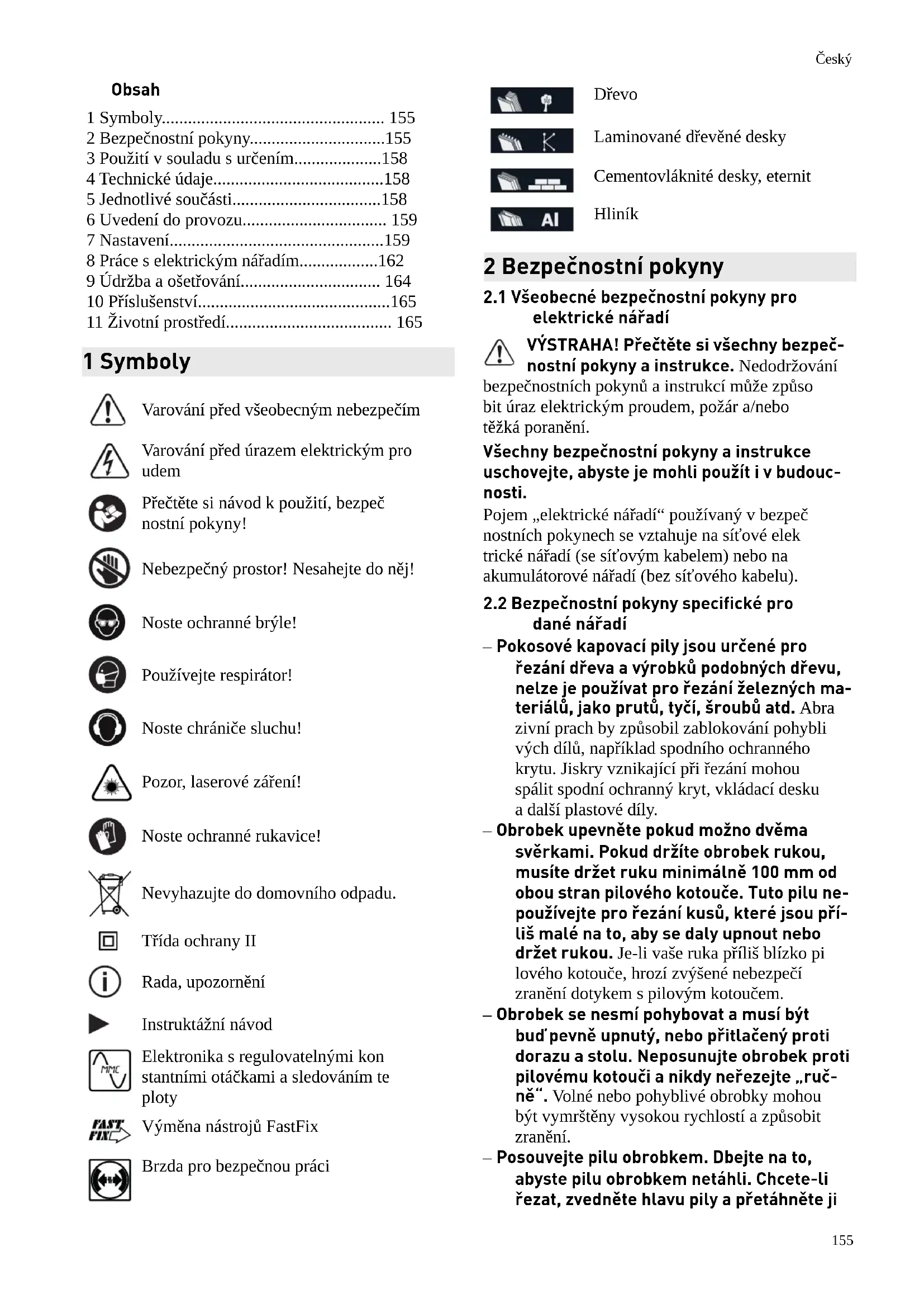 - 11 Životní prostředí 1 Symboly Varování před všeobecným nebezpečím Varování před úrazem elektrickým pro udem Přečtěte si návod k použití, bezpeč nostní pokyny! Nebezpečný prostor! Nesahejte do něj! Noste ochranné brýle! Používejte respirátor! Noste chrániče sluchu! Pozor, laserové záření! Noste ochranné rukavice! Nevyhazujte do domovního odpadu. Třída ochrany II Rada, upozornění Instruktážní návod Elektronika s regulovatelnými kon stantními otáčkami a sledováním te ploty Výměna nástrojů FastFix Brzda pro bezpečnou práci Dřevo Laminované dřevěné desky Cementovláknité desky, eternit Hliník 2 Bezpečnostní pokyny p. 165