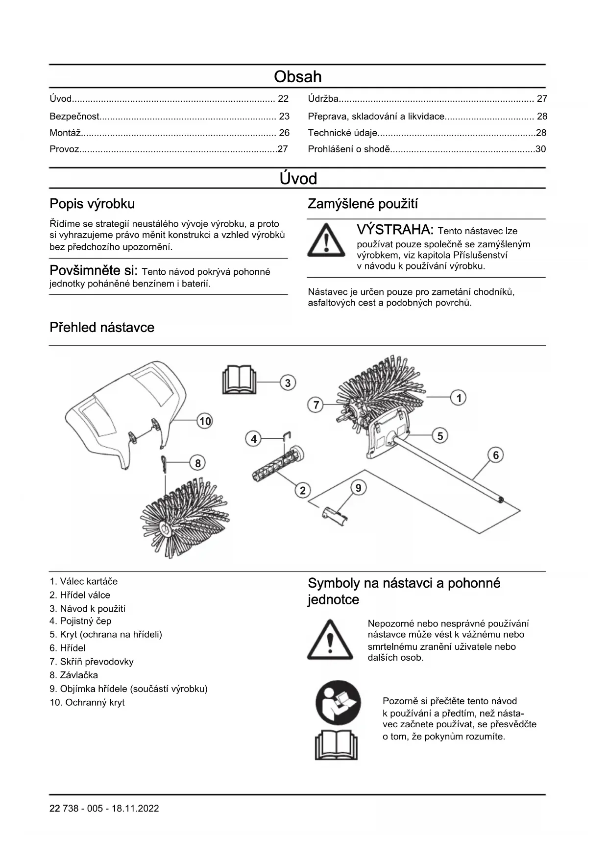 - Prohlášení oshodě Úvod Popis výrobku Řídíme se strategií neustálého vývoje výrobku, aproto si vyhrazujeme právo měnit konstrukci avzhled výrobků bez předchozího upozornění. Povšimněte si: Tento návod pokrývá pohonné jednotky poháněné benzínem ibaterií. Zamýšlené použití VÝSTRAHA: Tento nástavec lze používat pouze společně se zamýšleným výrobkem, viz kapitola Příslušenství vnávodu kpoužívání výrobku. Nástavec je určen pouze pro zametání chodníků, asfaltových cest apodobných povrchů. Přehled nástavce p. 30