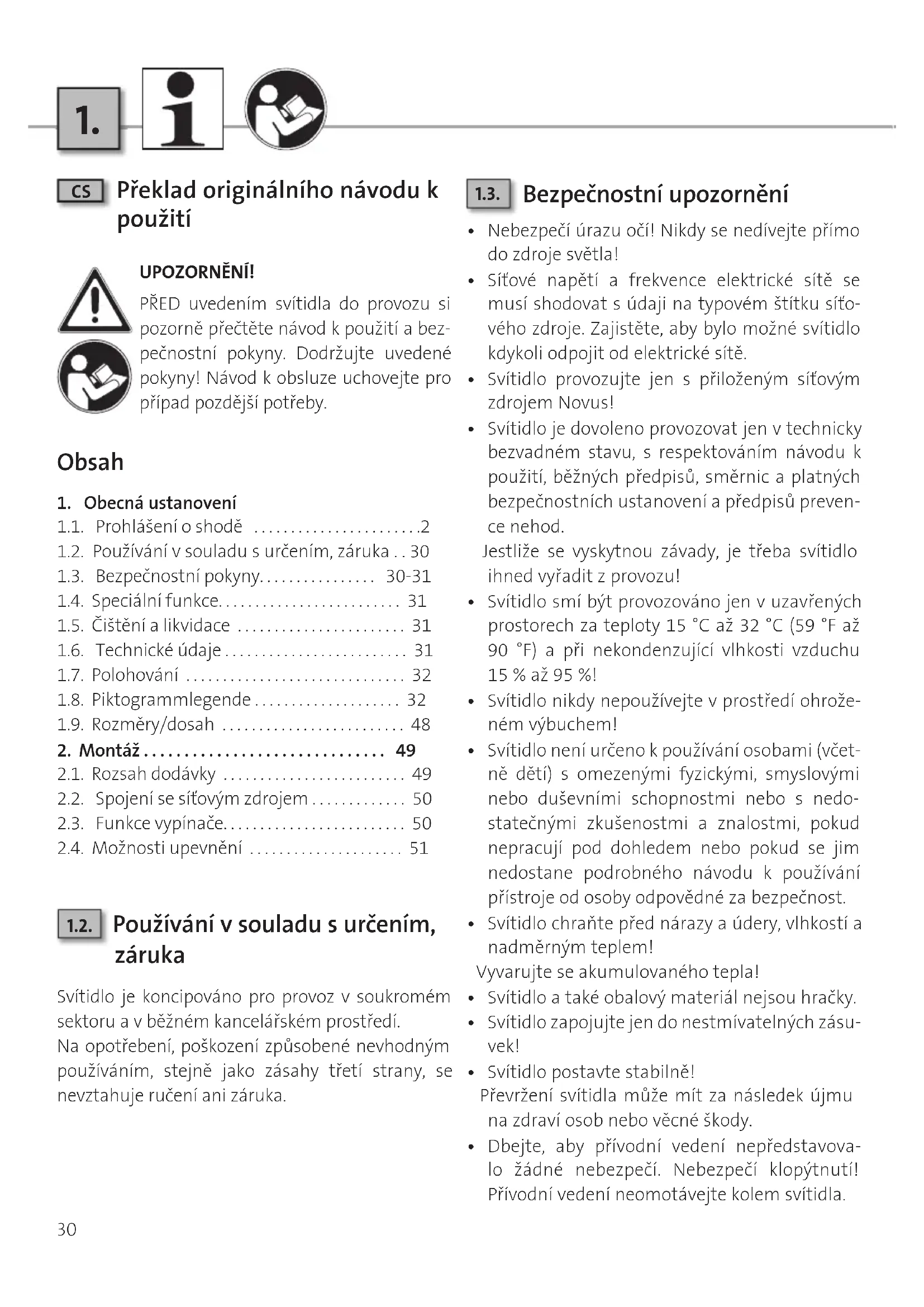 Překlad originálního návodu k použití UPOZORNĚNÍ! PŘED uvedením svítidla do provozu si pozorně přečtěte návod k použití a bez- pečnostní pokyny. Dodržujte uvedené pokyny! Návod k obsluze uchovejte pro případ pozdější potřeby. Obsah