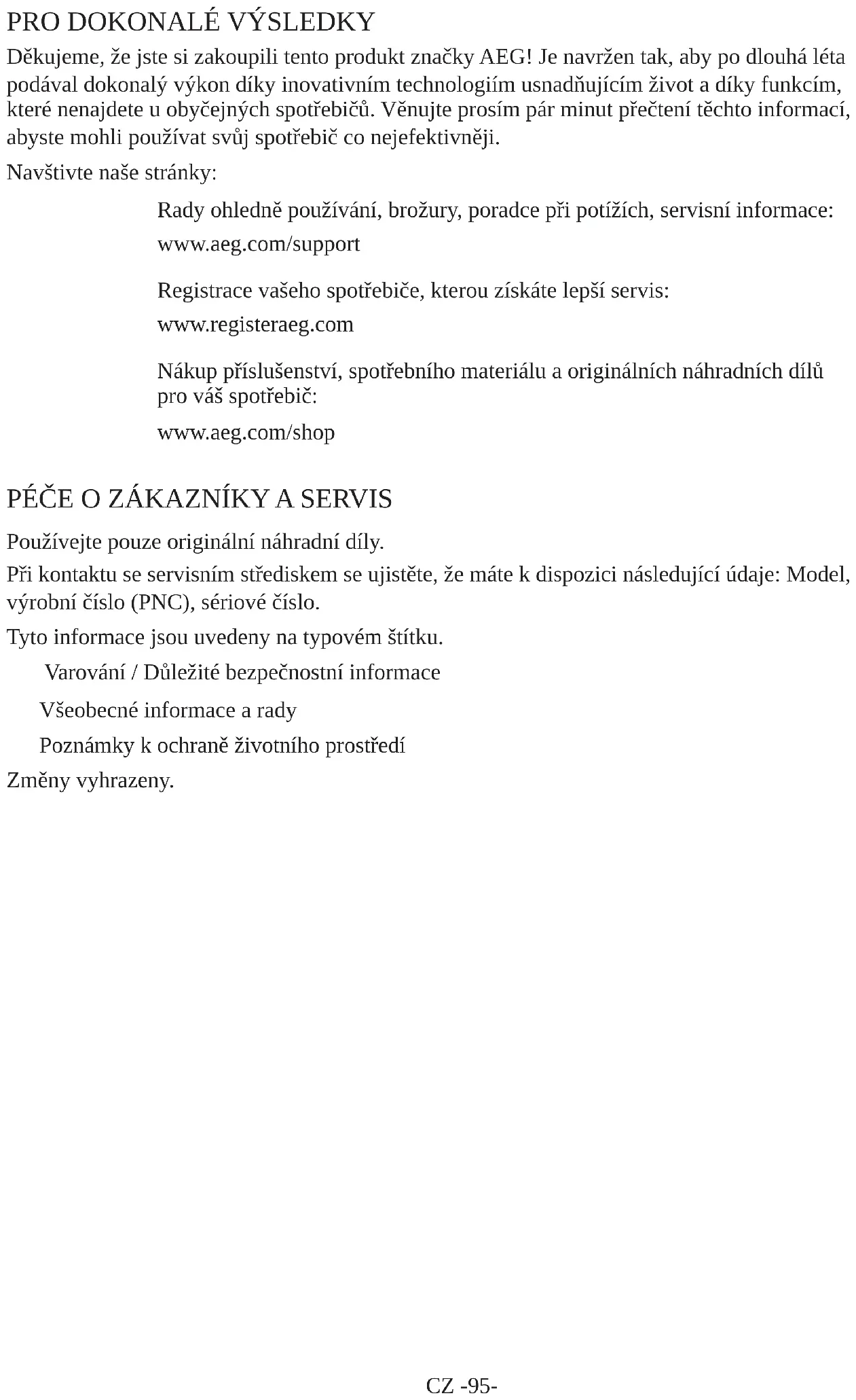 Děkujeme, že jste si zakoupili tento produkt značky AEG! Je navržen tak, aby po dlouhá léta podával dokonalý výkon díky inovativním technologiím usnadňujícím život a díky funkcím, které nenajdete u obyčejných spotřebičů. Věnujte prosím pár minut přečtení těchto informací, abyste mohli používat svůj spotřebič co nejefektivněji. Navštivte naše stránky: Rady ohledně používání, brožury, poradce při potížích, servisní informace: www.aeg.com/support Registrace vašeho spotřebiče, kterou získáte lepší servis: www.registeraeg.com Nákup příslušenství, spotřebního materiálu a originálních náhradních dílů pro váš spotřebič: www.aeg.com/shop PÉČE O ZÁKAZNÍKY A SERVIS Používejte pouze originální náhradní díly. Při kontaktu se servisním střediskem se ujistěte, že máte k dispozici následující údaje: Model, výrobní číslo (PNC), sériové číslo. Tyto informace jsou uvedeny na typovém štítku. Varování / Důležité bezpečnostní informace Všeobecné informace a rady Poznámky k ochraně životního prostředí Změny vyhrazeny.CZ -96- PŘED POUŽITÍM SPOTŘEBIČE ČÁST - 1. Obecná upozornění Před instalací a použitím vašeho spotřebiče si pečlivě přečtěte návod s pokyny. Nezodpovídáme za škody způsobené špatným použitím. Řiďte se všemi pokyny na vašem spotřebiči a v návodu k použití a tento návod uchovejte na bezpečném místě, abyste mohli vyřešit problémy, k nimž může dojít v budoucnosti. Tento spotřebič není určen k použití jako vestavěné zařízení. Pokud nebudou z důvodu odlišné instalace dodrženy požadavky na prostor pro volně stojící spotřebič, spotřebič bude fungovat správně, ale může se lehce zvýšit spotřeba energie. VAROVÁNÍ: Větrací otvory udržujte bez překážek. VAROVÁNÍ: Nepoužívejte mechanické nástroje nebo jiné prostředky k urychlení procesu odmrazení s výjimkou těch, které doporučuje výrobce.. VAROVÁNÍ: V prostoru pro skladování potravin nepoužívejte elektrické spotřebiče, s výjimkou těch, které doporučuje výrobce. VAROVÁNÍ:Nepoškoďte chaldící okruh. VAROVÁNÍ: Abyste předešli nebezpečí z důvodu nestability spotřebiče, je třeba hu upevnit v souladu s pokyny. VAROVÁNÍ: Když umisťujete spotřebič, ujistěte se, že není elektrický kabel zauzlovaný nebo poškozený. VAROVÁNÍ: Neumisťujte žádné vícenásobné rozbočovací zásuvky ani přenosné zdroje napájení na zadní část spotřebiče. Pokud vaše chladnička používá jako chladivo R600 - bude to vyznačeno na štítku na chladicím zařízení- musíte si dát pozor během přepravy a montáže, aby nedošlo k poškození chladících prvků spotřebiče. I když je R600a ekologický a přírodní plyn, je výbušný. Pokud dojde k velkému úniku z důvodu poškozeníCZ -97- chladicích prvků, přemístěte chladničku od otevřeného ohně nebo zdrojů tepla a místnost, v níž je spotřebič umístěný, několik minut větrejte.