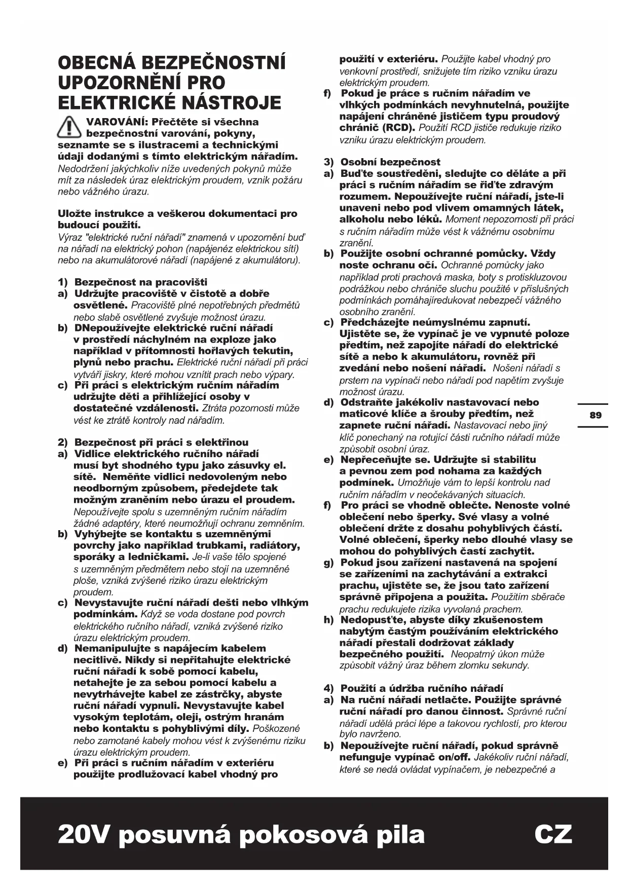 VAROVÁNÍ: Přečtěte si všechna bezpečnostní varování, pokyny, seznamte se s ilustracemi a technickými údaji dodanými s tímto elektrickým nářadím. Nedodržení jakýchkoliv níže uvedených pokynů může mít za následek úraz elektrickým proudem, vznik požáru nebo vážného úrazu. Uložte instrukce a veškerou dokumentaci pro budoucí použití. Výraz "elektrické ruční nářadí" znamená v upozornění buď na nářadí na elektrický pohon (napájenéz elektrickou sítí) nebo na akumulátorové nářadí (napájené z akumulátoru).