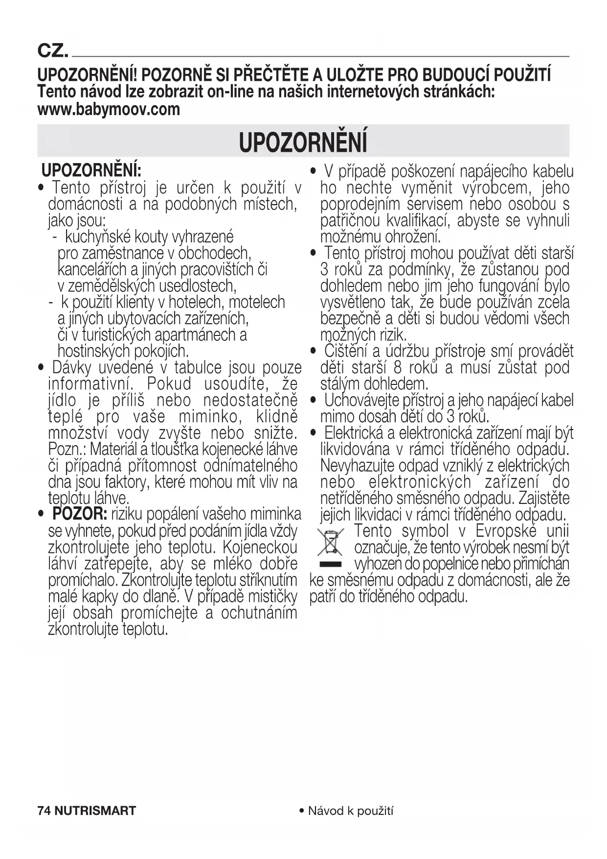 - Elektrická a elektronická zařízení mají být likvidována v rámci tříděného odpadu. Nevyhazujte odpad vzniklý z elektrických nebo elektronických zařízení do netříděného směsného odpadu. Zajistěte jejich likvidaci v rámci tříděného odpadu. Tento symbol v Evropské unii označuje, že tento výrobek nesmí být vyhozen do popelnice nebo přimíchán ke směsnému odpadu z domácnosti, ale že patří do tříděného odpadu. UPOZORNĚNÍ! POZORNĚ SI PŘEČTĚTE A ULOŽTE PRO BUDOUCÍ POUŽITÍ Tento návod lze zobrazit on-line na našich internetových stránkách: www.babymoov.com75NUTRISMART