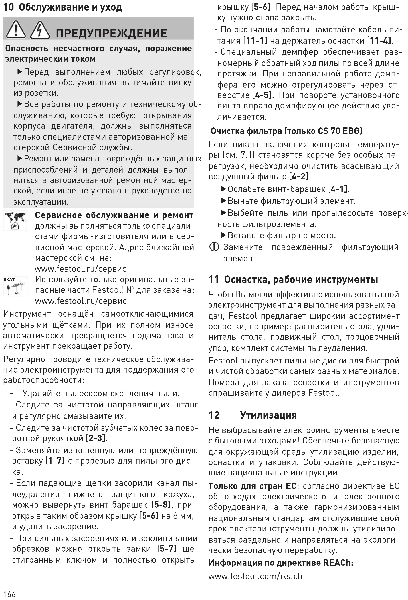 Když posouvač obrobku [11-2] nepoužíváte, uložte ho do držáku příslušenství [11-4]. 10 Údržba a péče VÝSTRAHA Nebezpečí úrazu elektrickým proudem fPřed každým nastavováním, údržbou či opravou vytáhněte síťovou zástrčku ze zásuvky. fVšechny práce údržby a opravy, které vyžadu- jí otevření krytu motoru, smí provádět pouze autorizovaný zákaznický servis. fPoškozené ochranné prvky a díly musí podle předpisů opravovat nebo vyměňovat autorizova- ný servis, pokud není v návodu k obsluze uvede- no jinak. Servis aopravy smí provádět pouze vý- robce nebo servisní dílny. Nejbližší adre- su najdete na: www.festool.cz/sluzby EKAT