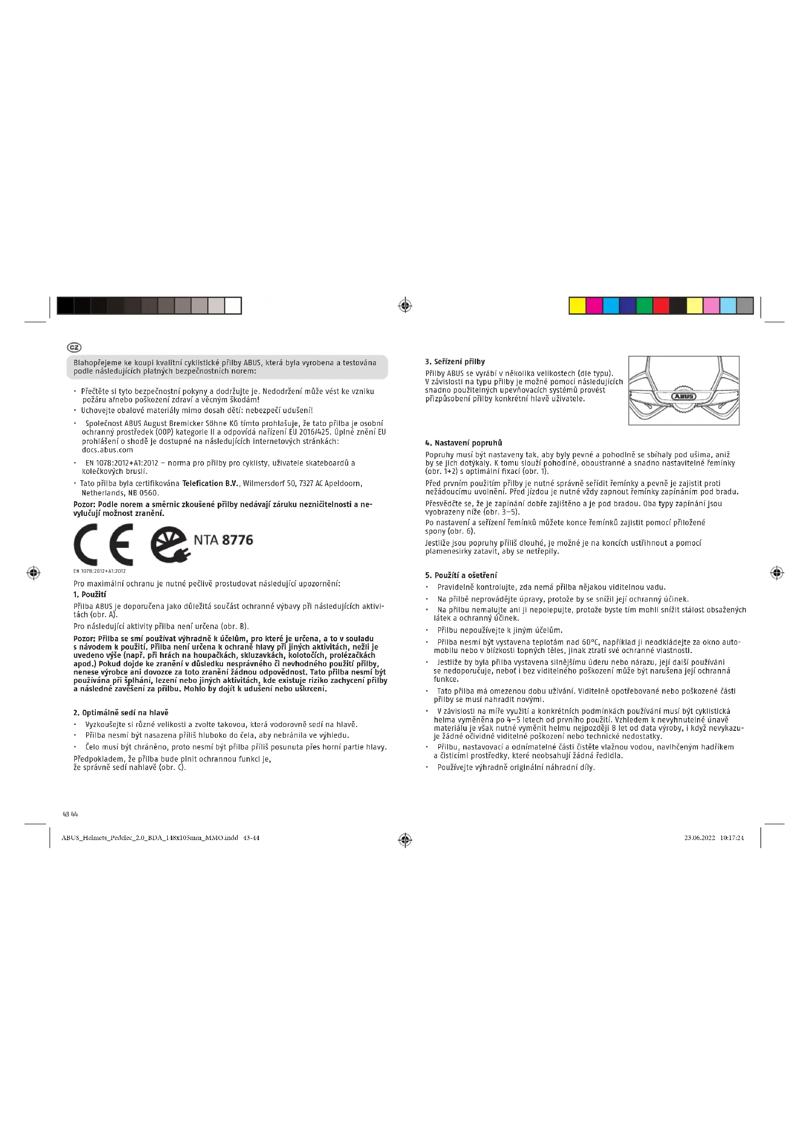- Používejte výhradně originální náhradní díly. EN 1078:2012+A1:2012 ABUS_Helmets_Pedelec_2.0_BDA_148x105mm_MMO.indd 43-44ABUS_Helmets_Pedelec_2.0_BDA_148x105mm_MMO.indd 43-44 23.06.2022 10:17:2423.06.2022 10:17:2445 46 Informace o baterii