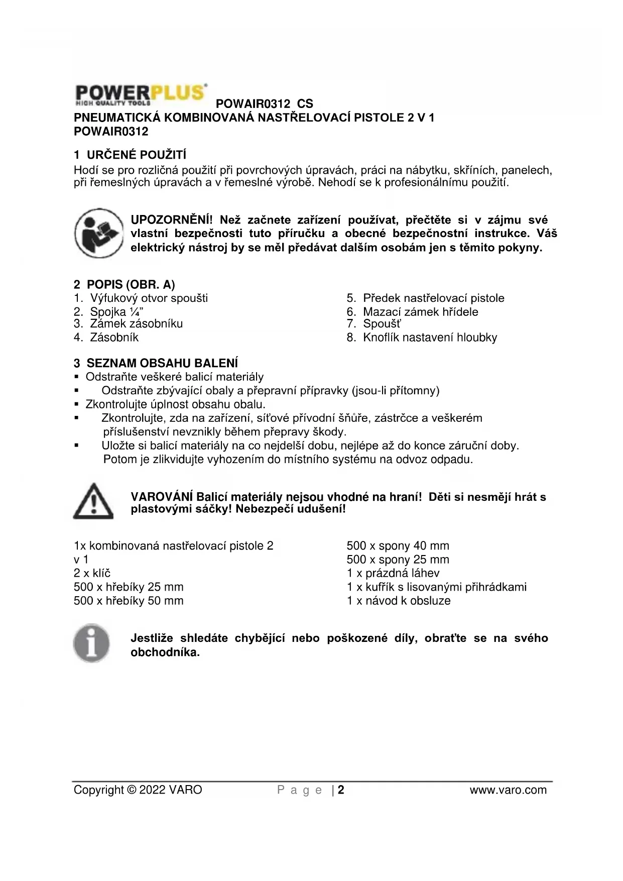 varování"POWAIR0312 CS Copyright © 2022 VARO P a g e | 7 www.varo.com