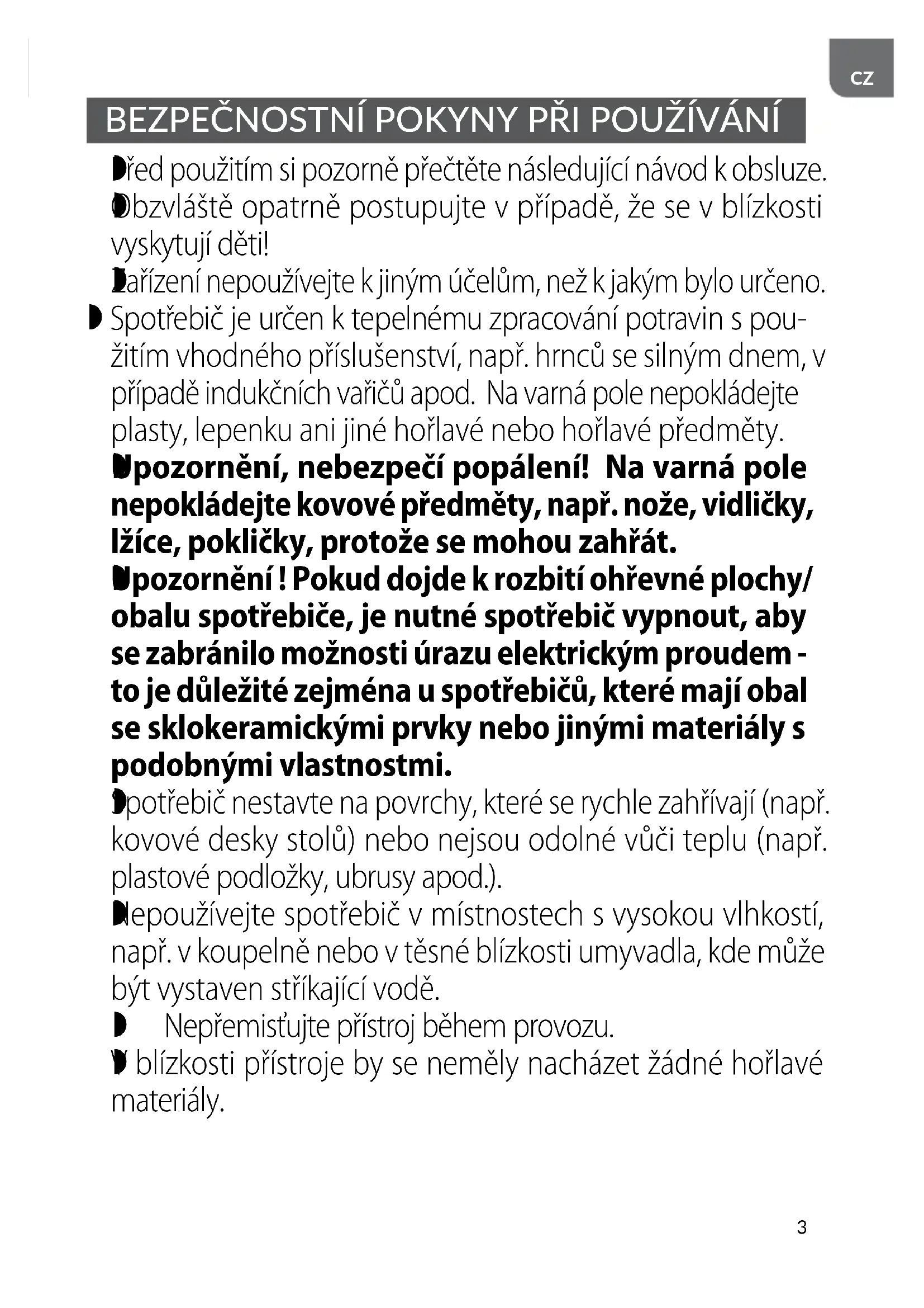 Upozornění ! Pokud dojde k rozbití ohřevné plochy/ obalu spotřebiče, je nutné spotřebič vypnout, aby se zabránilo možnosti úrazu elektrickým proudem - to je důležité zejména u spotřebičů, které mají obal se sklokeramickými prvky nebo jinými materiály s podobnými vlastnostmi.
