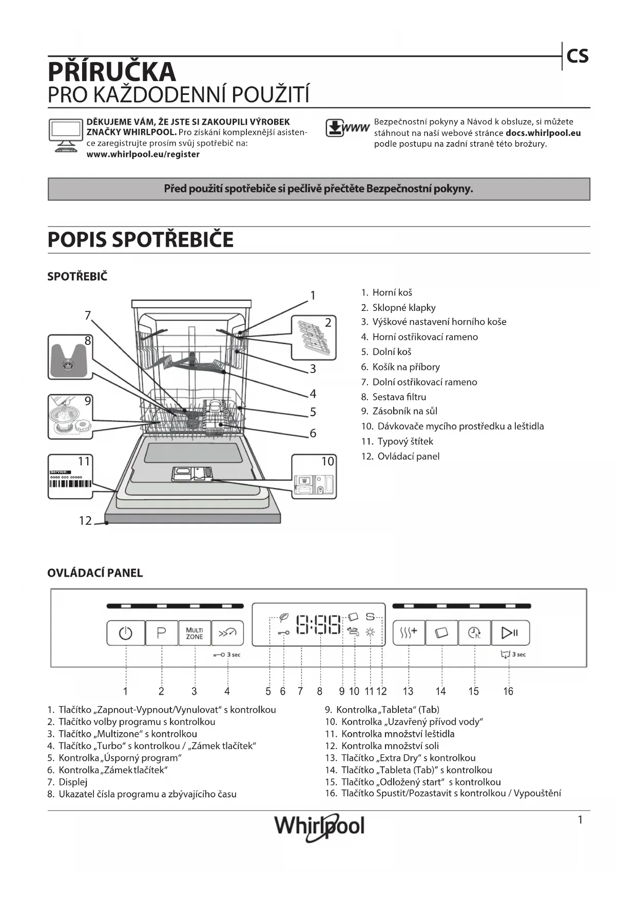1. Tlačítko „Zapnout-Vypnout/Vynulovat“ s kontrolkou2. Tlačítko volby programu s kontrolkou3. Tlačítko „Multizone“ s kontrolkou4. Tlačítko „Turbo“ s kontrolkou / „Zámek tlačítek“5. Kontrolka „Úsporný program“6. Kontrolka „Zámek tlačítek“7. Displej8. Ukazatel čísla programu a zbývajícího času9. Kontrolka „Tableta“ (Tab)10. Kontrolka „Uzavřený přívod vody“11. Kontrolka množství leštidla12. Kontrolka množství soli13. Tlačítko „Extra Dry“ s kontrolkou14. Tlačítko „Tableta (Tab)” s kontrolkou15. Tlačítko „Odložený start“ s kontrolkou16. Tlačítko Spustit/Pozastavit s kontrolkou / VypouštěníDĚKUJEME VÁM, ŽE JSTE SI ZAKOUPILI VÝROBEK ZNAČKY WHIRLPOOL. Pro získání komplexnější asisten-ce zaregistrujte prosím svůj spotřebič na: www.whirlpool.eu/registerBezpečnostní pokyny aNávod kobsluze, si můžete stáhnout na naší webové stránce docs.whirlpool.eu podle postupu na zadní straně této brožury. SPOTŘEBIČ 1. Horní koš2. Sklopné klapky3. Výškové nastavení horního koše4. Horní ostřikovací rameno5. Dolní koš6. Košík na příbory7. Dolní ostřikovací rameno8. Sestava ltru9. Zásobník na sůl10. Dávkovače mycího prostředku a leštidla11. Typový štítek12. Ovládací panel