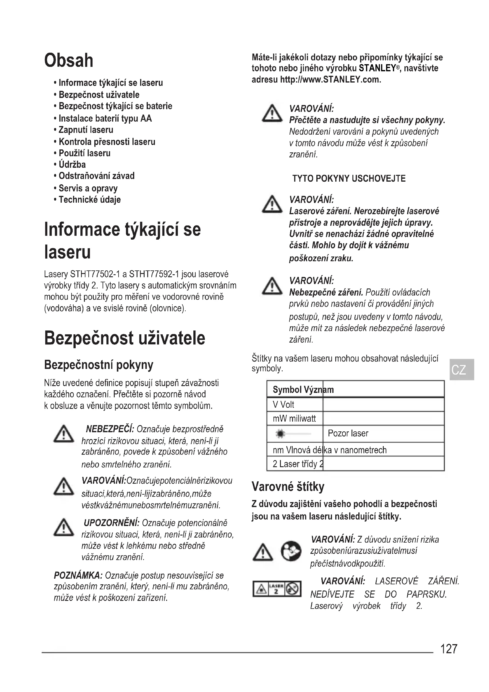 - Technické údaje Informace týkající se laseru Lasery STHT77502-1 a STHT77592-1 jsou laserové výrobky třídy 2. Tyto lasery s automatickým srovnáním mohou být použity pro měření ve vodorovné rovině (vodováha) a ve svislé rovině (olovnice). Bezpečnost uživatele Bezpečnostní pokyny Níže uvedené denice popisují stupeň závažnosti každého označení. Přečtěte si pozorně návod k obsluze a věnujte pozornost těmto symbolům. NEBEZPEČÍ: Označuje bezprostředně hrozící rizikovou situaci, která, není-li jí zabráněno, povede k způsobení vážného nebo smrtelného zranění. VAROVÁNÍ: Označuje potenciálně rizikovou situaci, která, není-li jí zabráněno, může vést k vážnému nebo smrtelnému zranění. UPOZORNĚNÍ: Označuje potencionálně rizikovou situaci, která, není-li ji zabráněno, může vést k lehkému nebo středně vážnému zranění. POZNÁMKA: Označuje postup nesouvisející se způsobením zranění, který, není-li mu zabráněno, může vést k poškození zařízení. Máte-li jakékoli dotazy nebo připomínky týkající se tohoto nebo jiného výrobku STANLEY