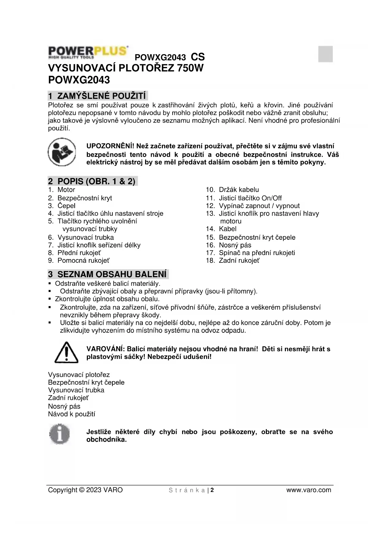 - Uložte si balicí materiály na co nejdelší dobu, nejlépe až do konce záruční doby. Potom je zlikvidujte vyhozením do místního systému na odvoz odpadu. VAROVÁNÍ: Balicí materiály nejsou vhodné na hraní! Děti si nesmějí hrát s plastovými sáčky! Nebezpečí udušení! Vysunovací plotořez Bezpečnostní kryt čepele Vysunovací trubka Zadní rukojeť Nosný pás Návod k použití Jestliže některé díly chybí nebo jsou poškozeny, obraťte se na svého obchodníka.POWXG2043 CS Copyright © 2023 VARO S t r á n k a | 3 www.varo.com 4 SYMBOLY V této příručce a/nebo na stroji se používají následující symboly: