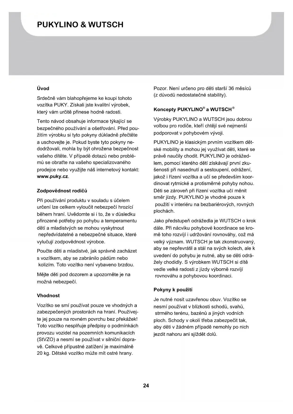 Výrobky PUKYLINO a WUTSCH jsou dobrou volbou pro rodiče, kteří chtějí své nejmenší podporovat v pohybovém vývoji. PUKYLINO je klasickým prvním vozítkem dět- ské mobility a mohou jej využívat děti, které se právě naučily chodit. PUKYLINO je odrážed- lem, pomocí kterého dětí získávají první zku- šenosti při nasednutí a sestoupení, odrážení, jakož i řízení vozítka a učí se především koor- dinovat rytmické a protisměrné pohyby nohou. Děti se zároveň při řízení vozítka učí měnit směr jízdy. PUKYLINO je vhodné pouze k použití v interiéru na bezbariérových, rovných plochách. Jako předstupeň odrážedla je WUTSCH o krok dále. Při nácviku pohybové koordinace se kro- mě toho rozvíjí i udržování rovnováhy, což má velký význam. WUTSCH je tak zkonstruovaný, aby se nepřevrátil a stál na svých kolech, ale k uvedení do pohybu je nutné, aby se děti odrá- žely chodidly. S výrobkem WUTSCH si dítě vedle velké radosti z jízdy výborně rozvíjí rovnováhu a pohybovou koordinaci. Pokyny k použití Je nutné nosit uzavřenou obuv. Vozítko se nesmí používat v blízkosti schodů, svahů, strmého terénu, bazénů a jiných vodních ploch. Schody v okolí třeba zabezpečit tak, aby děti v žádném případě nemohly po nich jezdit nahoru ani sjíždět dolů.25 PUKYLINO & WUTSCH Návod k obsluze CZ Platí zákonem předepsaná záruka na věcné nedostatky. Škody, které vzniknou v důsledku neodborného namáhání, násilného zásahu, nedostatečné údržby nebo v důsledku běžné- ho opotřebování, jsou vyloučeny ze záruky na věcné nedostatky. Označení CE Vozítko splňuje požadavky evropské směrnice 2009/48/ES o bezpečnosti hraček, a proto je opatřeno označením CE. Typový štítek Typový štítek se nachází zespodu na zadním rámu. Zaznamenejte si údaje uvedené na typovém štítku do průkazu vozítka na konci tohoto návodu k obsluze, abyste je měli vždy po ruce v případě dotazů nebo objednávání náhradních dílů. Údržba a ošetřování Před každým použitím zkontrolujte všechny díly ohledně možného opotřebování, jakož i šroubové spoje ohledně řádného usazení. Samopojistné matice mají těžký chod a musejí se po úplné demontáži vyměnit. Aby se zachovala konstrukční úroveň bezpeč- nosti, je nutné okamžitě vyměnit opotřebované nebo vadné díly za originální náhradní díly PUKY. Z bezpečnostních důvodů by se vozítko až do provedení opravy nemělo používat. Ohnuté díly nerovnejte, ale vyměňte. Rychle opotřebitelné díly: kola, doraz nápravy (jen u WUTSCH) Vozítko se nesmí čistit vysokotlakým čisticím zařízením! Vozítko čistěte slabým mýdlovým roztokem a poté jej důkladně vysušte měkkou utěrkou. Vozítko nenechávejte v blízkosti ma- teriálů, které urychlují korozi (posypová sůl, mořská voda, hnojiva). Vozítko se nesmí skla- dovat ve vlhkých prostorách. Vybalení a rozsah dodávky K otevření balení a odstranění ochranného materiálu nepoužívejte ostré předměty. Mohli byste tím neúmyslně poškodit lakování nebo díly vozítka. ❚ Vyjměte všechny díly z obalu. ❚ Odstraňte ochranný materiál. Držte jakýkoliv obalový materiál mimo dosah dětí, nebezpe- čí zadušení. ❚ Zkontrolujte úplnost a neporušenost dodáv- ky. Pokud by něco chybělo, obraťte se před zahájením dalších prací na svého speciali- zovaného prodejce. Rozsah dodávky PUKYLINO