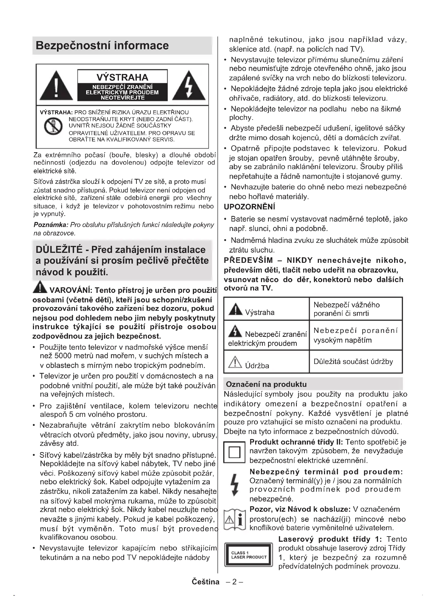 Laserový produkt třídy 1: Tento produkt obsahuje laserový zdroj Třídy 1, který je bezpečný za rozumně předvídatelných podmínek provozu.Čeština – 3 – UPOZORNĚNÍ Dejte pozor, ať baterie nespolknete, hrozí nebezpečí chemického popálení Tento výrobek nebo jeho příslušenství dodávané s výrobkem může obsahovat knoflíkovou/mincovou baterii. Pokud dojde k požití knoíkové baterie, může to způsobit vážné vnitřní popáleniny během 2 hodin a může to vést ke smrti. Udržujte nové a použité baterie mimo dosah dětí. Pokud část s baterií není možné bezpečně uzavřít, přestaňte výrobek používat a odložte ho mimo dosah dětí. Pokud si myslíte, že baterie byly spolknuty nebo vloženy do jakékoliv části těla, okamžitě vyhledejte lékařskou pomoc. – – – – – – – – – – – – Varování nebezpečí nestability TV může spadnout a způsobit vážné zranění nebo smrt. Velkému množství zranění, najme dětí, je možné se vyhnout jednoduchými opatřeními: