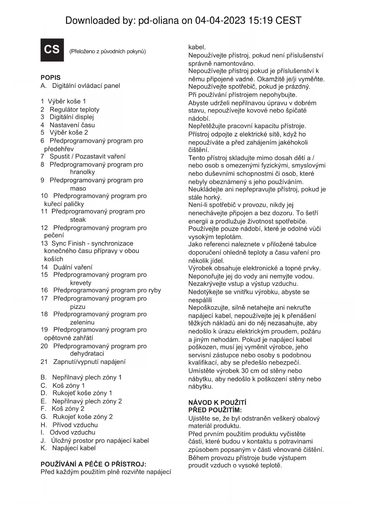 Βγαίνει άσπρος καπνός από τη συσκευή. Μαγειρεύονται συστατικά με υψηλή περιεκτικότητα σε λάδι. Προστέθηκε λάδι κατά τη διάρκεια του μαγειρέματος. Μη χρησιμοποιείτε τρόφιμα με υψηλή περιεκτικότητα σε λάδι ούτε να προσθέτετε επιπλέον λάδι από το απολύτως απαραίτητο. Αυτή η φριτέζα χρησιμοποιεί μια τεχνολογία που απαιτεί λίγο ή καθόλου λάδι. Το τηγάνι περιέχει ακόμη υπολείμματα λίπους από την προηγούμενη χρήση. Ο λευκός καπνός εκπέμπεται λόγω του λίπους που θερμαίνεται στον κάδο. Downloaded by: pd-oliana on 04-04-2023 15:19 CESTCS (Přeloženo z původních pokynů) POPIS A. Digitální ovládací panel 1 Výběr koše 1 2 Regulátor teploty 3 Digitální displej 4 Nastavení času 5 Výběr koše 2 6 Předprogramovaný program pro předehřev 7 Spustit / Pozastavit vaření 8 Předprogramovaný program pro hranolky 9 Předprogramovaný program pro maso 10 Předprogramovaný program pro kuřecí paličky 11 Předprogramovaný program pro steak 12 Předprogramovaný program pro pečení 13 Sync Finish - synchronizace konečného času přípravy v obou koších 14 Duální vaření 15 Předprogramovaný program pro krevety 16 Předprogramovaný program pro ryby 17 Předprogramovaný program pro pizzu 18 Předprogramovaný program pro zeleninu 19 Předprogramovaný program pro opětovné zahřátí 20 Předprogramovaný program pro dehydrataci 21 Zapnutí/vypnutí napájení B. Nepřilnavý plech zóny 1 C. Koš zóny 1 D. Rukojeť koše zóny 1 E. Nepřilnavý plech zóny 2 F. Koš zóny 2 G. Rukojeť koše zóny 2 H. Přívod vzduchu