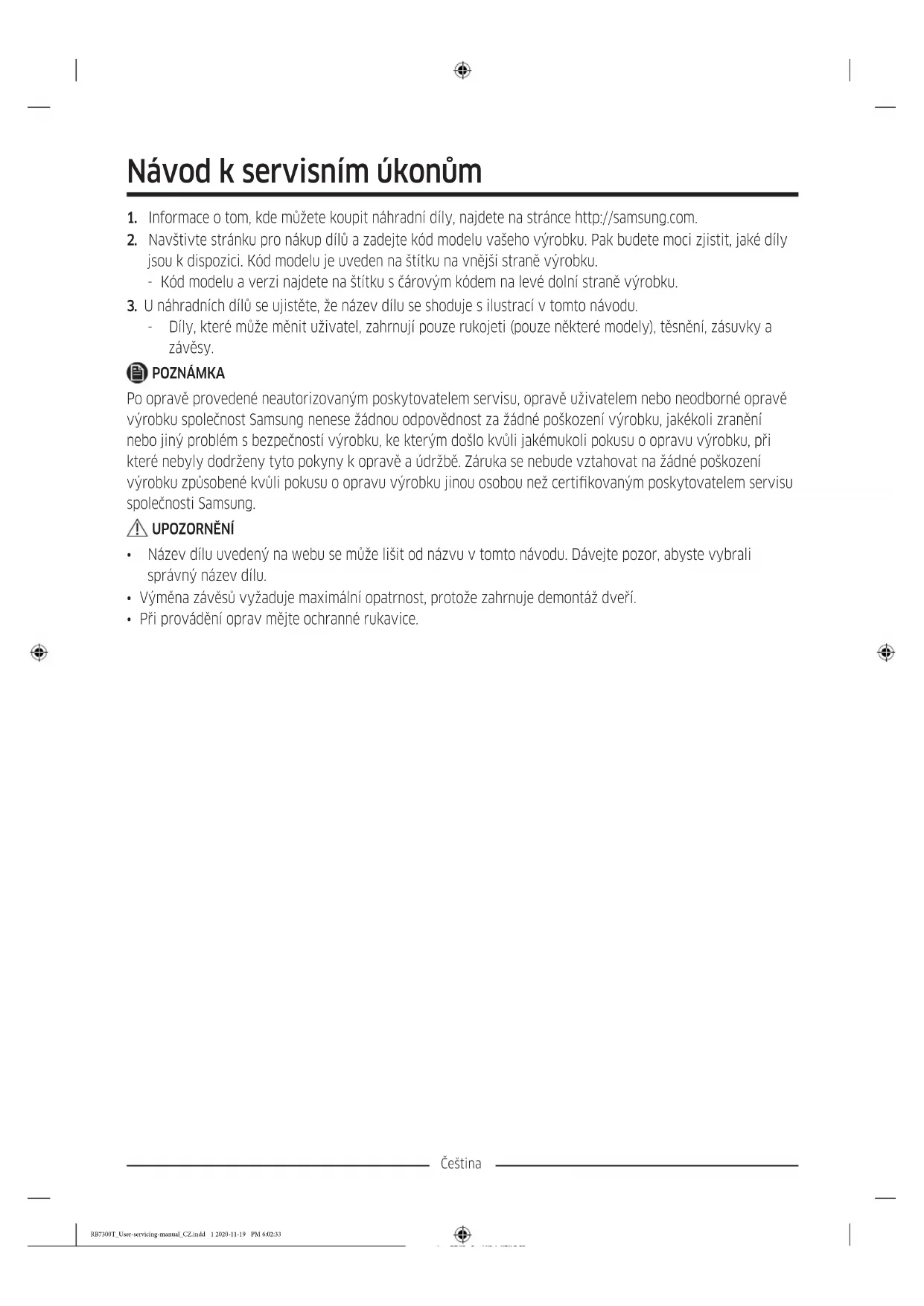 - Při provádění oprav mějte ochranné rukavice. RB7300T_User-servicing-manual_CZ.indd 1 2020-11-19 PM 6:02:33Čeština Skutečný vzhled a součásti chladničky se mohou od obrázku v závislosti na modelu a zemi, ve které se nacházíte, lišit.