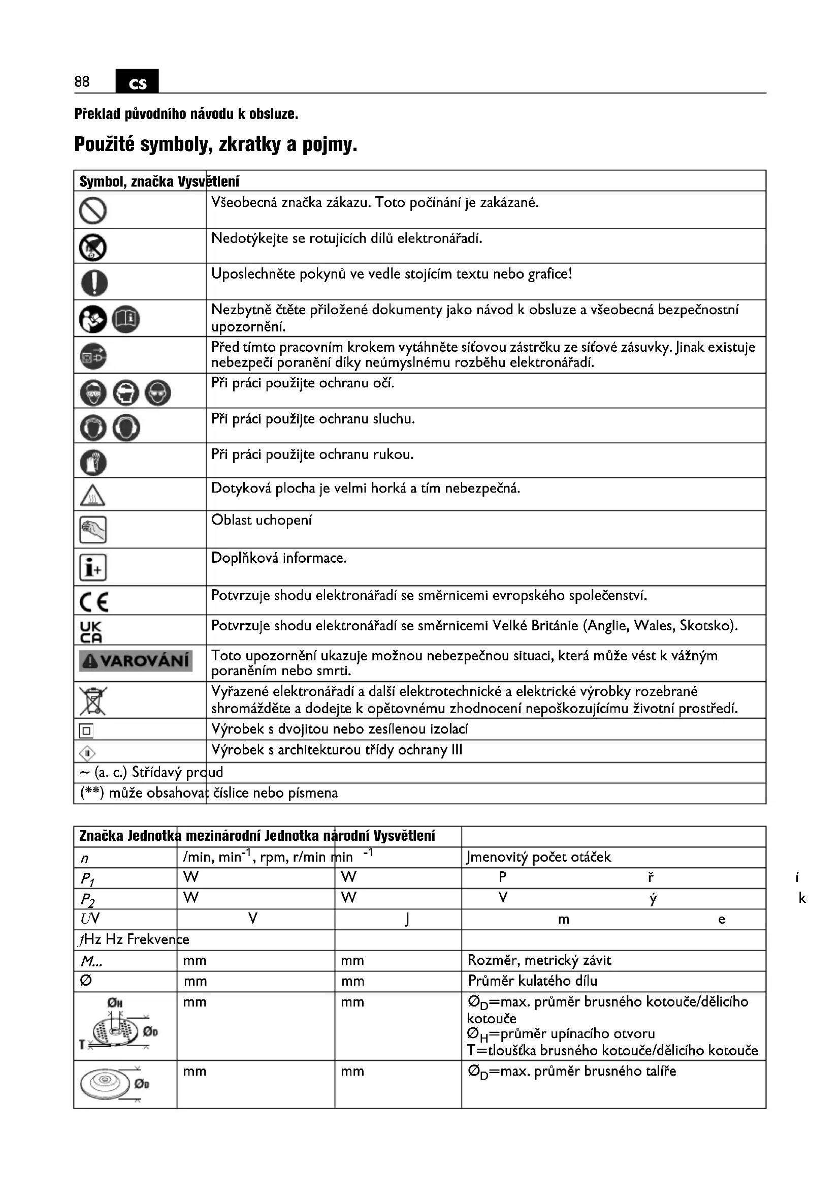 Překlad původního návodu k obsluze. Použité symboly, zkratky a pojmy. Symbol, značka Vysvětlení Všeobecná značka zákazu. Toto počínání je zakázané. Nedotýkejte se rotujících dílů elektronářadí. Uposlechněte pokynů ve vedle stojícím textu nebo grafice! Nezbytně čtěte přiložené dokumenty jako návod k obsluze a všeobecná bezpečnostní upozornění. Před tímto pracovním krokem vytáhněte síťovou zástrčku ze síťové zásuvky. Jinak existuje nebezpečí poranění díky neúmyslnému rozběhu elektronářadí. Při práci použijte ochranu očí. Při práci použijte ochranu sluchu. Při práci použijte ochranu rukou. Dotyková plocha je velmi horká a tím nebezpečná. Oblast uchopení Doplňková informace. Potvrzuje shodu elektronářadí se směrnicemi evropského společenství. Potvrzuje shodu elektronářadí se směrnicemi Velké Británie (Anglie, Wales, Skotsko). Toto upozornění ukazuje možnou nebezpečnou situaci, která může vést k vážným poraněním nebo smrti. Vyřazené elektronářadí a další elektrotechnické a elektrické výrobky rozebrané shromážděte a dodejte k opětovnému zhodnocení nepoškozujícímu životní prostředí. Výrobek s dvojitou nebo zesílenou izolací Výrobek s architekturou třídy ochrany III ~ (a. c.) Střídavý proud (**) může obsahovat číslice nebo písmena Značka Jednotka mezinárodní Jednotka národní Vysvětlení