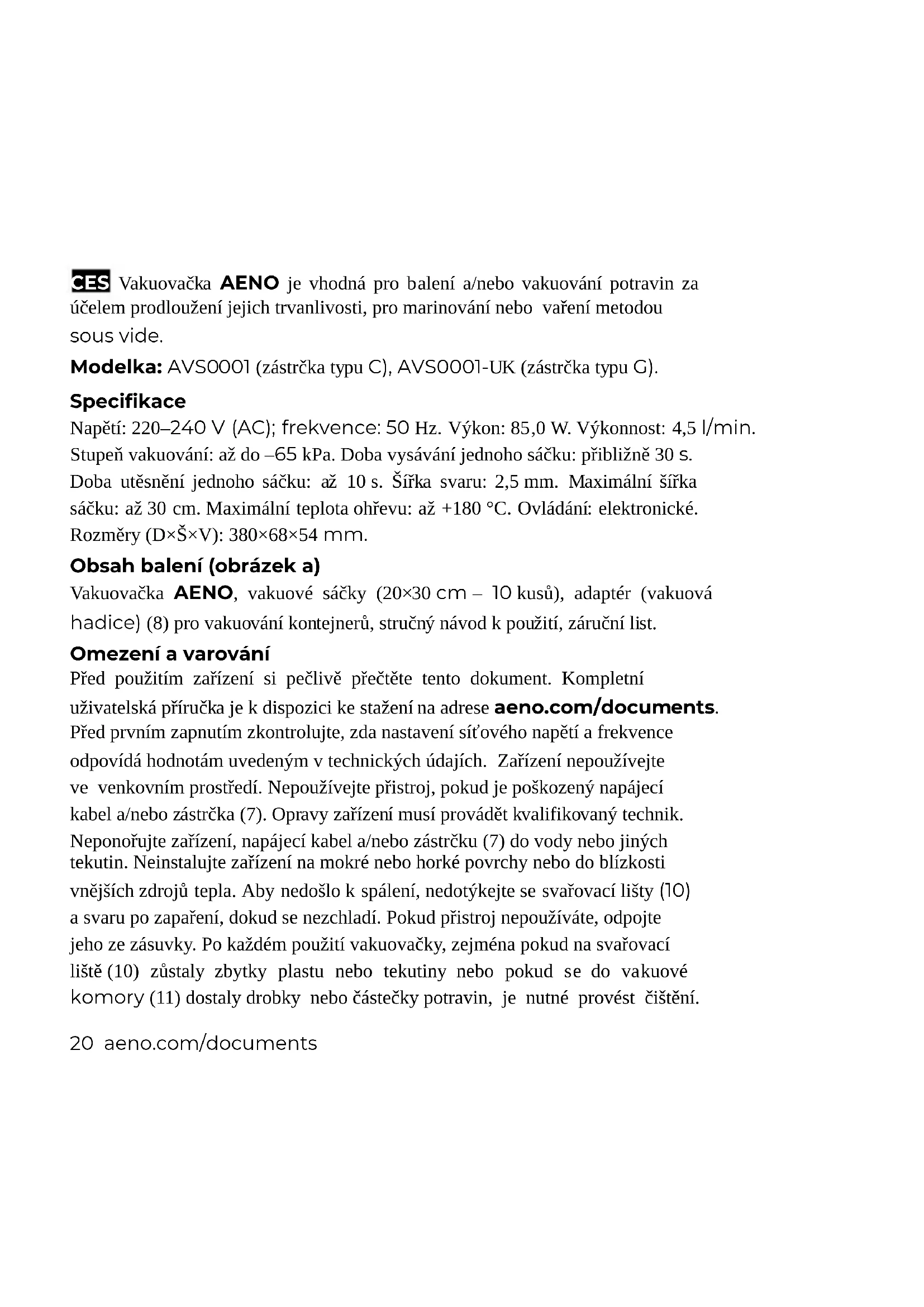 ASBISc си запазва правото да модифицира устройството и да прави промени и допълнения в този документ без предварително уведомяване на потребителите. Гаранционният срок и експлоатационният живот са 2 години от датата на закупуване на продукта. Данни за производителя: ASBISc Enterprises PLC, Iapetou, 1, Agios Athanasios, 4101, Limassol, Cyprus (Кипър). Произведено в Китай. Актуалната информация и подробните описания на устройствата, както и инструкциите за свързване, сертификатите, претенциите за качество и гаранционната информация са достъпни за изтегляне на адрес aeno.com/documents. Всички споменати търговски марки и имена на марки са собственост на съответните им собственици.20 aeno.com/documents CES Vakuovačka AENO je vhodná pro balení a/nebo vakuování potravin za účelem prodloužení jejich trvanlivosti, pro marinování nebo vaření metodou sous vide. Modelka: AVS0001 (zástrčka typu C), AVS0001-UK (zástrčka typu G). Specifikace Napětí: 220‒240 V (AC); frekvence: 50 Hz. Výkon: 85,0 W. Výkonnost: 4,5 l/min. Stupeň vakuování: až do –65 kPa. Doba vysávání jednoho sáčku: přibližně 30 s. Doba utěsnění jednoho sáčku: až 10 s. Šířka svaru: 2,5 mm. Maximální šířka sáčku: až 30 cm. Maximální teplota ohřevu: až +180 °C. Ovládání: elektronické. Rozměry (D׊×V): 380×68×54 mm. Obsah balení (obrázek a) Vakuovačka AENO, vakuové sáčky (20×30 cm ‒ 10 kusů), adaptér (vakuová hadice) (8) pro vakuování kontejnerů, stručný návod k použití, záruční list. Omezení a varování Před použitím zařízení si pečlivě přečtěte tento dokument. Kompletní uživatelská příručka je k dispozici ke stažení na adrese aeno.com/documents. Před prvním zapnutím zkontrolujte, zda nastavení síťového napětí a frekvence odpovídá hodnotám uvedeným v technických údajích. Zařízení nepoužívejte ve venkovním prostředí. Nepoužívejte přistroj, pokud je poškozený napájecí kabel a/nebo zástrčka (7). Opravy zařízení musí provádět kvalifikovaný technik. Neponořujte zařízení, napájecí kabel a/nebo zástrčku (7) do vody nebo jiných tekutin. Neinstalujte zařízení na mokré nebo horké povrchy nebo do blízkosti vnějších zdrojů tepla. Aby nedošlo k spálení, nedotýkejte se svařovací lišty (10) a svaru po zapaření, dokud se nezchladí. Pokud přistroj nepoužíváte, odpojte jeho ze zásuvky. Po každém použití vakuovačky, zejména pokud na svařovací liště (10) zůstaly zbytky plastu nebo tekutiny nebo pokud se do vakuové komory (11) dostaly drobky nebo částečky potravin, je nutné provést čištění.aeno.com/documents 21 Odpojte přístroj od sítě vyjmutím zástrčky napájecího kabelu (7) ze zásuvky a nechte jej vychladnout. Otřete jeho povrch měkkým hadříkem namočeným v teplé vodě nebo jemném mýdlovém roztoku. Poté otřete měkkým hadříkem navlhčeným čistou vodou a utřete do sucha. Nepoužívejte drsné čisticí prostředky, abrazivní pasty, leštidla ani čisticí prostředky obsahující kyseliny nebo rozpouštědla. Použijte vakuovačku k vakuování a/nebo utěsnění pouze suchých potravin. Zařízení není určene k manipulaci s mokrými nebo tekutými potravinami. Používejte pouze speciální sáčky a kontejnery pro vakuovačky. Adaptér (vakuová hadice) (8) dodávaný s vakuovačkou se používá pouze k odvádění vzduchu ze speciálních vakuových kontejnerů. Před vložením potravin zabalených v sáčku nebo v nádobě do mikrovlnné trouby udělejte do sáčku otvor nebo otevřete výstupní ventil (13) v kontejneru, aby mohla unikat pára. Používejte pouze příslušenství, spotřební materiál a/nebo náhradní díly doporučené výrobcem. Podrobné informace naleznete v úplné příručce, která je k dispozici ke stažení na adrese aeno.com/documents. Nenechávejte přistroj zapnutý bez dozoru. Po použití nechte přistroj vychladnout. Zařízení mohou používat osoby se sníženou pohyblivostí pouze pod přímým dohledem a kontrolou. Pokud přistroj nepoužíváte, aby se těsnění (9) nedeformovalo a neohrozilo výkon zařízení, doporučuje se vložit do vakuovačky papírovou vložku a volně zavřít víko bez uzamčení zámků víka (12). Nedovolte dětem, aby zařízení používaly a/nebo si s ním hrály. Správa zařízení Před prvním zapnutím vakuovačky se ujistěte, že jste z ní odstranili veškerý obalový materiál. Utěsnění sáčků