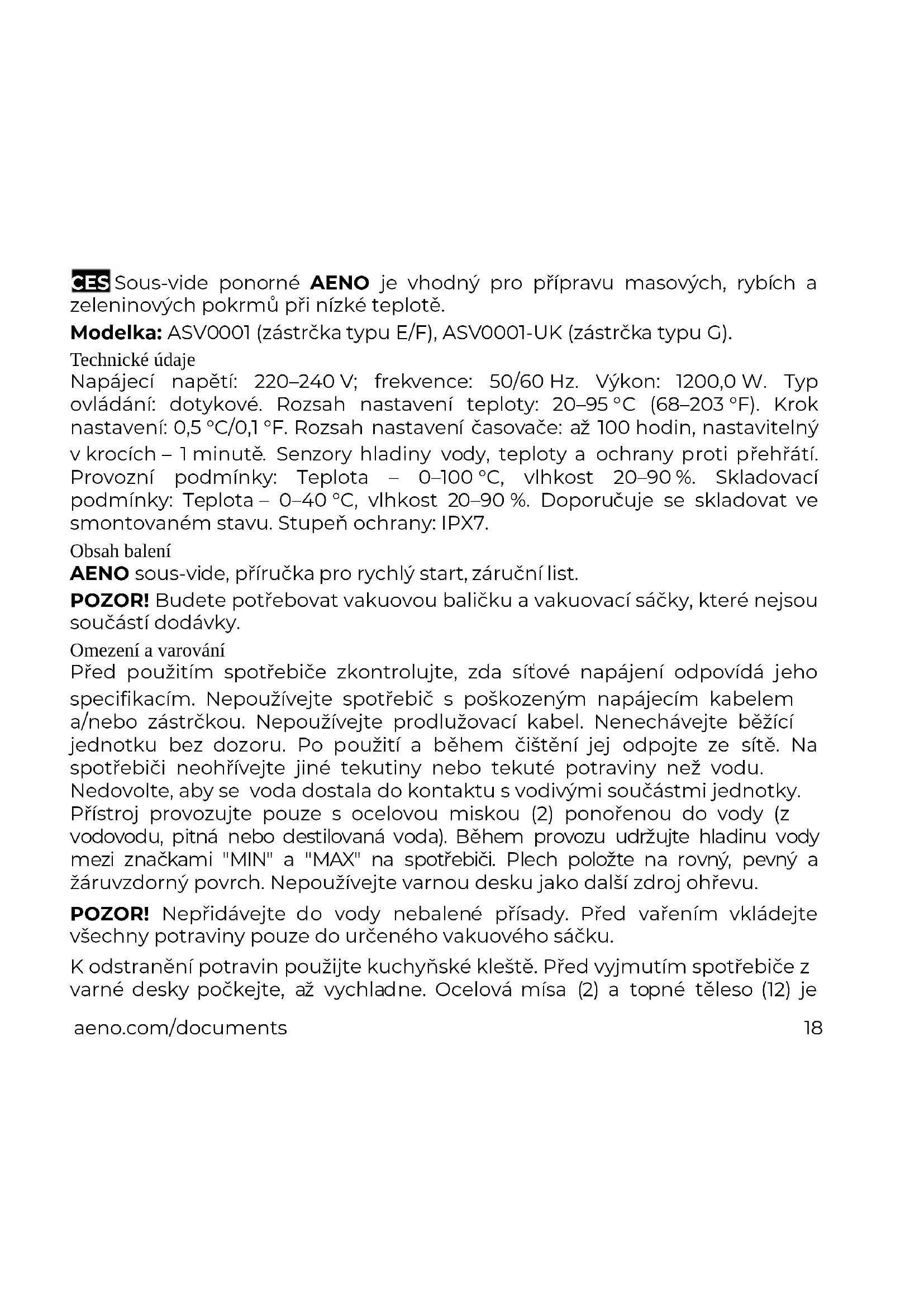 CES Sous-vide ponorné AENO je vhodný pro přípravu masových, rybích a zeleninových pokrmů při nízké teplotě. Modelka: ASV0001 (zástrčka typu E/F), ASV0001-UK (zástrčka typu G). Technické údaje Napájecí napětí: 220–240 V; frekvence: 50/60 Hz. Výkon: 1200,0 W. Typ ovládání: dotykové. Rozsah nastavení teploty: 20–95 °C (68–203 °F). Krok nastavení: 0,5 °C/0,1 °F. Rozsah nastavení časovače: až 100 hodin, nastavitelný v krocích – 1 minutě. Senzory hladiny vody, teploty a ochrany proti přehřátí. Provozní podmínky: Teplota – 0–100 °C, vlhkost 20–90 %. Skladovací podmínky: Teplota – 0–40 °C, vlhkost 20–90 %. Doporučuje se skladovat ve smontovaném stavu. Stupeň ochrany: IPX7. Obsah balení AENO sous-vide, příručka pro rychlý start, záruční list. POZOR! Budete potřebovat vakuovou baličku a vakuovací sáčky, které nejsou součástí dodávky. Omezení a varování Před použitím spotřebiče zkontrolujte, zda síťové napájení odpovídá jeho specifikacím. Nepoužívejte spotřebič s poškozeným napájecím kabelem a/nebo zástrčkou. Nepoužívejte prodlužovací kabel. Nenechávejte běžící jednotku bez dozoru. Po použití a během čištění jej odpojte ze sítě. Na spotřebiči neohřívejte jiné tekutiny nebo tekuté potraviny než vodu. Nedovolte, aby se voda dostala do kontaktu s vodivými součástmi jednotky. Přístroj provozujte pouze s ocelovou miskou (2) ponořenou do vody (z vodovodu, pitná nebo destilovaná voda). Během provozu udržujte hladinu vody mezi značkami "MIN" a "MAX" na spotřebiči. Plech položte na rovný, pevný a žáruvzdorný povrch. Nepoužívejte varnou desku jako další zdroj ohřevu. POZOR! Nepřidávejte do vody nebalené přísady. Před vařením vkládejte všechny potraviny pouze do určeného vakuového sáčku. K odstranění potravin použijte kuchyňské kleště. Před vyjmutím spotřebiče z varné desky počkejte, až vychladne. Ocelová mísa (2) a topné těleso (12) je19 aeno.com/documents 有 关 设 备 的 最 新 信 息 和 详 细 描 述 , 以 及 受 理 与 质 量 和 质 保 相 关 索 赔 的 公 司 的 证 明 、 证 书 、 信 息 可 以 在 下 列 链 接 中 下 载 : aeno.com/documents。所有这些商标及其名称均为其各自所有者的财产