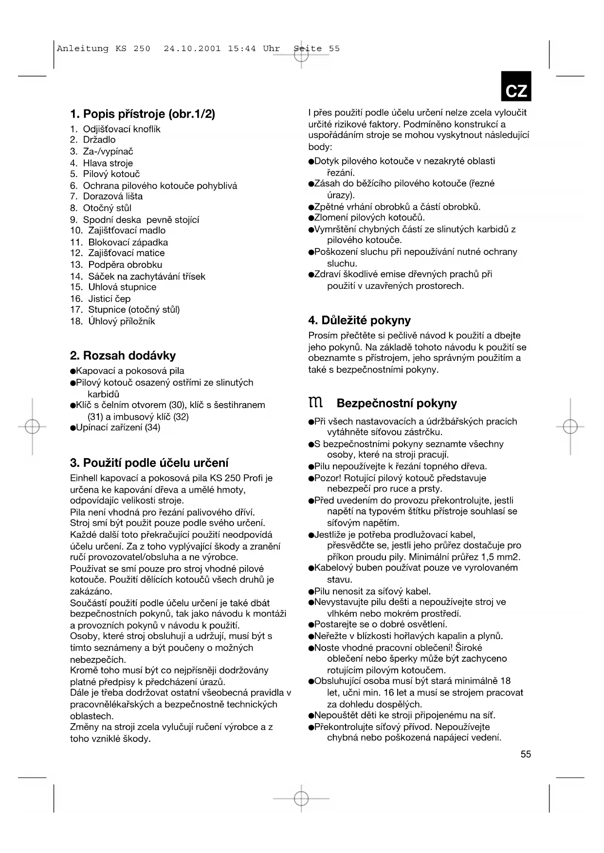 Anleitung KS 250 24.10.2001 15:44 Uhr Seite 55 Pracoviště udržujte bez dřevných odpadů a povalujících se dílů. Na stroji pracující osoby nesmí být rozptylovány. Dbejte na směr otáčení motoru a pilového kotouče. Pilový kotouč nesmí být v žádném případě po vypnutí pohonu zabrzďován postranním protitlakem. Používejte pouze naostřené, trhlin prosté a nezdeformované pilové kotouče. Na stroji smí být používány pouze nástroje, které odpovídají prEN 847-1:1996. Chybné pilové kotouče musí být okamžitě vyměněny. Nesmí být používány pilové kotouče, které neodpovídají parametrům udaným v tomto návodu k použití. Je třeba zajistit, aby šipka na pilovém kotouči souhlasila se šipkou na přístroji. Ujistěte se, zda se pilový kotouč v žádné poloze nedotýká otočného stolu a to tak, že při vytažené síťové zástrčce pilový kotouč rukou otáčíte v poloze 45° a 90°. Hlavu pily popřípadě podle bodu C/F nově justovat. Je třeba zajistit, aby všechna zařízení zakrývající pilový kotouč bezvadně pracovala. Pohyblivý ochranný kryt nesmí být v otevřeném stavu sevřen. Bezpečnostní zařízení na stroji nesmí být demontována nebo být vyřazena z provozu. Poškozená nebo chybná ochranná zařízení je nutno neprodleně vyměnit. Neřežte obrobky, které jsou moc malé na to, abyste je mohli bezpečně držet v ruce. Vyhýbejte se nešikovným pozicím rukou, při kterých by se náhlým uklouznutím mohla jedna nebo obě ruce dotknout pilového kotouče. U dlouhých obrobků je potřebná přídavná podkládací plocha (stůl, kozy, atd.), aby bylo zabráněno klopení stroje. Kulaté obrobky, jako kolíkové tyče atd., musí být vždy upnuty vhodným zařízením. V řezaném obrobku se nesmí nacházet hřebíky nebo jiná cizí tělesa. Pracovní poloha vždy stranou pilového kotouče. Stroj nezatěžovat tak dalece, aby se zastavil. Tlačte obrobek vždy pevně proti pracovní desce a dorazové liště, aby se zabránilo viklání popř. přetáčení obrobku. Zajistěte, aby se odřezané části nechaly odstranit bočně od pilového kotouče. Jinak by mohly být pilovým kotoučem zachyceny a vymrštěny. Neřežte nikdy více obrobků současně. Neodstraňujte nikdy volně ležící třísky, piliny nebo zaklíněné části dřeva při běžícím pilovém kotouči. K odstranění poruch nebo zaklíněných kusů dřeva stroj vypnout. - Vytáhnout síťovou zástrčku - Přezbrojení, jako též nastavovací, měřicí a čisticí práce provádět pouze při vypnutém motoru. - Vytáhnout síťovou zástrčku - Před zapnutím překontrolujte, jestli jsou klíče a nastavovací nástroje odstraněny. Při opuštění pracoviště vypnout motor a vytáhnout síťovou zástrčku. Elektroinstalace, opravy a údržbářské práce smí být prováděny pouze odborníky. Veškerá ochranná a bezpečnostní zařízení musí být po ukončené opravě nebo údržbě ihned znovu namontována. Musí být dodržovány bezpečnostní, pracovní a údržbářské pokyny výrobce a také rozměry udané v technických datech. Je třeba dbát příslušných bezpečnostních předpisů a jiných, všeobecně platných bezpečnostně technických pravidel. Dbát brožurek s informacemi oborových profesních organizací (VBG 7j). Při každé činnosti připojte zařízení na odsávání prachu. Provoz v uzavřených prostorách je přípustný pouze s vhodným odsávacím zařízením. Kapovací pila musí být připojena na 230 V zásuvku s ochranným kolíkem, s minimálním jištěním 10 A. Nepoužívejte stroje se slabým výkonem pro těžké práce. Nepoužívejte kabel k účelům, ke kterým není určen! Postarejte se o bezpečný postoj a udržujte vždy rovnováhu. Překontrolujte nástroj jestli nevykazuje eventuální poškození! Před dalším použitím nástroje musí být ochranná zařízení nebo lehce poškozené části pečlivě překontrolovány, jestli bezvadně a podle způsobu určení fungují. Překontrolujte, jestli pohyblivé části bezvadně fungují a neváznou nebo jestli nejsou některé části poškozeny. Veškeré součásti musí být správně namontovány a splňovat všechny podmínky, aby byl zajištěn bezvadný provoz nástroje. Poškozená ochranná zařízení a části musí být odborně opraveny nebo vyměněny uznanou odbornou dílnou, pokud není v návodu k použití nic jiného uvedeno.