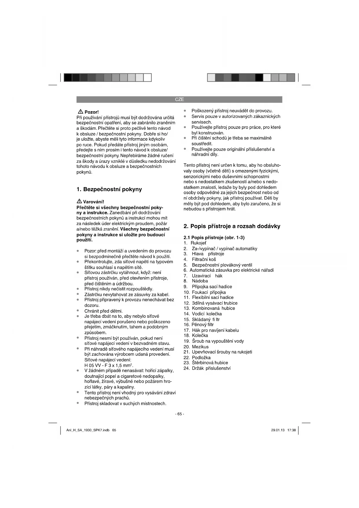Montáž hlavy přístroje (obr. 6) Hlava přístroje (3) je na nádobě (8) připevněna pomocí uzavíracích háků (7). K sejmutí hlavy přístroje (3) uzavírací háky (7) otevřít a hlavu přístroje (3) sejmout. Při montáži hlavy přístroje (3) dbát na správné zacvaknutí uzavíracích háků (7). Montáž koleček (obr. 5) Kolečka namontujte podle obrázku 5. Anl_H_SA_1930_SPK7.indb 66Anl_H_SA_1930_SPK7.indb 66 29.01.13 17:3829.01.13 17:38CZE
