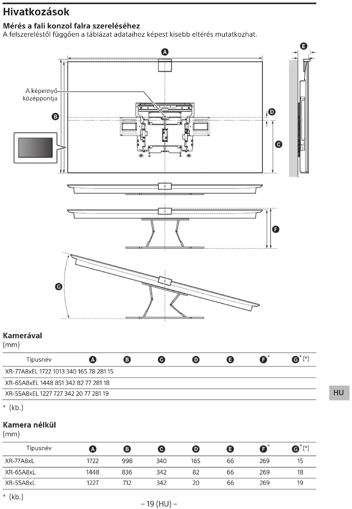 Rozměry: (přibl.) [mm] a : 354 b : 116 c : 77 d : 563 e : 533 f : 370 g : 368 h : 350 i : 11 Hmotnost (pouze základna): (přibl.) [kg] 3,0 Vzhled a technické údaje se mohou bez předchozího upozornění změnit.− 18 (CZ) − Referenční údaje Měření pro montáž nástěnného držáku na zeď Hodnoty v tabulce se v závislosti na instalaci mohou mírně lišit. Střed obrazovky S kamerou (mm) Název modelu