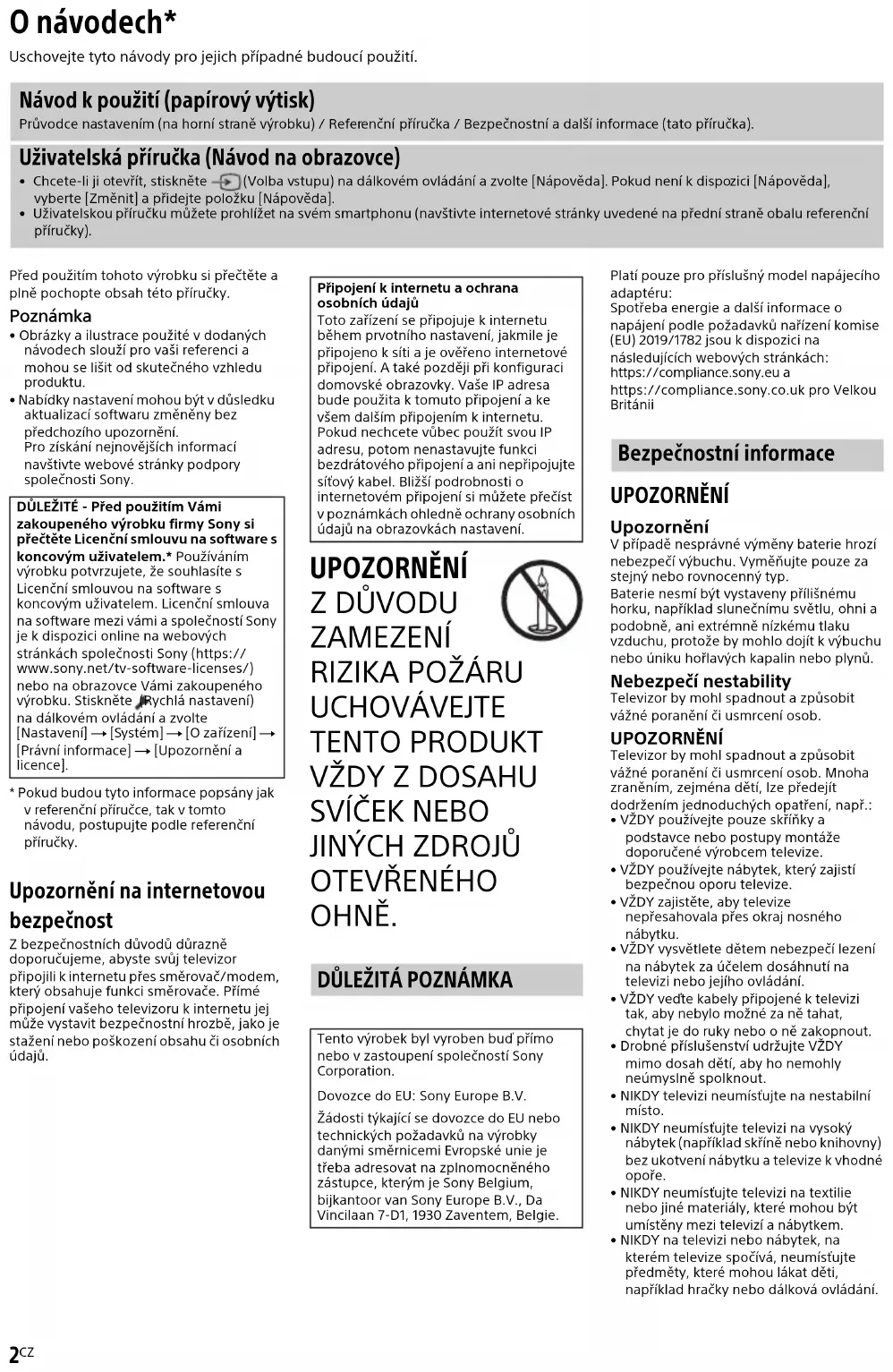 OHNĚ. Platí pouze pro příslušný model napájecího adaptéru:Spotřeba energie a další informace o napájení podle požadavků nařízení komise (EU) 2019/1782 jsou k dispozici na následujících webových stránkách:https://compliance.sony.eu ahttps://compliance.sony.co.uk pro Velkou Británii UPOZORNĚNÍ Upozornění V případě nesprávné výměny baterie hrozí nebezpečí výbuchu. Vyměňujte pouze za stejný nebo rovnocenný typ.Baterie nesmí být vystaveny přílišnému horku, například slunečnímu světlu, ohni a podobně, ani extrémně nízkému tlaku vzduchu, protože by mohlo dojít k výbuchu nebo úniku hořlavých kapalin nebo plynů. Nebezpečí nestability Televizor by mohl spadnout a způsobit vážné poranění či usmrcení osob. UPOZORNĚNÍ Televizor by mohl spadnout a způsobit vážné poranění či usmrcení osob. Mnoha zraněním, zejména dětí, lze předejít dodržením jednoduchých opatření, např.:• VŽDY používejte pouze skříňky a podstavce nebo postupy montáže doporučené výrobcem televize.• VŽDY používejte nábytek, který zajistí bezpečnou oporu televize.• VŽDY zajistěte, aby televize nepřesahovala přes okraj nosného nábytku.• VŽDY vysvětlete dětem nebezpečí lezení na nábytek za účelem dosáhnutí na televizi nebo jejího ovládání.• VŽDY veďte kabely připojené k televizi tak, aby nebylo možné za ně tahat, chytat je do ruky nebo o ně zakopnout.• Drobné příslušenství udržujte VŽDY mimo dosah dětí, aby ho nemohly neúmyslně spolknout.• NIKDY televizi neumísťujte na nestabilní místo.• NIKDY neumísťujte televizi na vysoký nábytek (například skříně nebo knihovny) bez ukotvení nábytku a televize k vhodné opoře.• NIKDY neumísťujte televizi na textilie nebo jiné materiály, které mohou být umístěny mezi televizí a nábytkem.• NIKDY na televizi nebo nábytek, na kterém televize spočívá, neumísťujte předměty, které mohou lákat děti, například hračky nebo dálková ovládání. O návodech* Uschovejte tyto návody pro jejich případné budoucí použití. Návod k použití (papírový výtisk) Průvodce nastavením (na horní straně výrobku) / Referenční příručka / Bezpečnostní a další informace (tato příručka). Uživatelská příručka (Návod na obrazovce)