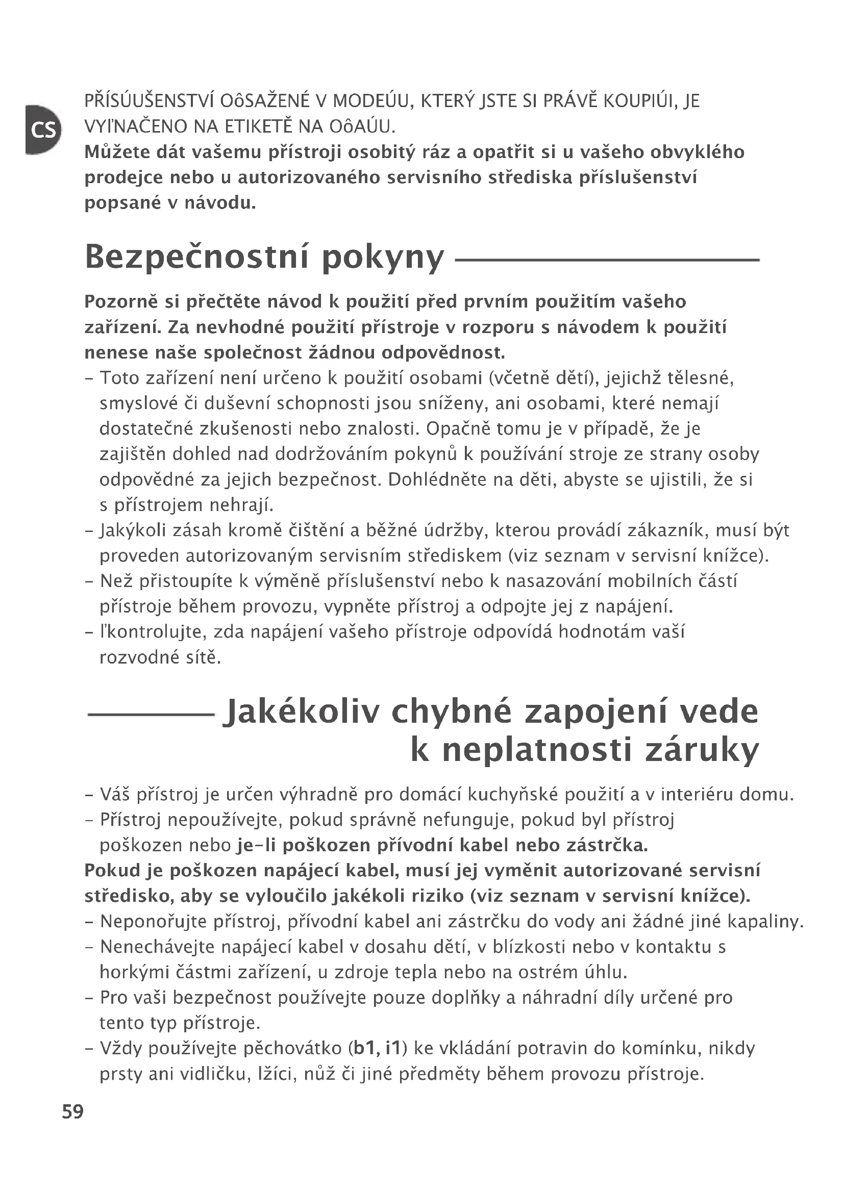 Soovitused Kui tarvikud on toiduainetelt värvi võtnud (porganditelt, apelsinidelt jms), hõõruge neid toiduõliga immutatud lapiga, misjärel puhastage nagu tavaliselt. Mida teha tõrgete esinemisel seadme töös? Tõrgete esinemisel seadme töös kontrollige järgmist: - seadme ühendatus vooluvõrku; - kõigi tarvikute kinnitatus. Teie seade tõrgub jätkuvalt? Pöörduge volitatud teenindusettevõtte poole (tutvuge loeteluga hooldusraamatus). Elektroonilise seadme kasutuselt eemaldamine Säästkem keskkonda! Teie seade sisaldab paljusid taaskasutatavaid ja ümbertöödeldavaid materjale. Viige jäätmed kogumispunkti või volitatud hoolduskeskusesse. Pakkematerjalide ja seadme utiliseerimine Pakend on valmistatud ainult keskkonnasäästlikest materjalidest, mille võib ära visata vastavalt kehtivale materjalide käitlemist reguleerivale seadusandlusele. Teabe saamiseks seadme äraviskamise kohta pöörduge lähima kohaliku jäätmekogumisjaama poole.PŘÍSLUŠENSTVÍ OBSAŽENÉ V MODELU, KTERÝ JSTE SI PRÁVĚ KOUPILI, JE VYZNAČENO NA ETIKETĚ NA OBALU. Můžete dát vašemu přístroji osobitý ráz a opatřit si u vašeho obvyklého prodejce nebo u autorizovaného servisního střediska příslušenství popsané v návodu. Bezpečnostní pokyny Pozorně si přečtěte návod k použití před prvním použitím vašeho zařízení. Za nevhodné použití přístroje v rozporu s návodem k použití nenese naše společnost žádnou odpovědnost. - Toto zařízení není určeno k použití osobami (včetně dětí), jejichž tělesné, smyslové či duševní schopnosti jsou sníženy, ani osobami, které nemají dostatečné zkušenosti nebo znalosti. Opačně tomu je v případě, že je zajištěn dohled nad dodržováním pokynů k používání stroje ze strany osoby odpovědné za jejich bezpečnost. Dohlédněte na děti, abyste se ujistili, že si s přístrojem nehrají. - Jakýkoli zásah kromě čištění a běžné údržby, kterou provádí zákazník, musí být proveden autorizovaným servisním střediskem (viz seznam v servisní knížce). - Než přistoupíte k výměně příslušenství nebo k nasazování mobilních částí přístroje během provozu, vypněte přístroj a odpojte jej z napájení. - Zkontrolujte, zda napájení vašeho přístroje odpovídá hodnotám vaší rozvodné sítě. Jakékoliv chybné zapojení vede kIneplatnosti záruky - Váš přístroj je určen výhradně pro domácí kuchyňské použití a v interiéru domu. - Přístroj nepoužívejte, pokud správně nefunguje, pokud byl přístroj poškozen nebo je-li poškozen přívodní kabel nebo zástrčka. Pokud je poškozen napájecí kabel, musí jej vyměnit autorizované servisní středisko, aby se vyloučilo jakékoli riziko (viz seznam v servisní knížce). - Neponořujte přístroj, přívodní kabel ani zástrčku do vody ani žádné jiné kapaliny. - Nenechávejte napájecí kabel v dosahu dětí, v blízkosti nebo v kontaktu s horkými částmi zařízení, u zdroje tepla nebo na ostrém úhlu. - Pro vaši bezpečnost používejte pouze doplňky a náhradní díly určené pro tento typ přístroje. - Vždy používejte pěchovátko ( b1, i1) ke vkládání potravin do komínku, nikdy prsty ani vidličku, lžíci, nůž či jiné předměty během provozu přístroje.