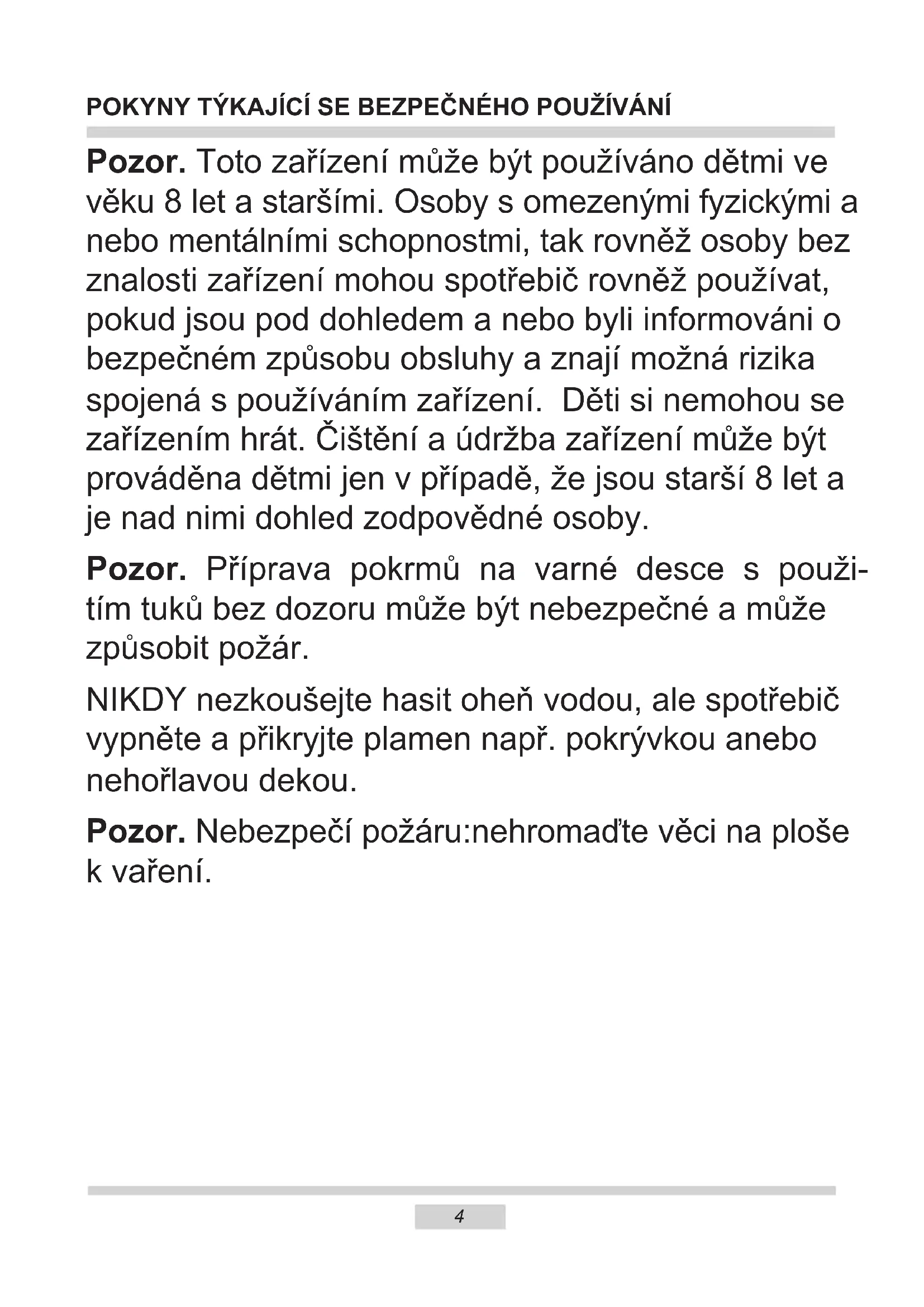 - Technické údaje POKYNY TÝKAJÍCÍ SE BEZPEČNÉHO POUŽÍVÁNÍ Pozor. Toto zařízení může být používáno dětmi ve věku 8 let a staršími. Osoby s omezenými fyzickými a nebo mentálními schopnostmi, tak rovněž osoby bez znalosti zařízení mohou spotřebič rovněž používat, pokud jsou pod dohledem a nebo byli informováni o bezpečném způsobu obsluhy a znají možná rizika spojená s používáním zařízení. Děti si nemohou se zařízením hrát. Čištění a údržba zařízení může být prováděna dětmi jen v případě, že jsou starší 8 let a je nad nimi dohled zodpovědné osoby. Pozor. Příprava pokrmů na varné desce s použi- tím tuků bez dozoru může být nebezpečné a může způsobit požár. NIKDY nezkoušejte hasit oheň vodou, ale spotřebič vypněte a přikryjte plamen např. pokrývkou anebo nehořlavou dekou. Pozor. Nebezpečí požáru:nehromaďte věci na ploše k vaření.5 POKYNY TÝKAJÍCÍ SE BEZPEČNÉHO POUŽÍVÁNÍ Pozor. Jestliže je povrch prasknutí, vypněte proud, aby nevznikla možnost úrazu elektrickým proudem. Pozor. Nedoporučuje se kladení kovových předmětů, jako jsou nože, vidličky, lžíce a pokličky na povrch varné desky, protože se mohou stát horké. Po požití vypněte varnou desku regulátorem a ne- spoléhejte se na ukázání detektoru nádobí. Zařízení neovládejte vnějšími hodinami anebo ne- závislým systémem dálkového ovládání. K čištění spotřebiče není dovoleno používat zařízení pro čištění parou.6 POKYNY TÝKAJÍCÍ SE BEZPEČNÉHO POUŽÍVÁNÍ ● Před prvním použitím indukční varné desky je potřebné přečíst návod k používání. Tímto způsobem si zajistíme bezpečnost a vyhneme se poškození varné desky. ● Jestliže indukční varná deska je používaná v bezprostřední blízkosti radia, televizoru anebo jiného emitujícího zařízení, zkontrolujte, zda je zajištěná správná činnost panelu ovládajícího varnou desku. ● Varnou desku musí zapojit oprávněný instalatér-elektrikář. ● Není dovoleno instalovat varné desky poblíž chladících zařízení. ● Nábytek, ve kterém je umístěna varná deska, musí být odolný vůči teplotě cca 100°C. Týká se to překližek, hran, umělohmotných povrchů, lepidel, jak rovněž laků. ● Varnou desku používejte pouze po jejím vestavění. Tímto způsobem se zabezpečujeme před dotknutím částí, které jsou pod napětím. ● Opravy elektrických spotřebičů mohou provádět pouze specialisté. Neodborně provedené opravy mohou způsobit vážné nebezpečí pro uživatele. ● Spotřebič zbude odpojený od elektrické sítě pouze tehdy, pokud bude vypnutá pojistka anebo zástrčka bude vytáhnutá ze zásuvky. ● Zástrčka napájecího vodiče po instalování varné desky musí být dostupná. ● Věnujte ctnostmi, pozornost dětem, aby si se spotřebičem nehrály. ● Osoby s implantovanými zařízeními podporujícími životní funkce (např. kardiostimu- látor, inzulinová pumpa anebo náslechový přístroj) se musí přesvědčit, práce těchto zařízení nebude indukční varnou deskou narušena (oblast frekvence činnosti indukční varné desky obnáší 20-50 kHz). ● V případě zániku napětí v síti je zrušeno jakékoliv nastavení. Po opětovném objevení se napětí v síti je doporučovaná opatrnost. Pokud jsou varná pole horká, bude promítaný ukazatel zbytkového tepla „H”, jak rovněž jako při prvním zapnutí klíč blokády. ● Vestavěný do elektronické soustavy ukazatel zbytkového tepla ukazuje, zda je varná deska zapnutá, případně, zda je ještě horká. ● Jestliže se zásuvka nachází poblíž varného pole, dávejte pozor, aby se kabel spotřebiče nedotýkal zahřátých míst. ● Při používáni olejů a tuků nenechávejte varné desky bez dozoru, protože existuje požární ohrožení. ● Nepoužívejte nádob z umělých hmot a hliníkové folie. Roztavují se ve vysokých teplotách a mohou poškodit keramické varné pole. ● Cukr, kyselina citronová, sůl apod. v stálém i kapalném stavu, jak rovněž umělá hmota se nemůže ocitnout na horkém varném poli. ● Jestliže se v důsledku nepozornosti cukr anebo umělá hmota dostane na horké varné pole, v žádném případě není dovoleno vypnout varnou desku, ale seškrabte cukr a umělou hmotu ostrým škrabákem. Chraňte ruce před popařením a poraněním.7 ● Při používání indukční varné desky používejte pouze hrnce a kastroly s plochým dnem, bez hran a výronků, protože v opačném případě může vzniknout poškrábání tabule. ● Hřejný povrch indukční varné desky je odolný vůči tepelnému šoku. Není citlivá ani na chladno ani na horko. ● Vyhýbejte se úpadku předmětů na tabuli varné desky. Bodové údery např. úpadek lahvičky s kořením, může způsobit prasknutí a úlomky keramické tabule. ● Pokud dojde k poškození, kypící jídlo může vniknout do částí indukční varné desky, které jsou pod napětím. ● Jestliže je povrch prasknutí, vypněte proud, aby nevznikla možnost úrazu elektrickým proudem. ● Není dovolené používat povrchu varné desky jako krájecí desky anebo pracovního stolu. ● Nedoporučuje se kladení kovových předmětů, jako jsou nože, vidličky, lžíce a pokličky na povrch varné desky, protože se mohou stát horké. ● Není možné vestavět varnou desku nad pečicí troubou, nad myčkou nádobí, chladničkou a mrazničkou anebo pračkou. ● Jestliže byla varná deska vestavěná do stolní desky, kovové předměty, které se nacházejí ve skřínce, mohou být zahřáté vzduchem vyplývajícím z ventilačního systému varné desky na vysokou teplotu. Z tohoto důvodu se doporučuje použití bezprostředního krytu (viz výkr. 2). ● Dodržujte pokyny týkající se ošetřování a či
