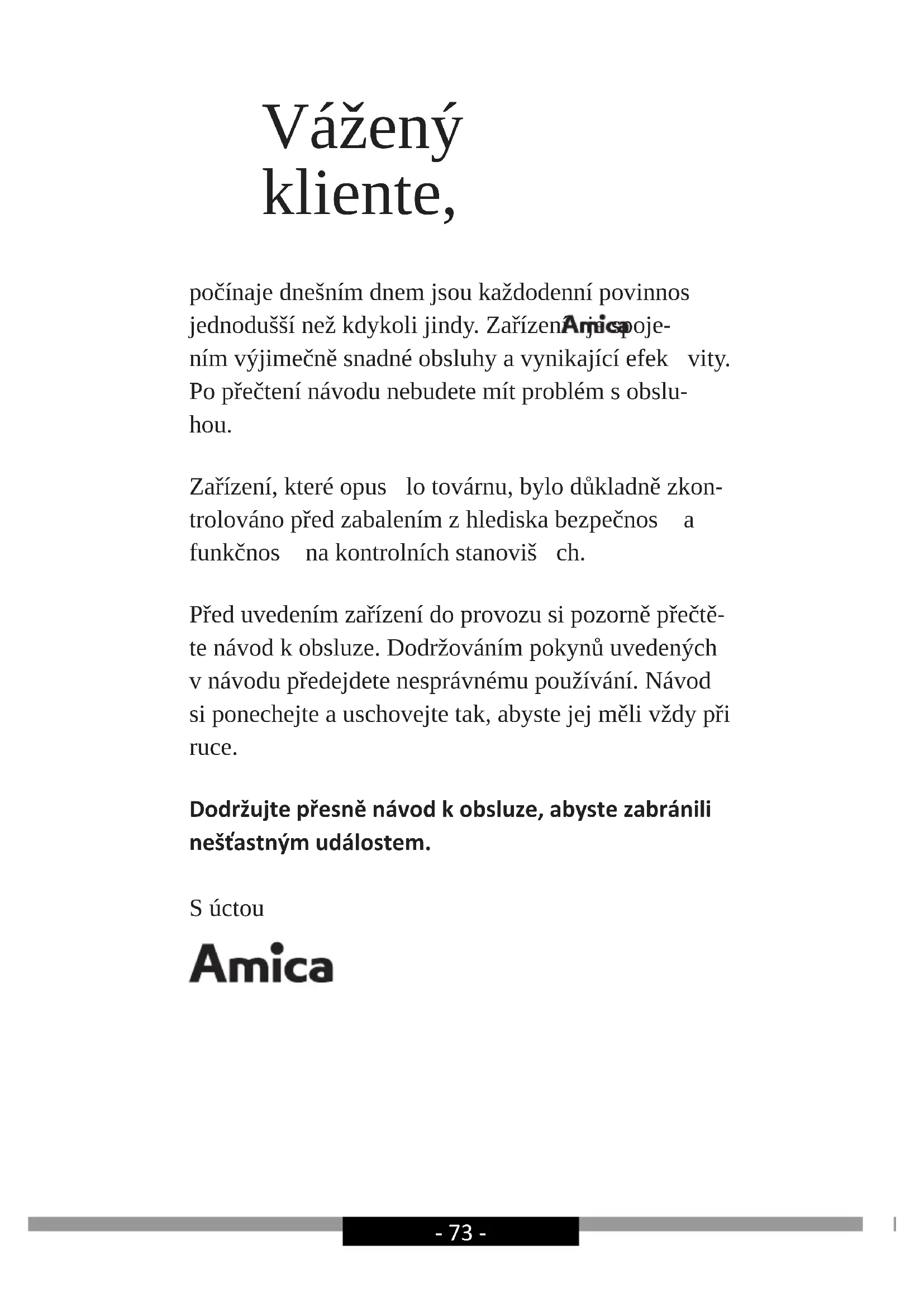 - Niederspannungsrichtlinie 2014/35/EG• Elektromagnetische Verträglichkeit 2014/30/EG• ErP – Richtlinie 2009/125/EG• Richtlinie RoHS 2011/65/EG Das Gerät ist mit dem Zeichen gekennzeichnet und verfügt über eine Konformitätserklärung zur Einsichtnahme durch die zuständigen Marktüberwa- chungsbehörden.- 73 - Vážený kliente, počínaje dnešním dnem jsou každodenní povinnos jednodušší než kdykoli jindy. Zařízení je spoje- ním výjimečně snadné obsluhy a vynikající efekvity. Po přečtení návodu nebudete mít problém s obslu- hou. Zařízení, které opuslo továrnu, bylo důkladně zkon- trolováno před zabalením z hlediska bezpečnos a funkčnos na kontrolních stanovišch. Před uvedením zařízení do provozu si pozorně přečtě- te návod k obsluze. Dodržováním pokynů uvedených v návodu předejdete nesprávnému používání. Návod si ponechejte a uschovejte tak, abyste jej měli vždy při ruce. Dodržujte přesně návod k obsluze, abyste zabránili nešťastným událostem. S úctou- 74 -