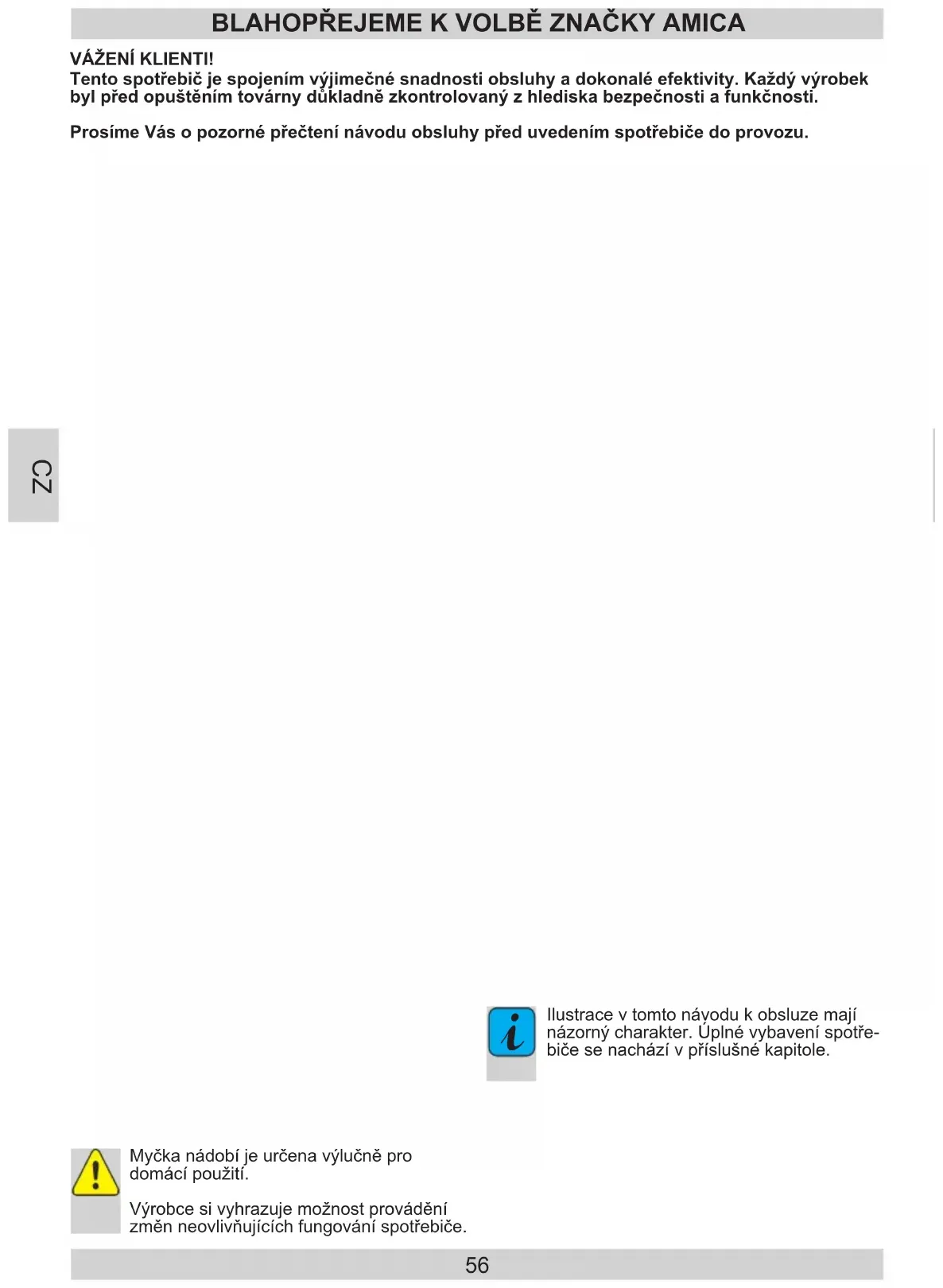 Ilustrace v tomto návodu k obsluze mají názorný charakter. Úplné vybavení spotře- biče se nachází v příslušné kapitole. Tento spotřebič je spojením výjimečné snadnosti obsluhy a dokonalé efektivity. Každý výrobek byl před opuštěním továrny důkladně zkontrolovaný z hlediska bezpečnosti a funkčnosti. Prosíme Vás o pozorné přečtení návodu obsluhy před uvedením spotřebiče do provozu. VÁŽENÍ KLIENTI! BLAHOPŘEJEME K VOLBĚ ZNAČKY AMICA Myčka nádobí je určena výlučně pro domácí použití. Výrobce si vyhrazuje možnost provádění změn neovlivňujících fungování spotřebiče. CZ57 POKYNY TÝKAJÍCÍ SE BEZPEČNOSTI POUŽÍVÁNÍ