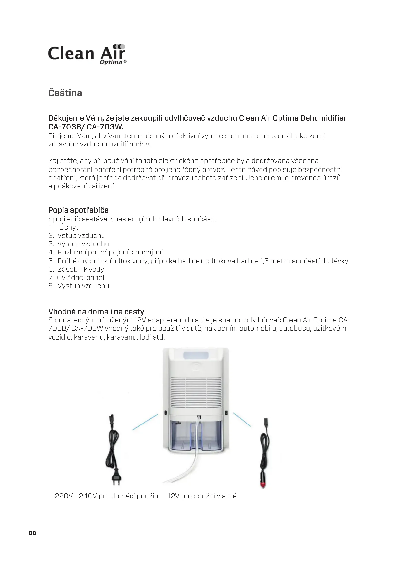 Odvlhčovač Clean Air Optima Dehumidifier CA-703B/ CA-703W byl u výrobce podroben přísným testům. Pokud v průběhu jednoho roku od data zakoupení produkt přestane fungovat v souladu se specifikacemi z důvodu výrobních vad, kupující má právo na bezplatnou opravu nebo výměnu součástí na základě předložení tohoto záručního listu (za předpokladu, že k poruše nebo poškození zařízení, případně součástí, došlo za běžných provozních podmínek). Záruka se vztahuje na následující: všechny součásti, u nichž se projeví vada materiálu nebo výrobní vada. Jak dlouho: po dobu jednoho roku od data zakoupení. Co uděláme: opravíme nebo vyměníme jakékoli vadné součásti. Další podmínky Ustanovení tohoto záručního listu jsou namísto jakékoli písemné záruky, ať již výslovné či mlčky předpokládané, písemné nebo ústní, včetně záruky prodejnosti a vhodnosti pro konkrétní účel. Maximální odpovědnost výrobce nepřekročí aktuální kupní cenu, za kterou bylo zařízení zakoupeno. Za žádných okolností výrobce nenese odpovědnost za zvláštní, následné ani nepřímé škody. Tato záruka se nevztahuje na vady, které vznikly v důsledku nesprávného nebo nepřiměřeného použití či údržby, vadné montáže, havárie, přírodní katastrofy, nesprávného zabalení nebo neoprávněného zásahu, změny nebo úpravy podle našeho vlastního úsudku. Tato záruka propadá, pokud dojde k odstranění štítku s výrobním číslem nebo pokud se tento štítek stane nečitelným.97 Děkujeme Vám za přečtení těchto pokynů. Máte-li k produktu Clean Air Optima Dehumidifier CA-703B/ CA-703W jakékoli komentáře, podělte se o ně s námi na adrese: www.cleanairoptima.com Často kladené otázky týkající se produktu CA-703B/ CA-703W najdete na adrese: www.cleanairoptima.com, kde hledejte CA-703B/ CA-703W. Stáhněte si návod k obsluze ve formátu PDF na adrese: www.cleanairoptima.com/info/manuals Podívejte se na všechna animační videa týkající se produktů Clean Air Optima na adrese: www.youtube.com Clean Air Optima International B.V. | David Ricardostraat 9-7 / 9-9 | 7559 SH Hengelo (ov) Nizozemsko | Telefon: +31 (0) 74–2670145 Clean Air Optima Germany GmbH | Enschedestraße 14 | 48529 Nordhorn | Telefon proNěmecko: +49 (0) 5921 879–121 E-mail: info@cleanairoptima.com Internet: www.cleanairoptima.com98 CA-703B/ CA-703W/ Unitate principală99100 Română Vă mulțumim că ați achiziționat dezumidicatorul Clean Air Optima CA-703B/ CA-703W. Vă dorim mulți ani de aer interior sănătos cu acest produs ecient și ecace. Pentru funcționarea corectă a dispozitivului, asigurați-vă că sunt respectate toate măsurile de siguranță pe durata utilizării sale. Aceste instrucțiuni descriu măsurile de siguranță care trebuie respectate pe durata funcționării. Ele sunt menite să prevină rănirile și să evite deteriorarea dispozitivului. Descrierea aparatului Aparatul constă din următoarele componente principale: