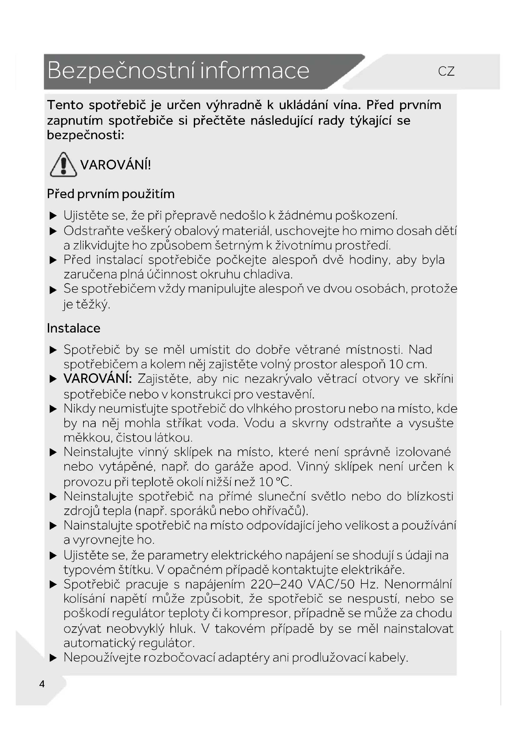 Tento spotřebič je určen výhradně k ukládání vína. Před prvním zapnutím spotřebiče si přečtěte následující rady týkající se bezpečnosti: