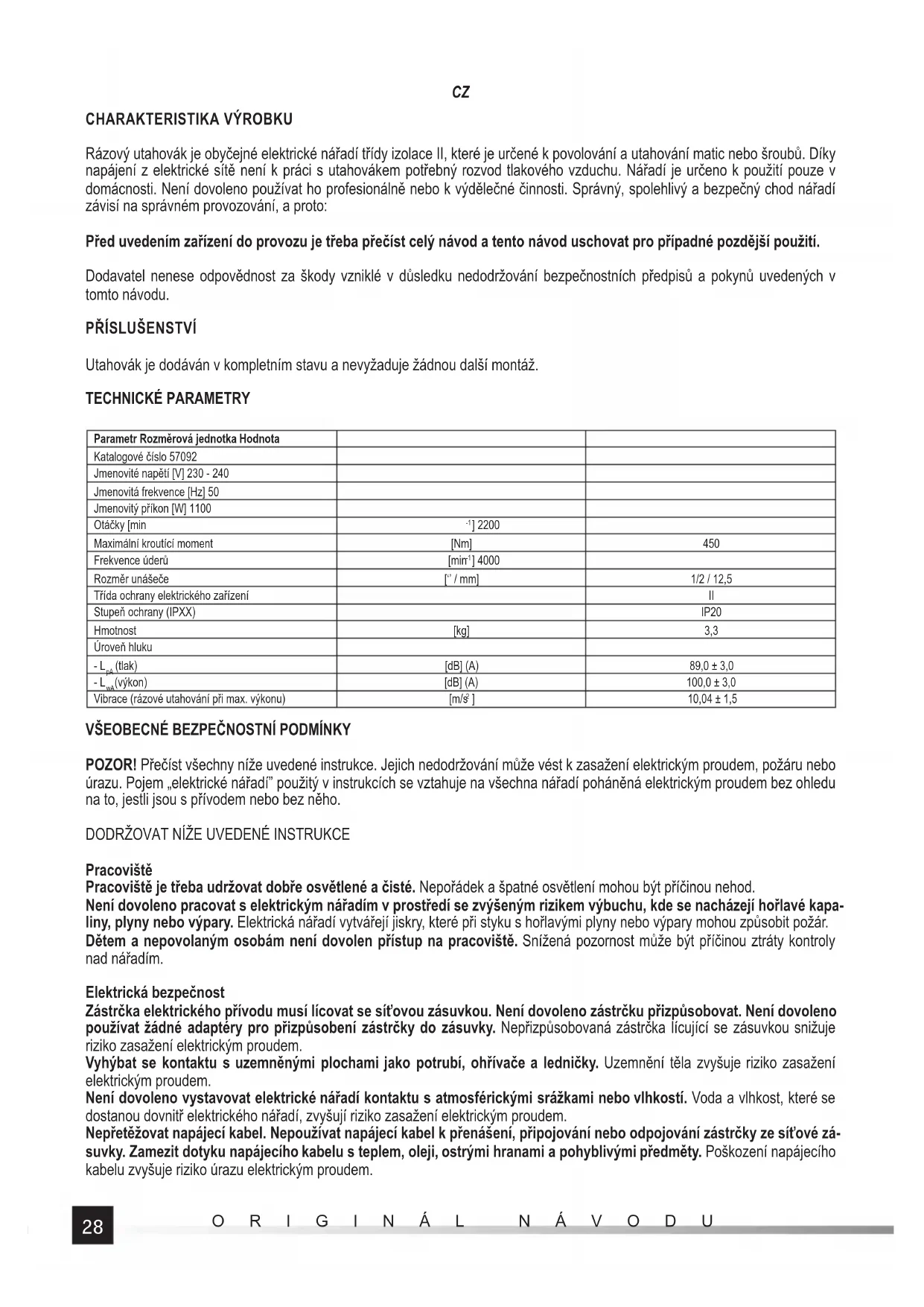 V případě práce mimo uzavřeného prostoru nutno používat prodlužovací kabel určený pro použití mimo uzavřeného prostoru. Použití náležitého prodlužovacího kabelu snižuje riziko zasažení elektrickým proudem. V případě, že je použití nářadí ve vlhkém prostředí nevyhnutné, je třeba v napájecím obvodu použít jako ochranu rozdí- lový proudový chránič (RCD). Použití RCD snižuje riziko úrazu zaviněného elektřinou. Osobní bezpečnost Pracuj, jen když jsi v dobré fyzické a psychické kondici. Soustřeď se na to, co děláš. Nepracuj, když jsi unavený nebo pod vlivem léků nebo alkoholu. Chvíle nepozornosti během práce může vést k vážným zraněním těla. Používej prostředky osobní ochrany. Vždy si nasaď ochranné brýle. Používání prostředků osobní ochrany jako protiprachový respirátor, ochranná obuv, přilba a chrániče sluchu snižují riziko vážných úrazů. Zabraň náhodnému zapnutí nářadí. Před připojením nářadí k elektrické síti se ubezpeč, že elektrický spínač je v poloze „vypnuto”. Držení nářadí s prstem na spínači nebo připojování elektrického nářadí, když je spínač v poloze „zapnuto”, může vést k vážným úrazům. Před zapnutím elektrického nářadí odstraň všechny klíče a jiné nástroje, kterých bylo použito na jeho seřizování. Klíč ponechaný v rotujících elementech nářadí může způsobït vážné úrazy těla. Udržuj rovnováhu. Po celou dobu udržuj náležité postavení. Umožní to jednodušší ovládnutí elektrického nářadí v případě neočekávaných situací během práce. Používej ochranný oděv. Nepoužívej příliš volný oděv a bižutérii. Udržuj vlasy, oděv a pracovní rukavice mimo dosahu pohyblivých částí elektrického nářadí. Volný oděv, bižutérie nebo dlouhé vlasy se mohou zachytit do pohyblivých částí nářadí. Používej odsávače prachu nebo zásobníky na prach, jestliže je nářadí tímto způsobem vybaveno. Postarej se o to, aby byly správně připojeny. Používání odsávače prachu snižuje riziko vážného poškození zdraví. Používání elektrického nářadí Elektrické nářadí nepřetěžuj. K dané práci používej jen nářadí k tomu určené. Správný výběr nářadí pro daný druh práce zabezpečí, že práce bude efektivnější a bezpečnější. Nepoužívej elektrické nářadí, když nefunguje jeho síťový spínač. Nářadí, které nelze ovládat pomocí síťového spínače, je nebezpečné a je třeba ho odevzdat do opravy. Vytáhni zástrčku z napájecí zásuvky před seřizováním, výměnou příslušenství nebo uložením nářadí. Tím se zabrání náhodnému zapnutí elektrického nářadí. Nářadí přechovávej v místě, které je nepřístupné dětem. Nedovol, aby nářadí obsluhovaly osoby nevyškolené k jeho obsluze. Elektrické nářadí v rukou nevyškolené obsluhy může být nebezpečné. Zabezpeč náležitou údržbu nářadí. Kontroluj nářadí z pohledu nepřizpůsobení a vůlí pohyblivých částí. Kontroluj, jestli není nějaký element nářadí poškozen. V případě zjištění nějakých závad je potřebné je před použitím elektrického nářadí opravit. Mnoho nehod je způsobených nesprávně udržovaným nářadí. Řezné nástroje je potřebné udržovat čisté a nabroušené. Správně udržované řezné nástroje jsou během práce snadněji ovladatelné. Používej elektrické nářadí a příslušenství v souladu s výše uvedenými instrukcemi. Používej nářadí v souladu s jeho určením a ber do úvahy druh a podmínky práce. Použití nářadí k jiné práci, než bylo projektováno, může zvýšit riziko vzniku nebezpečných situací. Opravy Nářadí dávej do opravy jen podnikům k tomu oprávněným, které používají výhradně originální náhradní díly. Tím bude zajištěna náležitá bezpečnost práce elektrického nářadí. DOPLŇUJÍCÍ BEZPEČNOSTNÍ PŘEDPISY Během používání nářadí vždy dodržujte bezpečnostní pokyny uvedené v návodu k použití a rovněž ostatní předpisy BOZP. Není dovoleno vystavovat nářadí působení atmosférických srážek. Vždy je třeba zkontrolovat, zda síťové napětí odpovídá napětí uvedenému na typovém štítku nářadí. Před zahájením používání je třeba se přesvědčit, zda používané nástavce nejsou poškozené. V případě, že bude zjištěno jejich poškození, je třeba je vyměnit za nové a nepoškozené. Používané nástrčné klíče a jiné nástroje musí být přizpůsobeny provozu s pneumatickým nářadím. Připojované nástrčné nástroje musí být v řádném technickém stavu, čisté a nepoškozené a jejich rozměry musí odpovídat rozměrům unášeče. Upravovat osazení klíčů nebo unášeče je zakázáno. Během práce je třeba používat ochranné brýle, doporučuje se používat rukavice a ochranný oděv. Při práci držte utahovák vždy oběma rukama.