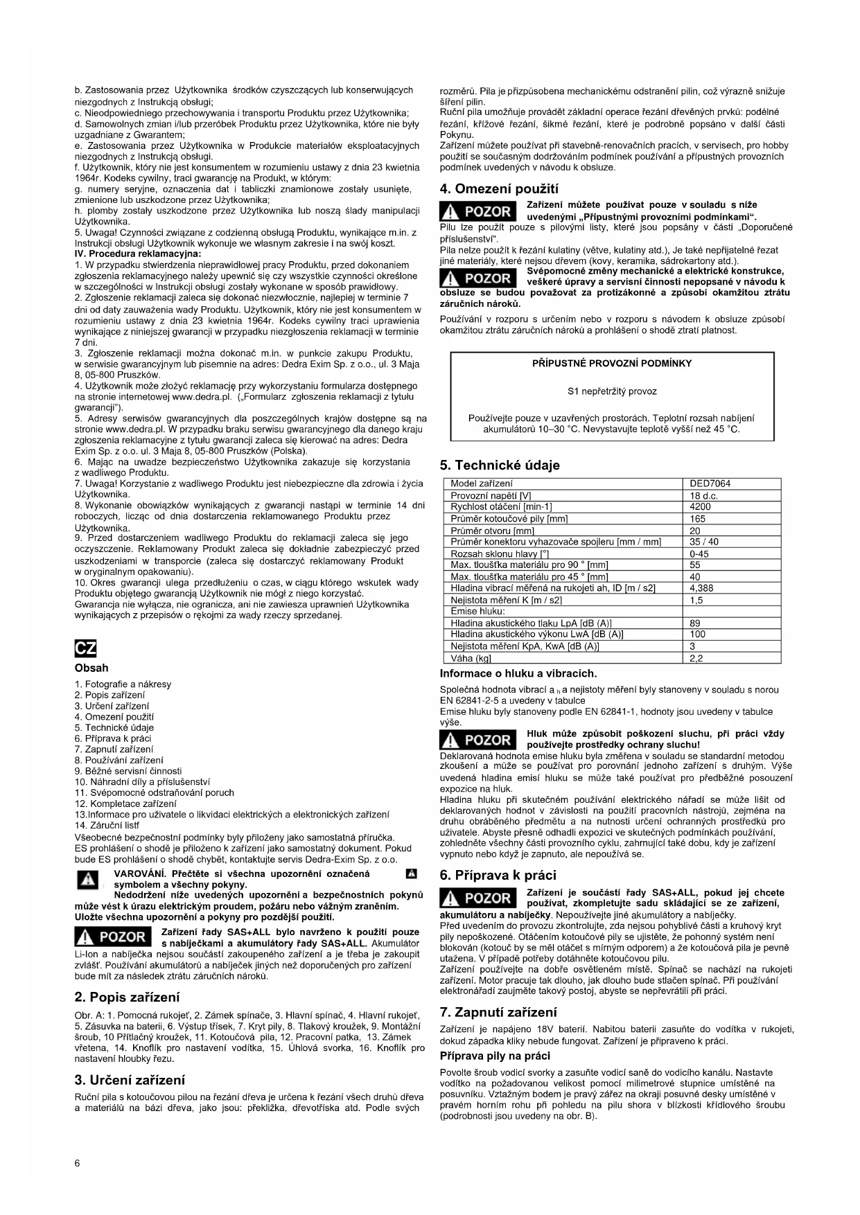 Všeobecné bezpečnostní podmínky byly přiloženy jako samostatná příručka. ES prohlášení o shodě je přiloženo k zařízení jako samostatný dokument. Pokud bude ES prohlášení o shodě chybět, kontaktujte servis Dedra-Exim Sp. z o.o. VAROVÁNÍ. Přečtěte si všechna upozornění označená symbolem a všechny pokyny. Nedodržení níže uvedených upozornění a bezpečnostních pokynů může vést k úrazu elektrickým proudem, požáru nebo vážným zraněním. Uložte všechna upozornění a pokyny pro pozdější použití. Zařízení řady SAS+ALL bylo navrženo k použití pouze s nabíječkami a akumulátory řady SAS+ALL. Akumulátor Li-Ion a nabíječka nejsou součástí zakoupeného zařízení a je třeba je zakoupit zvlášť. Používání akumulátorů a nabíječek jiných než doporučených pro zařízení bude mít za následek ztrátu záručních nároků.