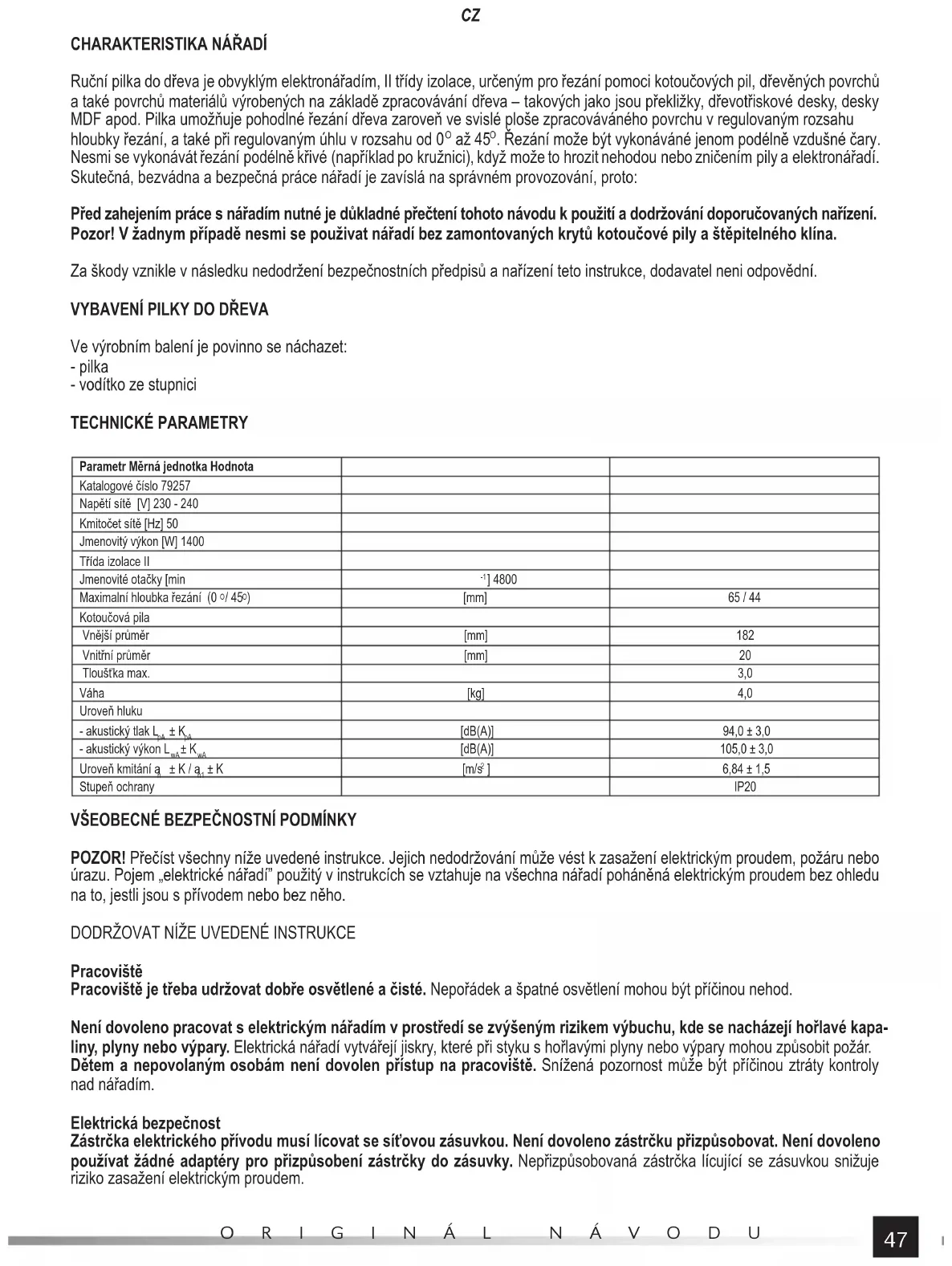 Ve výrobním balení je povinno se náchazet: - pilka - vodítko ze stupnici TECHNICKÉ PARAMETRY Parametr Měrná jednotka Hodnota Katalogové číslo 79257 Napětí sítě [V] 230 - 240 Kmitočet sítě [Hz] 50 Jmenovitý výkon [W] 1400 Třída izolace II Jmenovité otačky [min