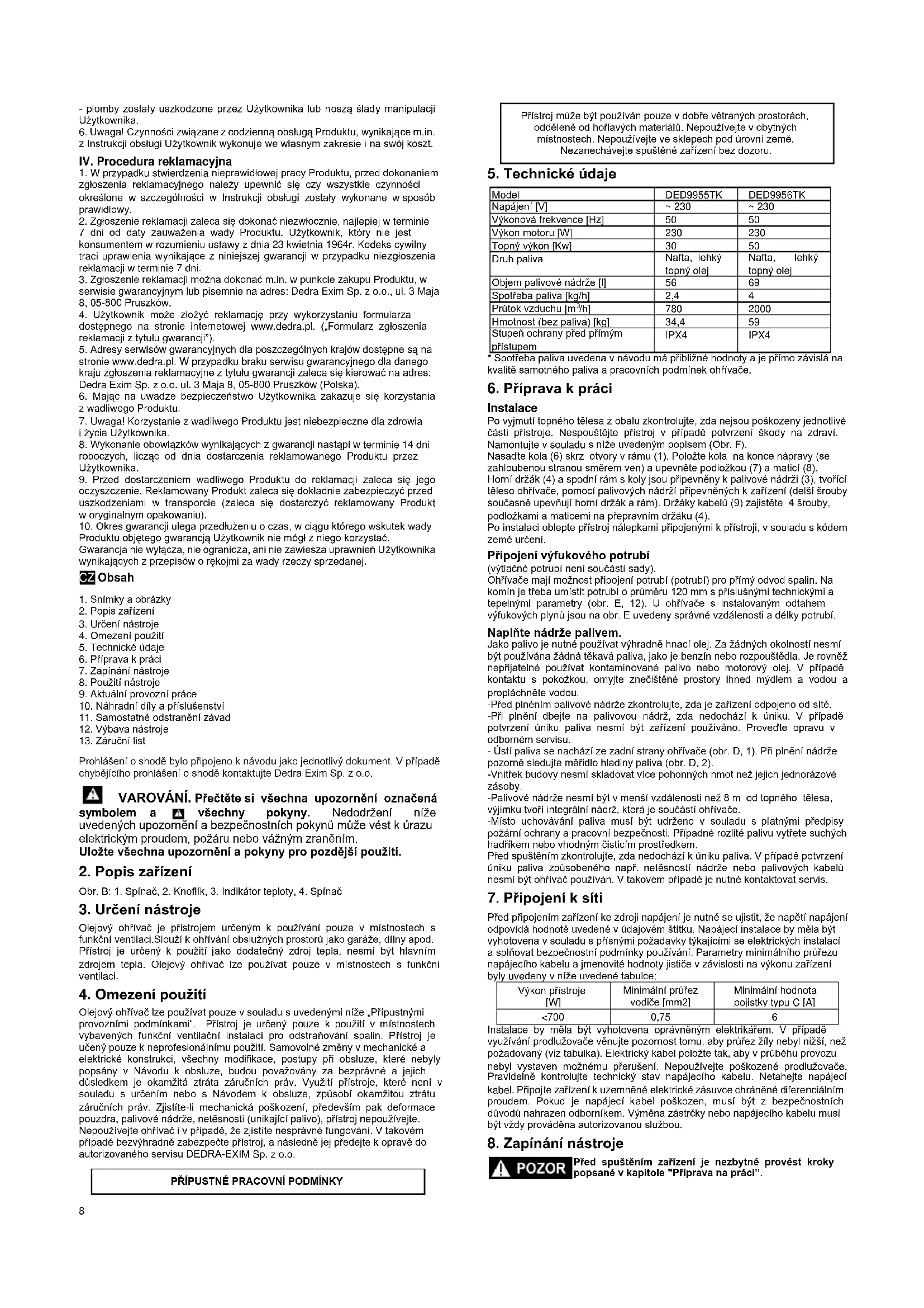 Prohlášení o shodě bylo připojeno k návodu jako jednotlivý dokument. V případě chybějícího prohlášení o shodě kontaktujte Dedra Exim Sp. z o.o. VAROVÁNÍ. Přečtěte si všechna upozornění označená symbolem a všechny pokyny. Nedodržení níže uvedených upozornění a bezpečnostních pokynů může vést k úrazu elektrickým proudem, požáru nebo vážným zraněním. Uložte všechna upozornění a pokyny pro pozdější použití.