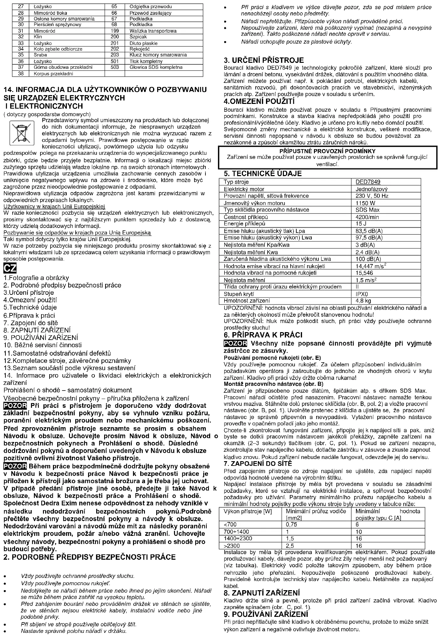 Typ stroje DED7849 Elektrický motor Jednofázový Provozní napětí, síťová frekvence 230 V, 50 Hz Jmenovitý výkon motoru 1150 W Typ sklíčidla pracovního nástavce SDS Max Čestnost příklepů 4200/min Energie příklepů 15 J Emise hluku (akustický tlak) Lpa 83,5 dB(A) Emise hluku (akustický výkon) Lwa 97,5 dB(A) Nejistota měření Kpa/Kwa 3 dB(A) Nejistota měření Kwa 2,4 dB(A) Zaručená hladina akustického výkonu Lwa 100 dB(A) Hodnota emise vibrací na hlavní rukojeti 14,447 m/s