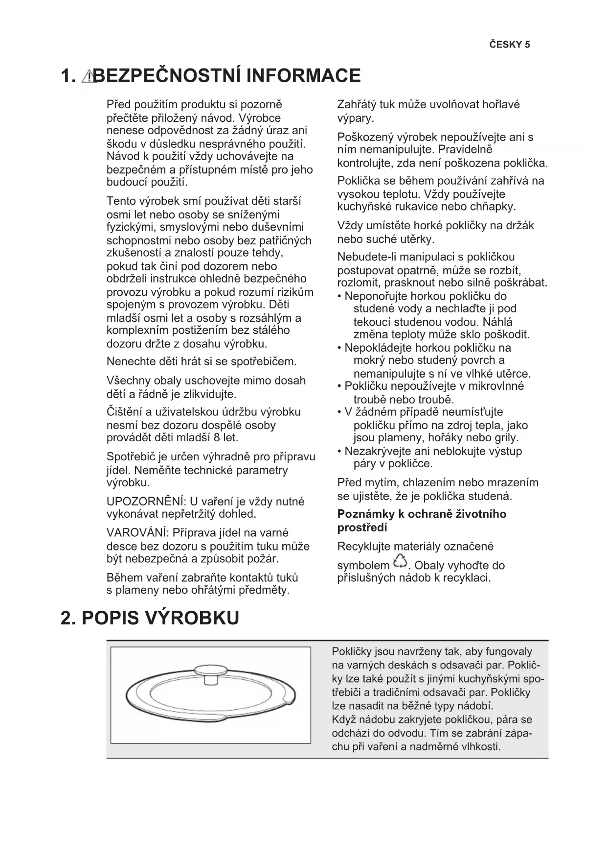 Před použitím produktu si pozorně přečtěte přiložený návod. Výrobce nenese odpovědnost za žádný úraz ani škodu v důsledku nesprávného použití. Návod k použití vždy uchovávejte na bezpečném a přístupném místě pro jeho budoucí použití. Tento výrobek smí používat děti starší osmi let nebo osoby se sníženými fyzickými, smyslovými nebo duševními schopnostmi nebo osoby bez patřičných zkušeností a znalostí pouze tehdy, pokud tak činí pod dozorem nebo obdrželi instrukce ohledně bezpečného provozu výrobku a pokud rozumí rizikům spojeným s provozem výrobku. Děti mladší osmi let a osoby s rozsáhlým a komplexním postižením bez stálého dozoru držte z dosahu výrobku. Nenechte děti hrát si se spotřebičem. Všechny obaly uschovejte mimo dosah dětí a řádně je zlikvidujte. Čištění a uživatelskou údržbu výrobku nesmí bez dozoru dospělé osoby provádět děti mladší 8 let. Spotřebič je určen výhradně pro přípravu jídel. Neměňte technické parametry výrobku. UPOZORNĚNÍ: U vaření je vždy nutné vykonávat nepřetržitý dohled. VAROVÁNÍ: Příprava jídel na varné desce bez dozoru s použitím tuku může být nebezpečná a způsobit požár. Během vaření zabraňte kontaktů tuků s plameny nebo ohřátými předměty. Zahřátý tuk může uvolňovat hořlavé výpary. Poškozený výrobek nepoužívejte ani s ním nemanipulujte. Pravidelně kontrolujte, zda není poškozena poklička. Poklička se během používání zahřívá na vysokou teplotu. Vždy používejte kuchyňské rukavice nebo chňapky. Vždy umístěte horké pokličky na držák nebo suché utěrky. Nebudete-li manipulaci s pokličkou postupovat opatrně, může se rozbít, rozlomit, prasknout nebo silně poškrábat.
