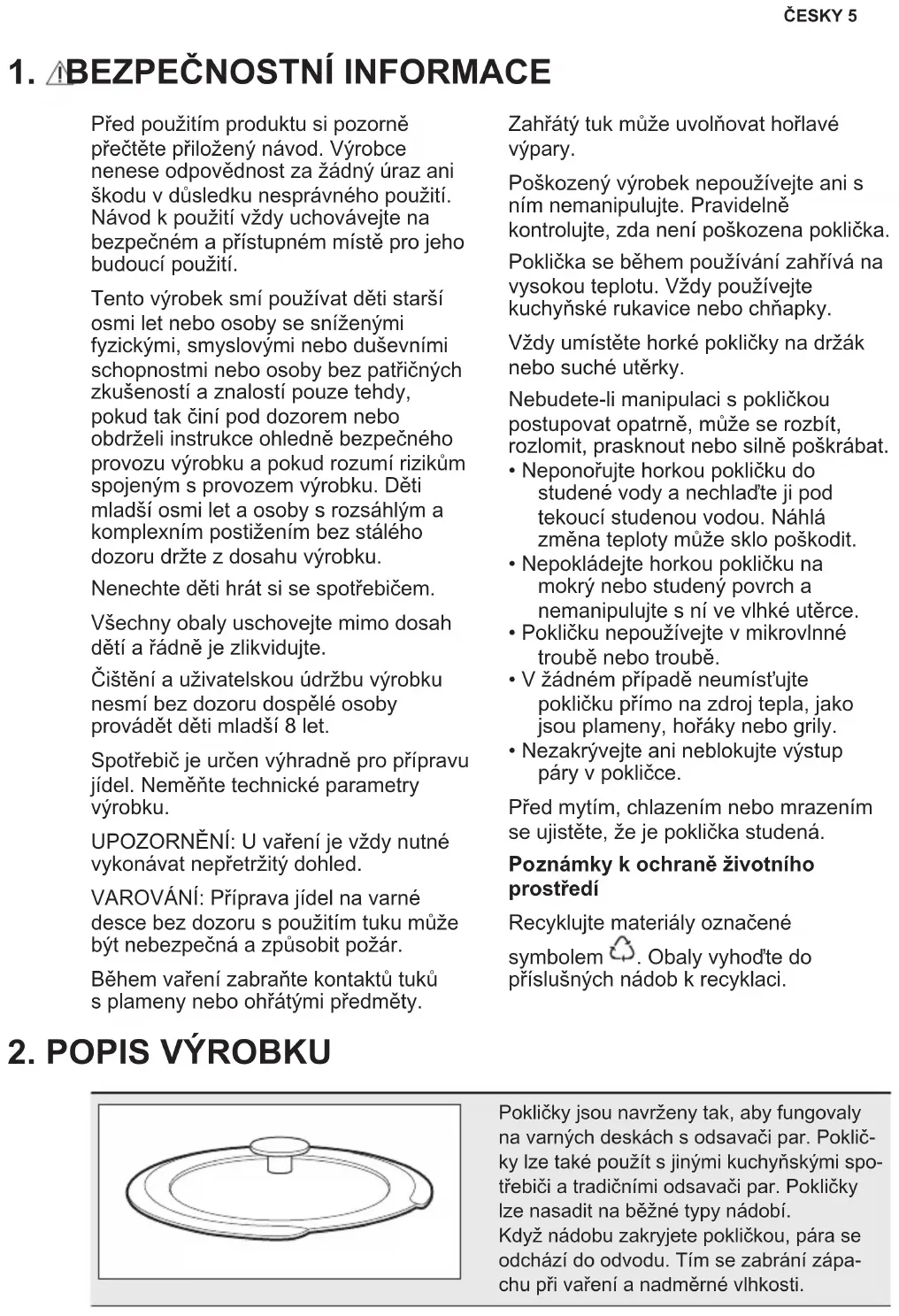Před použitím produktu si pozorně přečtěte přiložený návod. Výrobce nenese odpovědnost za žádný úraz ani škodu v důsledku nesprávného použití. Návod k použití vždy uchovávejte na bezpečném a přístupném místě pro jeho budoucí použití. Tento výrobek smí používat děti starší osmi let nebo osoby se sníženými fyzickými, smyslovými nebo duševními schopnostmi nebo osoby bez patřičných zkušeností a znalostí pouze tehdy, pokud tak činí pod dozorem nebo obdrželi instrukce ohledně bezpečného provozu výrobku a pokud rozumí rizikům spojeným s provozem výrobku. Děti mladší osmi let a osoby s rozsáhlým a komplexním postižením bez stálého dozoru držte z dosahu výrobku. Nenechte děti hrát si se spotřebičem. Všechny obaly uschovejte mimo dosah dětí a řádně je zlikvidujte. Čištění a uživatelskou údržbu výrobku nesmí bez dozoru dospělé osoby provádět děti mladší 8 let. Spotřebič je určen výhradně pro přípravu jídel. Neměňte technické parametry výrobku. UPOZORNĚNÍ: U vaření je vždy nutné vykonávat nepřetržitý dohled. VAROVÁNÍ: Příprava jídel na varné desce bez dozoru s použitím tuku může být nebezpečná a způsobit požár. Během vaření zabraňte kontaktů tuků s plameny nebo ohřátými předměty. Zahřátý tuk může uvolňovat hořlavé výpary. Poškozený výrobek nepoužívejte ani s ním nemanipulujte. Pravidelně kontrolujte, zda není poškozena poklička. Poklička se během používání zahřívá na vysokou teplotu. Vždy používejte kuchyňské rukavice nebo chňapky. Vždy umístěte horké pokličky na držák nebo suché utěrky. Nebudete-li manipulaci s pokličkou postupovat opatrně, může se rozbít, rozlomit, prasknout nebo silně poškrábat.