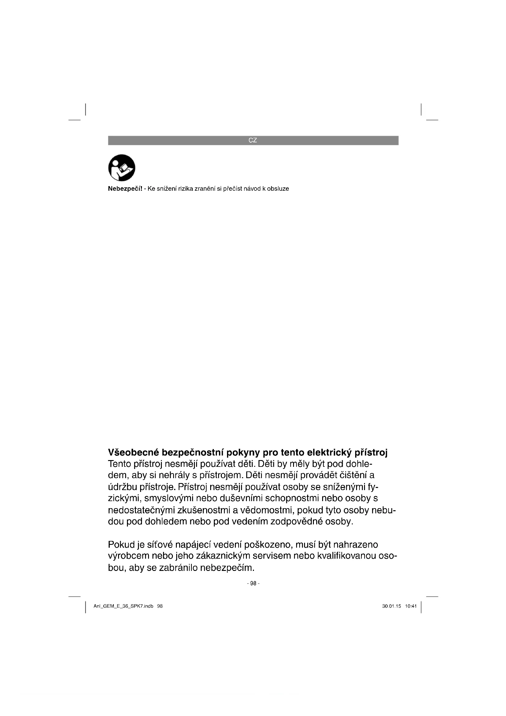 Nebezpečí! - Ke snížení rizika zranění si přečíst návod k obsluze Všeobecné bezpečnostní pokyny pro tento elektrický přístroj Tento přístroj nesmějí používat děti. Děti by měly být pod dohle- dem, aby si nehrály s přístrojem. Děti nesmějí provádět čištění a údržbu přístroje. Přístroj nesmějí používat osoby se sníženými fy- zickými, smyslovými nebo duševními schopnostmi nebo osoby s nedostatečnými zkušenostmi a vědomostmi, pokud tyto osoby nebu- dou pod dohledem nebo pod vedením zodpovědné osoby. Pokud je síťové napájecí vedení poškozeno, musí být nahrazeno výrobcem nebo jeho zákaznickým servisem nebo kvalifi kovanou oso- bou, aby se zabránilo nebezpečím. Anl_GEM_E_36_SPK7.indb 98Anl_GEM_E_36_SPK7.indb 98 30.01.15 10:4130.01.15 10:41CZ