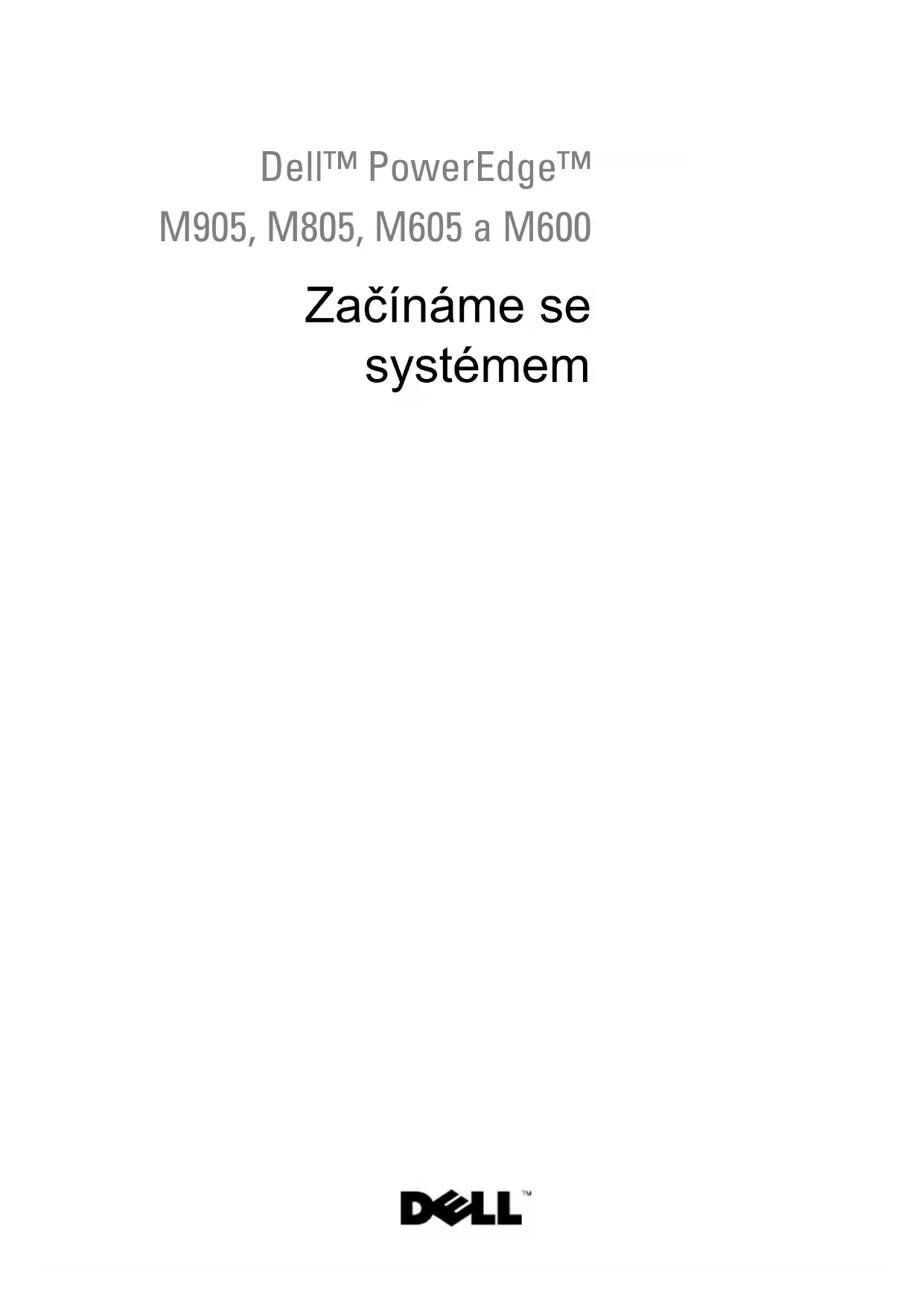 Společnosti Dell rovněž nabízí školení a certifikaci (Dell Enterprise Training and Certification). Další informace najdete na adrese dell.com/training . Tato služba nemusí být nabízena ve všech regionech.Začínáme se systémem 33 Instalace a konfigurace POZOR: Před provedením následujícího postupu si pročtěte bezpečnostní pokyny a důležité informace o plnění norem, které byly dodány se systémem, a postupujte podle těchto pokynů a informací. Další informace o doporučených bezpečnostních opatřeních najdete na adrese www.dell.com/regulatory_compliance. V této části jsou popsány kroky, které je nutné provést při první instalaci systému. Rozbalení systému Rozbalte systém a identifikujte jeho jednotlivé součásti. Veškerý obalový materiál uschovejte pro případ pozdější potřeby. Instalace systému do stojanu Nejprve si přečtěte Bezpečnostní pokyny uvedené v dokumentaci k instalaci do stojanu a potom proveďte instalaci systému do stojanu. Pokyny k instalaci systému do stojanu naleznete v dokumentaci k instalaci do stojanu. Pokyny k napájení a chlazení najdete v nástroji pro plánování kapacity stojanu na adrese www.dell.com .34 Začínáme se systémem Instalace modulů blade Postupujte zleva doprava a shora dolů a zasouvejte moduly do šasi. Jakmile bude modul blade bezpečně nainstalován, držadlo se vrátí do zamčené pozice. Připojení ovladače CMC a modulů KVM Připojte sériový kabel a sít’ový kabel z řídícího systému k modulu ovladače CMC. Připojte také druhý, volitelný modul ovladače CMC (pokud je nainstalován). (Pokud bylo šasi dodáno s předinstalovanými moduly blade M805 nebo M905, bude zahrnut firmware CMC verze 1.2 nebo vyšší.) Připojte klávesnici, myš a monitor k volitelnému modulu iKVM.Začínáme se systémem 35 Připojení systému k napájení Připojte napájecí kabely systému ke zdrojům napájení. UPOZORNĚNÍ: Chcete-li zabránit nechtěnému odpojení napájecích kabelů, připevněte zástrčky napájecích kabelů ke zdrojům napájení pomocí plastových svorek na zdrojích napájení a pomocí pásky Velcro připevněte kabel k protideformační tyči. Poté zasuňte druhý konec napájecích kabelů do odděleného zdroje napájení, například zdroje UPS (nepřerušitelný zdroj napájení) nebo do jednotky rozvaděče (PDU). Zapnutí systému Stiskněte tlačítko napájení na šasi. Měl by se rozsvítit indikátor napájení.36 Začínáme se systémem Zapnutí modulů blade Stiskněte tlačítko napájení na každém modulu blade nebo spust’te napájení modulů blade pomocí softwaru pro správu systémů. Dokončení nastavení operačního systému Pokud jste zakoupili předinstalovaný operační systém, prostudujte dokumentaci k operačnímu systému dodanou se systémem. Pokyny k první instalaci operačního systému naleznete v Příručce rychlé instalace. Než začnete s instalací hardwaru či softwaru, který nebyl zakoupen společně se systémem, ujistěte se, že je nainstalován operační systém.Začínáme se systémem 37 Technické specifikace Specifikace modulù blade Procesor Typ procesoru PowerEdge M905 Čtyři dvoujádrové nebo čtyřjádrové procesory řady AMD Opteron 8000 PowerEdge M805 Dva dvoujádrové nebo čtyřjádrové procesory řady AMD Opteron 2000 PowerEdge M600 Jeden nebo dva dvoujádrové nebo čtyřjádrové procesory Intel Xeon PowerEdge M605 Jeden nebo dva dvoujádrové nebo čtyřjádrové procesory řady AMD Opteron 2000 Pamět’ Architektura PowerEdge M600 Pamět’ové moduly FBD s taktovací frekvencí 677 MHz PowerEdge M905, M805, M605 Pamět’ové moduly DDR2 s taktovací frekvencí 677 MHz Sokety pro pamět’ové moduly PowerEdge M905 24 240kolíkových soketů PowerEdge M805 16 240kolíkových soketů PowerEdge M605, M600 Osm 240kolíkových soketů Kapacity pamět’ových modulů 512 MB (PowerEdge M605 a M600), 1 GB, 2 GB, 4 GB nebo 8 GB Minimum paměti RAM Dva pamět’ové moduly na každý procesor PowerEdge M905 8 GB (osm pamět’ových modulů s kapacitou 1 GB) PowerEdge M805 4 GB (čtyři pamět’ové moduly skapacitou1GB) PowerEdge M600, M605 1 GB (dva pamět’ové moduly s kapacitou 512 MB)38 Začínáme se systémem Maximum paměti RAM PowerEdge M905 192 GB PowerEdge M805 128 GB PowerEdge M600, M605 64 GB Jednotky Pevné disky PowerEdge M805, M905 Jeden nebo dva 2,5palcové pevné disky SAS PowerEdge M600, M605 Konfigurace SATA Jeden nebo dva 2,5palcové pevné disky SATA Konfigurace SAS Jeden nebo dva 2,5palcové pevné disky SAS POZNÁMKA: Pevné disky SAS a SATA nelze v rámci modulu blade M600 nebo M605 kombinovat. Konektory Externí USB PowerEdge M805, M905 Tři 4kolíkové, USB 2.0 PowerEdge M600, M605 Dva 4kolíkové, USB 2.0 Interní Karta SD (PowerEdge M805, M905) Jeden konektor pro kartu SD Sít’ové karty Ethernet Čipová sada PowerEdge M805, M905 Čtyři porty Ethernet s podporou funkce TOE a spouštění prostřednictvím protokolu iSCSI poskytované dvěma integrovanými kartami Ethernet Broadcom 5709S se dvěma porty PowerEdge M600, M605 Dva porty Ethernet s podporou funkce TOE a spouštění prostřednictvím protokolu iSCSI poskytované dvěma integrovanými kartami Broadcom 5708S Pamět’ (pokračování)Začínáme se systémem 39 Specifikace šasi systému Grafická karta Typ grafiky Grafická karta ATI RN50 Grafická pamět’ 32 MB Rozměry PowerEdge M905, M805 Výška 38,5 cm Šířka 5 cm Hloubka 48,6 cm Hmotnost (maximální konfigurace) 11,1 kg PowerEdge M605, M600 Výška 18,9 cm Šířka 5 cm Hloubka 48,6 cm Hmotnost (maximální konfigurace) 5,2–6,4 kg Baterie Baterie modulu blade Lithium-iontová knoflíková baterie CR 2032 3,0 V Rozměry Výška 44,0 cm Šířka 44,7 cm Hloubka 75,5 cm Hmotnost (maximální konfigurace) 178,3 kg Hmotnost (prázdné) 44,6 kg40 Začínáme se systémem Modul zdroje napájení Střídavý/stejnosm