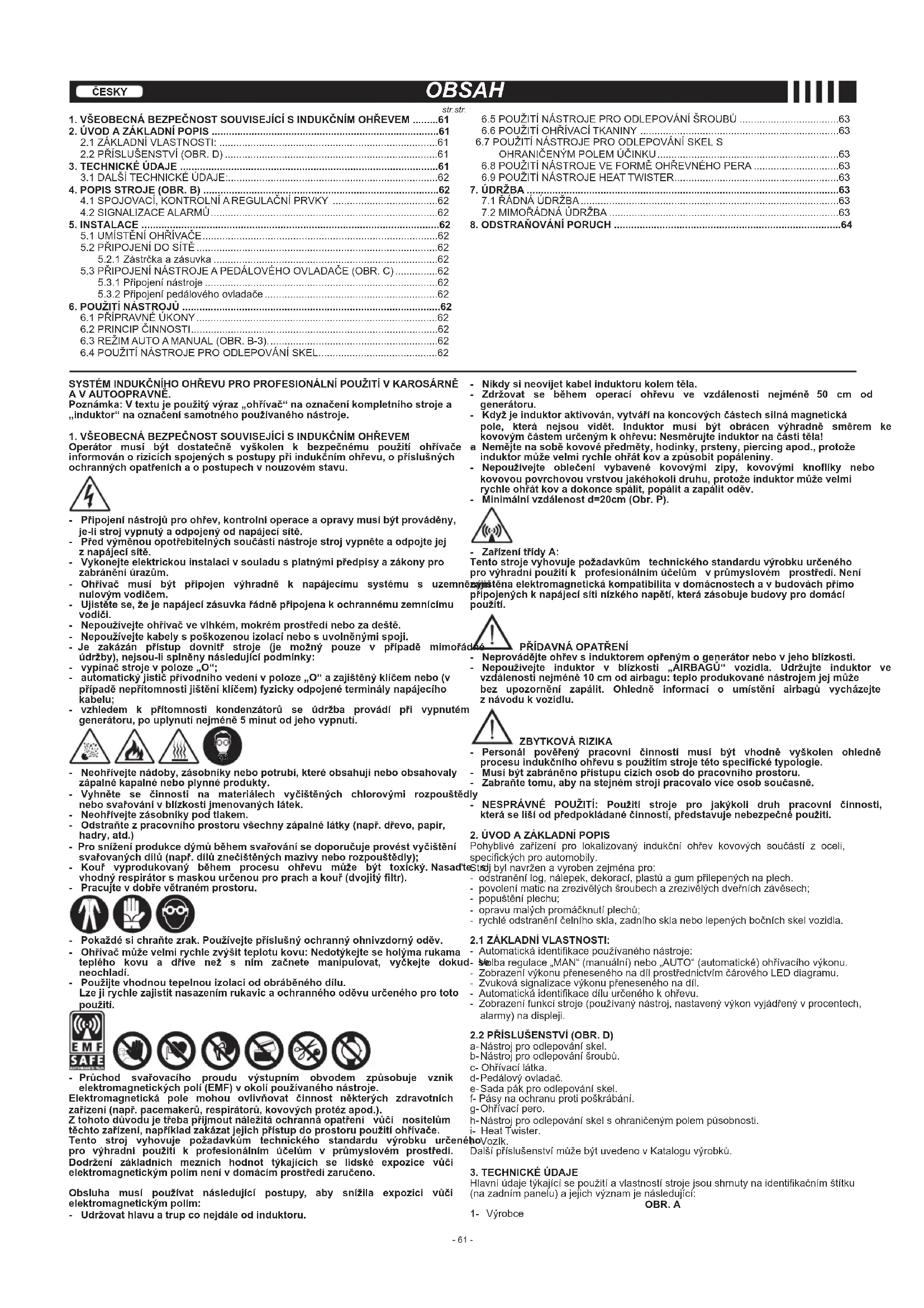 str. str. SYSTÉMINDUKČNÍHOOHŘEVUPROPROFESIONÁLNÍPOUŽITÍVKAROSÁRNĚ AVAUTOOPRAVNĚ. Poznámka:Vtextujepoužitývýraz„ohřívač“naoznačeníkompletníhostrojea „induktor“naoznačenísamotnéhopoužívanéhonástroje. 1.VŠEOBECNÁBEZPEČNOSTSOUVISEJÍCÍSINDUKČNÍMOHŘEVEM Operátor musí být dostatečně vyškolen k bezpečnému použití ohřívače a informovánorizicíchspojenýchspostupypřiindukčnímohřevu,opříslušných ochrannýchopatřeníchaopostupechvnouzovémstavu. - Připojenínástrojůproohřev,kontrolníoperaceaopravymusíbýtprováděny, je-listrojvypnutýaodpojenýodnapájecísítě. - Předvýměnouopotřebitelnýchsoučástínástrojestrojvypněteaodpojtejej znapájecísítě. - Vykonejteelektrickouinstalacivsouladusplatnýmipředpisyazákonypro zabráněníúrazům. - Ohřívač musí být připojen výhradně k napájecímu systému s uzemněným nulovýmvodičem. - Ujistětese,žejenapájecízásuvkařádněpřipojenakochrannémuzemnícímu vodiči. - Nepoužívejteohřívačvevlhkém,mokrémprostředínebozadeště. - Nepoužívejtekabelyspoškozenouizolacínebosuvolněnýmispoji. -Je zakázán přístup dovnitř stroje (je možný pouze v případě mimořádné údržby),nejsou-lisplněnynásledujícípodmínky: - vypínačstrojevpoloze„O“; - automatickýjističpřívodníhovedenívpoloze„O“azajištěnýklíčemnebo(v případěnepřítomnostijištěníklíčem)fyzickyodpojenéterminálynapájecího kabelu; - vzhledem k přítomnosti kondenzátorů se údržba provádí při vypnutém generátoru,pouplynutínejméně5minutodjehovypnutí. - Neohřívejtenádoby,zásobníkynebopotrubí,kteréobsahujíneboobsahovaly zápalnékapalnéneboplynnéprodukty. - Vyhněte se činnosti na materiálech vyčištěných chlorovými rozpouštědly nebosvařovánívblízkostijmenovanýchlátek. - Neohřívejtezásobníkypodtlakem. - Odstraňtezpracovníhoprostoruvšechnyzápalnélátky(např.dřevo,papír, hadry,atd.) -Prosníženíprodukcedýmůběhemsvařovánísedoporučujeprovéstvyčištění svařovanýchdílů(např.dílůznečištěnýchmazivyneborozpouštědly); - Kouř vyprodukovaný během procesu ohřevu může být toxický.Nasaďte si vhodnýrespirátorsmaskouurčenouproprachakouř(dvojitýltr). - Pracujtevdobřevětranémprostoru. - Pokaždésichraňtezrak.Používejtepříslušnýochrannýohnivzdornýoděv. - Ohřívačmůževelmirychlezvýšitteplotukovu:Nedotýkejteseholýmarukama teplého kovu a dříve než s ním začnete manipulovat, vyčkejte dokud se neochladí. - Použijtevhodnoutepelnouizolaciodobráběnéhodílu. Lzejirychlezajistitnasazenímrukavicaochrannéhooděvuurčenéhoprototo použití. - Průchod svařovacího proudu výstupním obvodem způsobuje vznik elektromagnetickýchpolí(EMF)vokolípoužívanéhonástroje. Elektromagnetická pole mohou ovlivňovat činnost některých zdravotních zařízení(např.pacemakerů,respirátorů,kovovýchprotézapod.). Ztohotodůvodujetřebapřijmoutnáležitáochrannáopatření vůči nositelům těchtozařízení,napříkladzakázatjejichpřístupdoprostorupoužitíohřívače. Tento stroj vyhovuje požadavkům technického standardu výrobku určeného pro výhradní použití k profesionálním účelům v průmyslovém prostředí. Dodržení základních mezních hodnot týkajících se lidské expozice vůči elektromagnetickýmpolímnenívdomácímprostředízaručeno. Obsluha musí používat následující postupy, aby snížila expozici vůči elektromagnetickýmpolím: - Udržovathlavuatrupconejdáleodinduktoru. - Nikdysineovíjetkabelinduktorukolemtěla. - Zdržovat se během operací ohřevu ve vzdálenosti nejméně 50 cm od generátoru. - Kdyžjeinduktoraktivován,vytvářínakoncovýchčástechsilnámagnetická pole, která nejsou vidět. Induktor musí být obrácen výhradně směrem ke kovovýmčástemurčenýmkohřevu:Nesměrujteinduktornačástitěla! - Nemějtenasoběkovovépředměty,hodinky,prsteny,piercingapod.,protože induktormůževelmirychleohřátkovazpůsobitpopáleniny. - Nepoužívejte oblečení vybavené kovovými zipy, kovovými knoíky nebo kovovoupovrchovouvrstvoujakéhokolidruhu,protožeinduktormůževelmi rychleohřátkovadokoncespálit,popálitazapálitoděv. - Minimálnívzdálenostd=20cm(Obr.P). - ZařízenítřídyA: Tentostrojevyhovujepožadavkům technickéhostandarduvýrobkuurčeného provýhradnípoužitík profesionálnímúčelům vprůmyslovém prostředí.Není zajištěnaelektromagnetickákompatibilitavdomácnostechavbudováchpřímo připojenýchknapájecísítinízkéhonapětí,kterázásobujebudovyprodomácí použití.