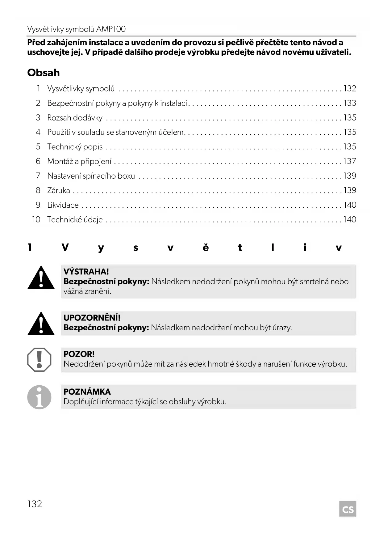 - Před zahájením instalace a uvedením do provozu si pečlivě přečtěte tento návod a uschovejte jej. V případě dalšího prodeje výrobku předejte návod novému uživateli. Obsah 1 Vysvětlivky symbolů p. 132